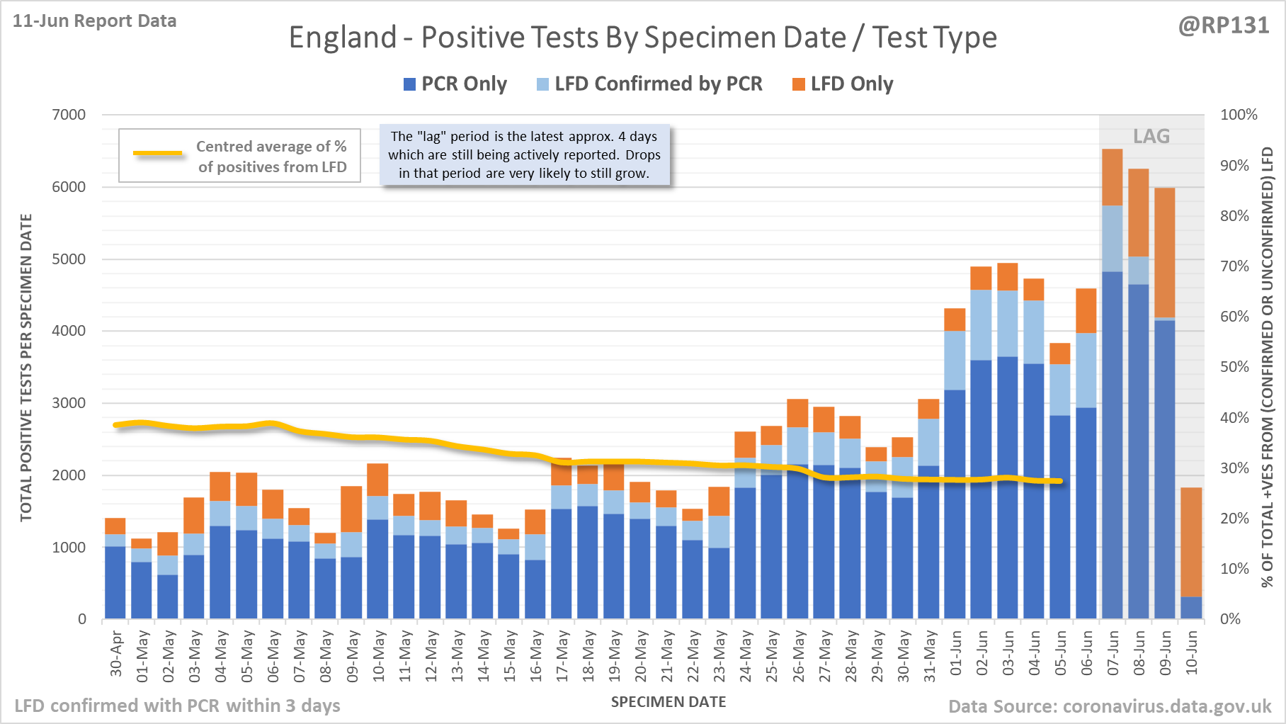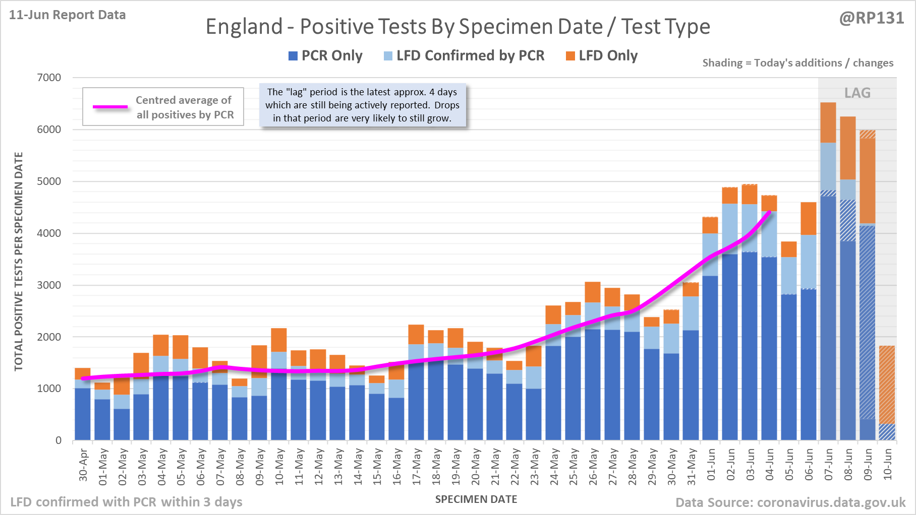 [1/13] 8,125 new #covid19uk positive tests reported today (11-Jun). Given increased use of LFD testing and fluctuations in daily report numbers, I think this is the best chart to lead with as it splits out the test type and has a rolling average of PCR positives by specimen date.