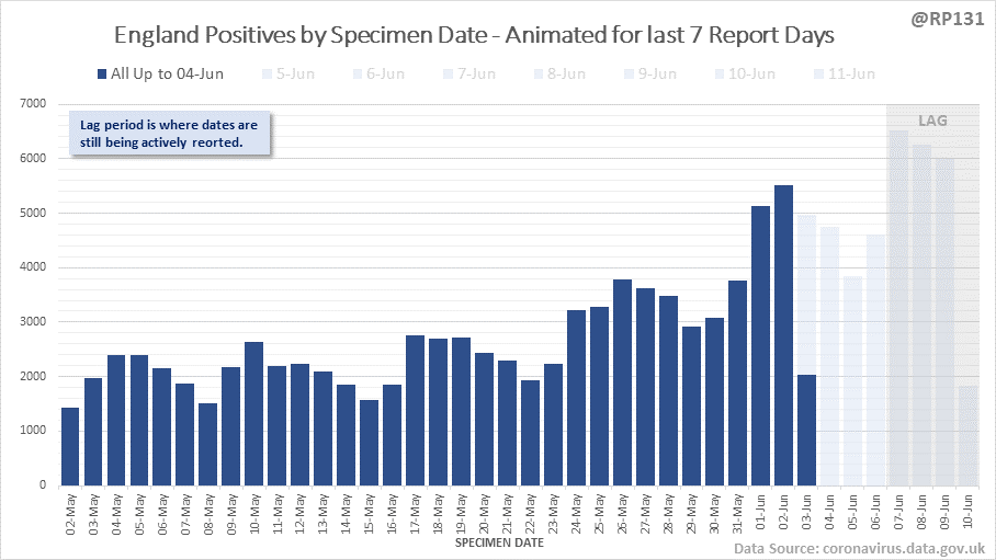 [10/13] Animated chart to show how the #covid19uk positive tests by specimen date have been contributed to by reports over the last 7 days. Note this just includes England numbers as other nations don't always publish their specimen date numbers every day.