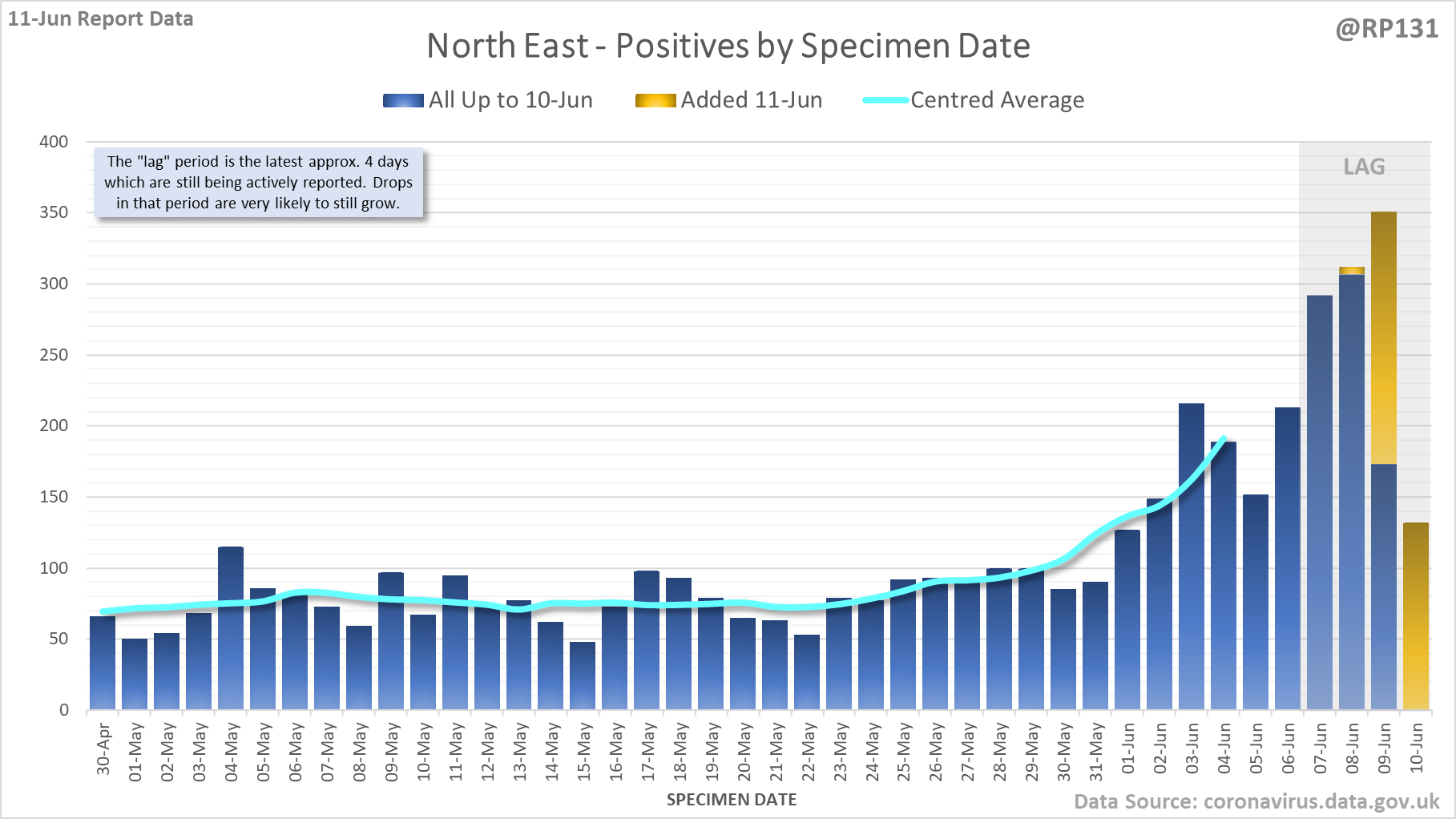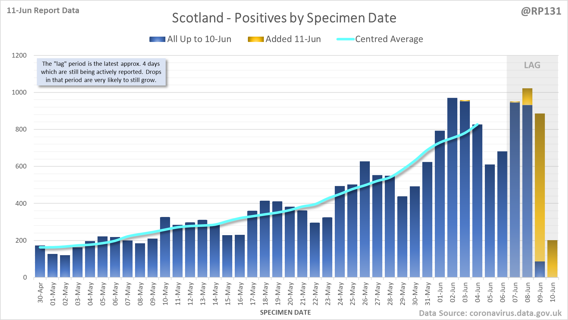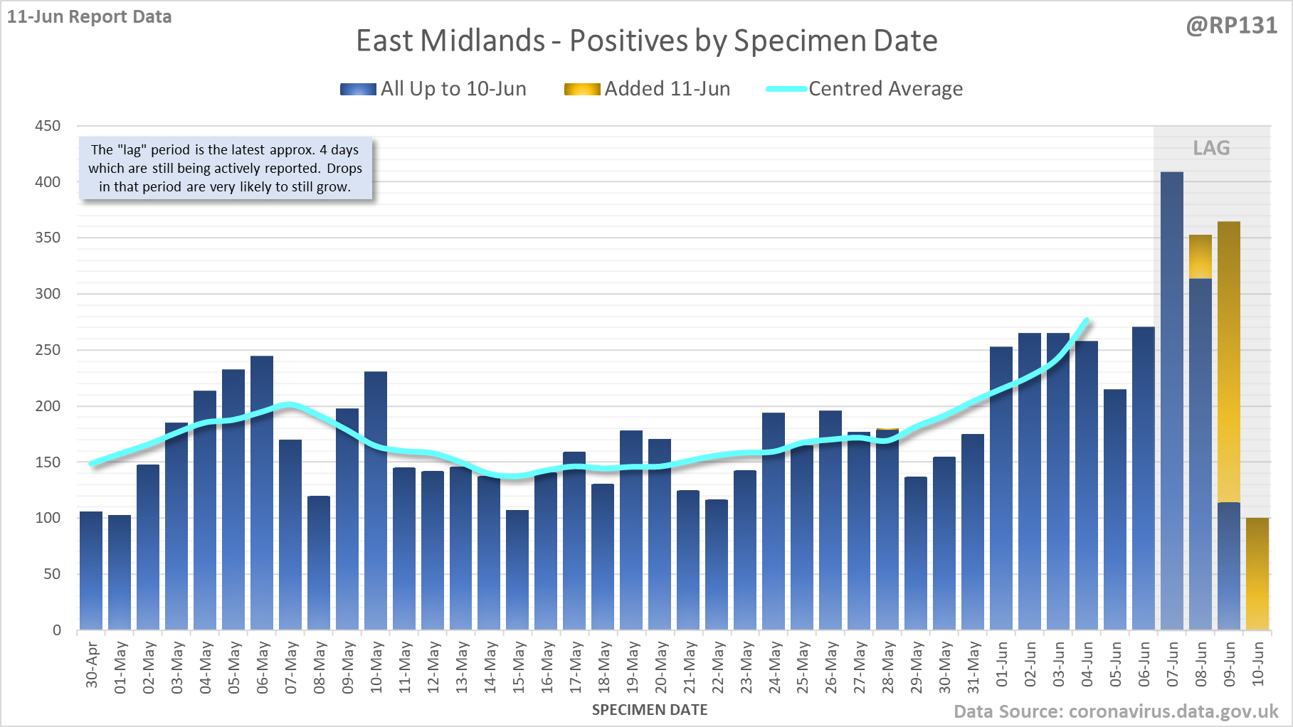 [8/13] Closer look at the latest 45 days, with today's added numbers highlighted in yellow. Individual nations and animated England charts further down the thread.