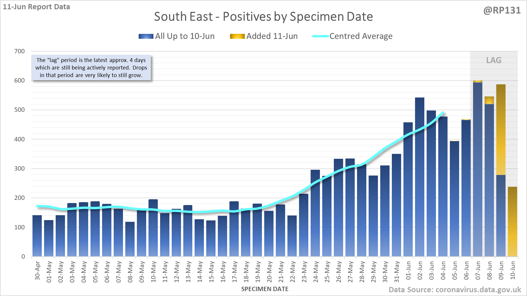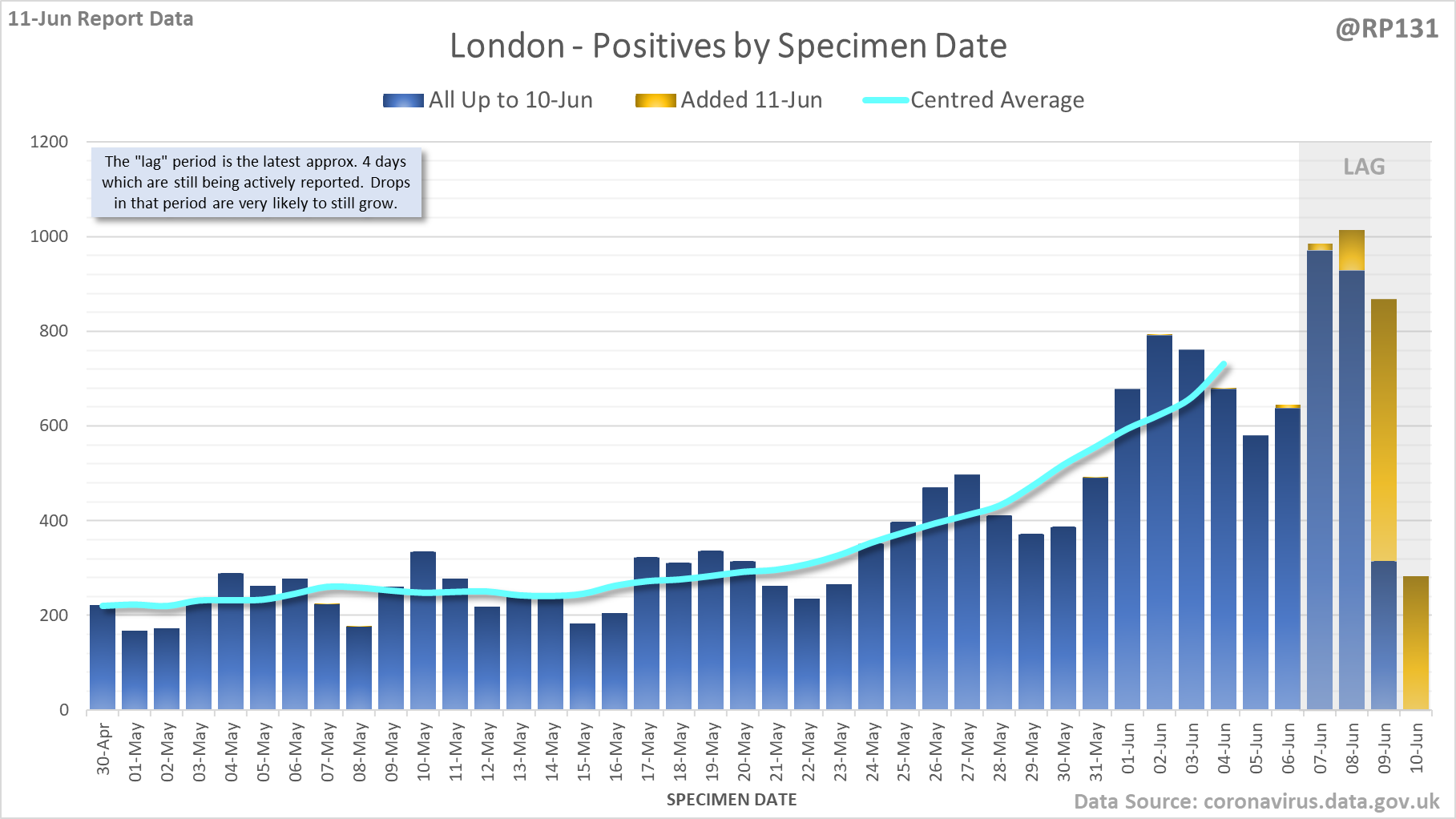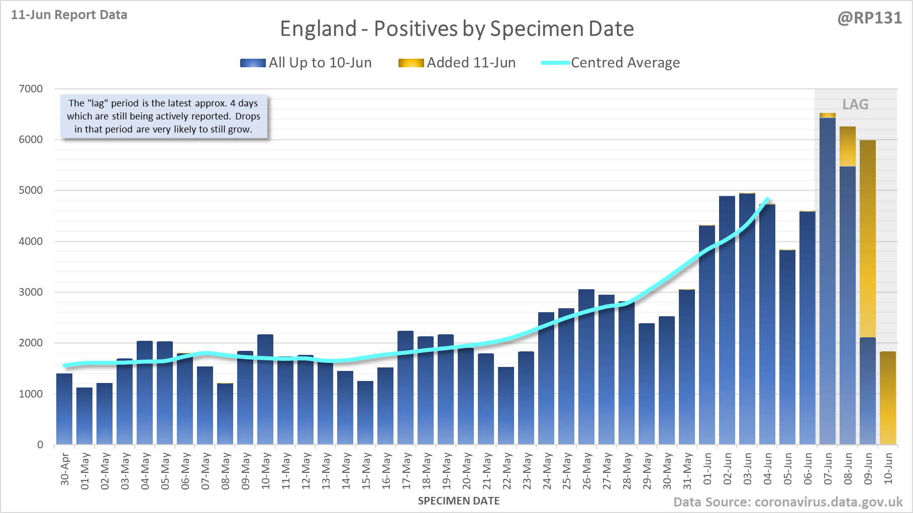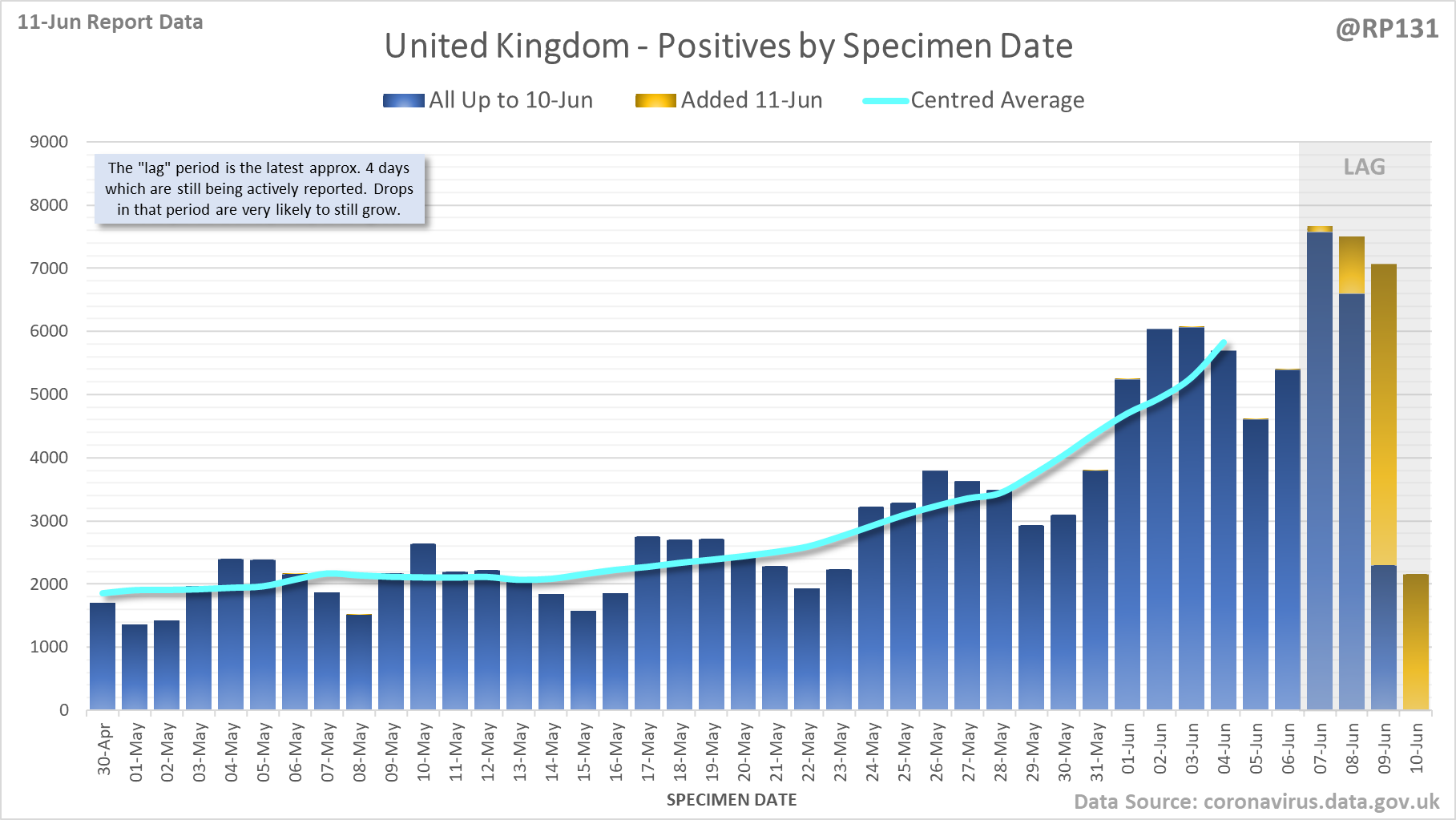 [6/13] Longer term view. 8,125 new #covid19uk positive tests reported today (11-Jun). This brings the rolling average by specimen date (allowing 4 days for lag) to 5,268, an increase of 1917 (57%) in the last week.