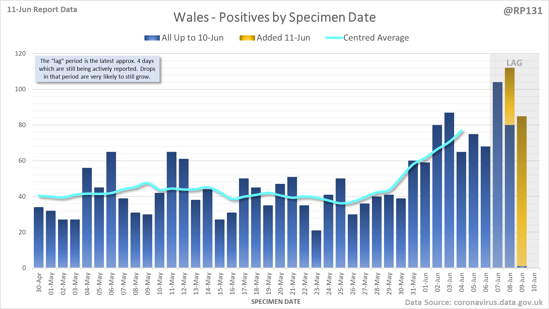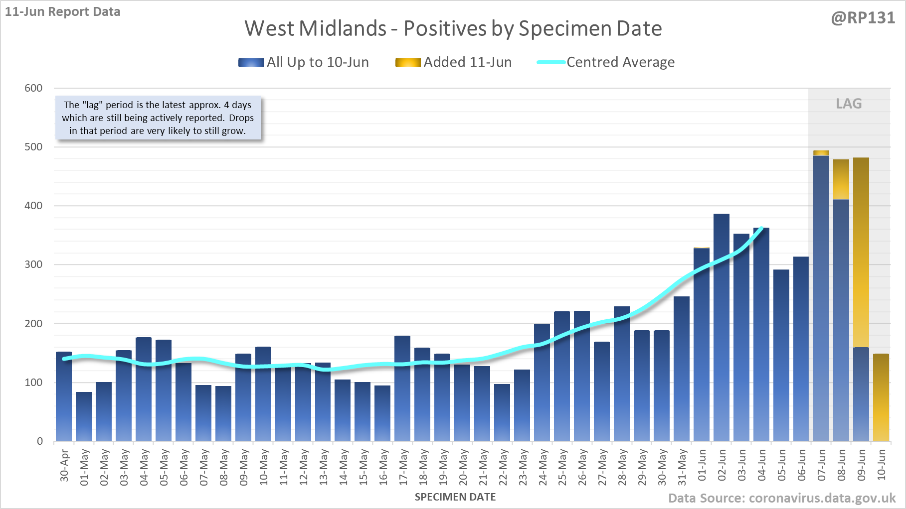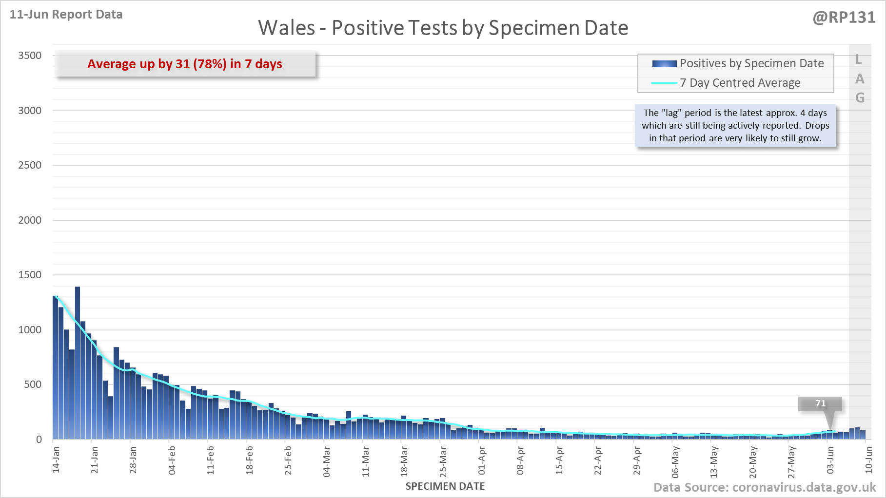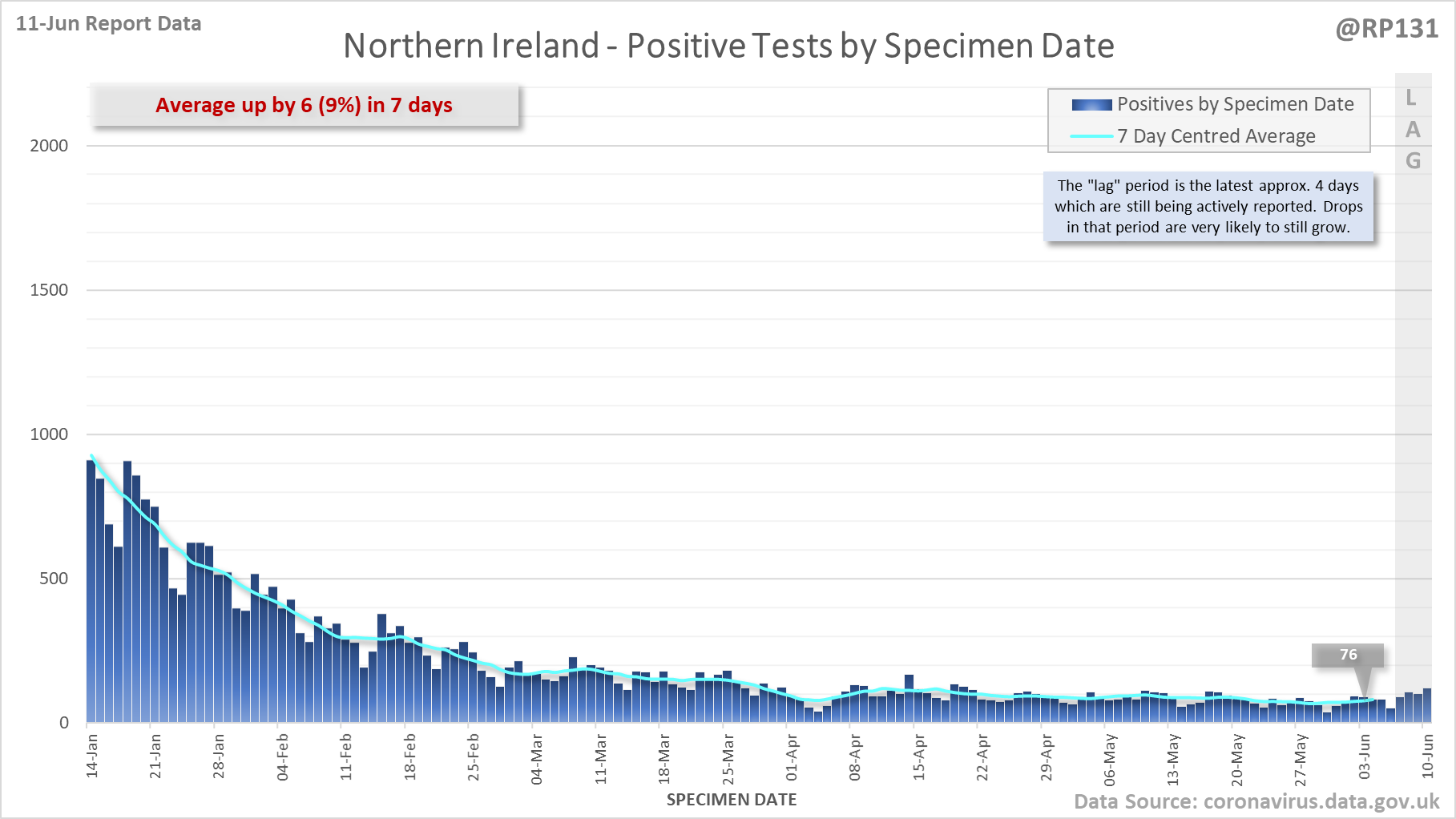 [6/13] Longer term view. 8,125 new #covid19uk positive tests reported today (11-Jun). This brings the rolling average by specimen date (allowing 4 days for lag) to 5,268, an increase of 1917 (57%) in the last week.