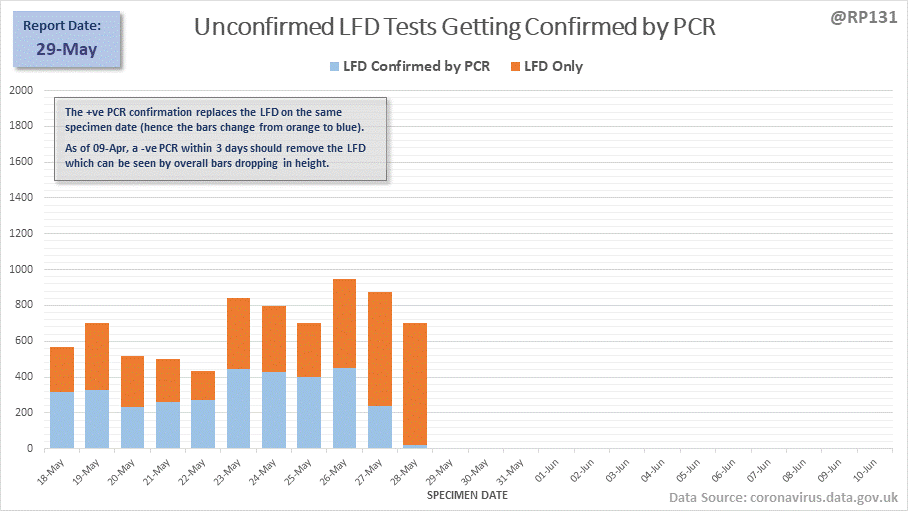[2/13] Animated chart to show LFD-only positives being either converted into PCR confirmed positives or removed due to negattive confirmation, over the last 14 days of reports.