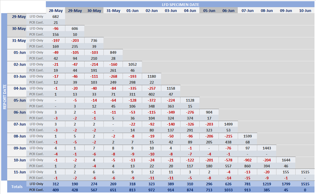 [3/13] Pivot table of daily changes to LFD Only and LFD Confirmed by PCR figures to see if we can identify where LFDs are now being removed due to negative follow-up PCRs.