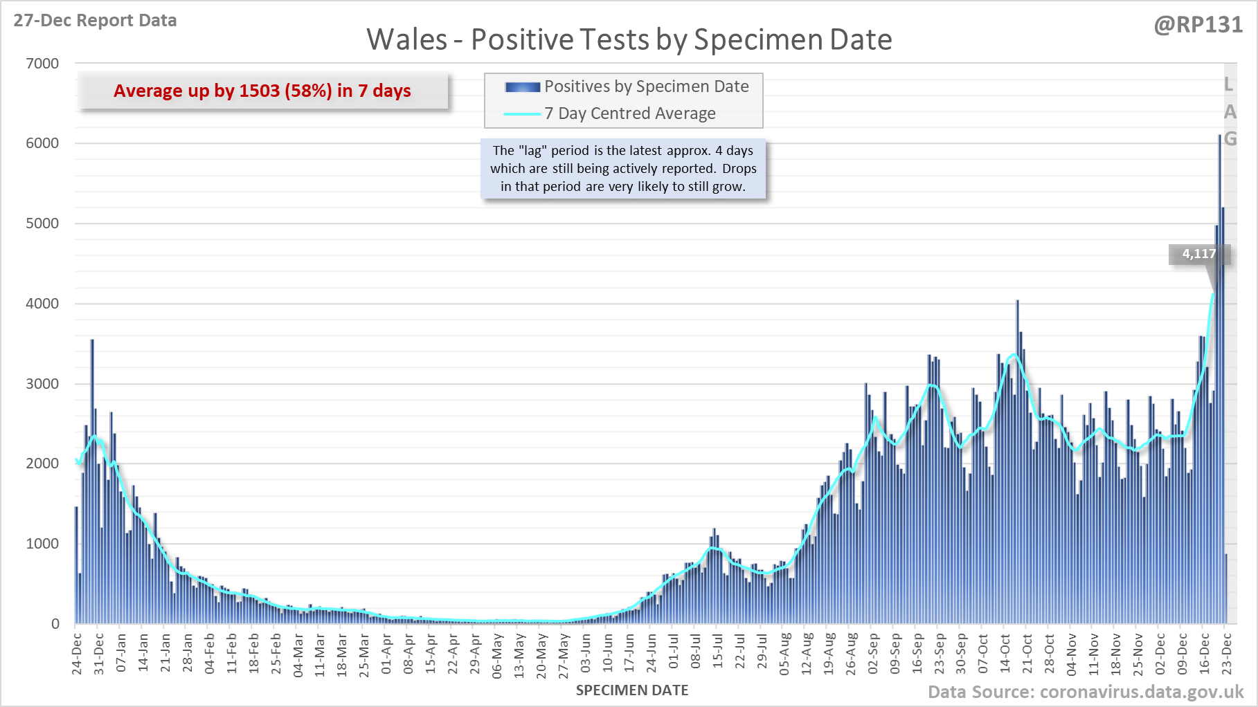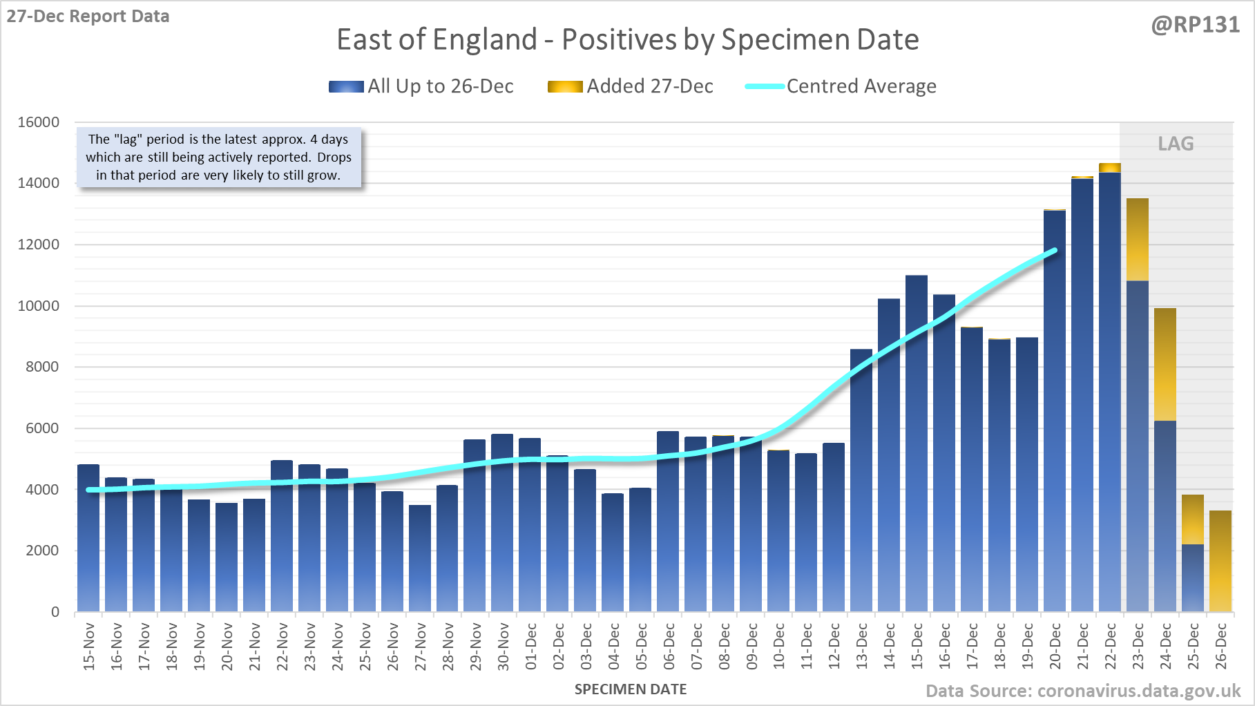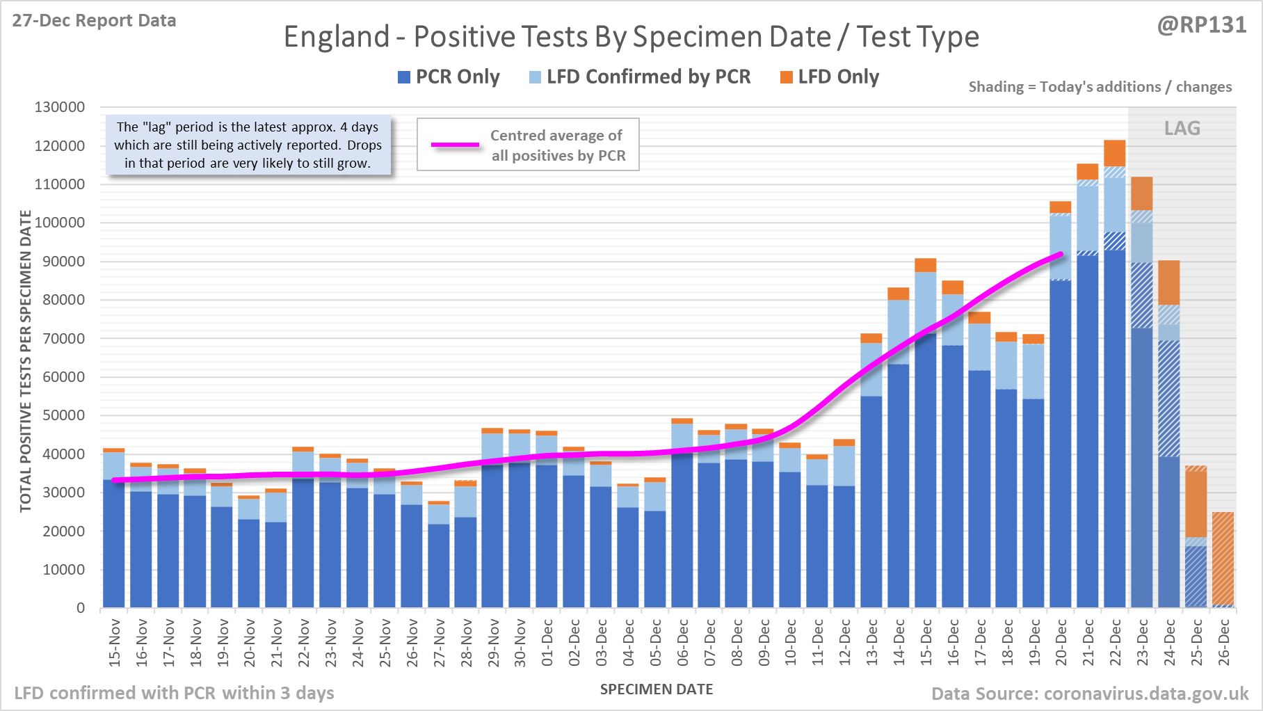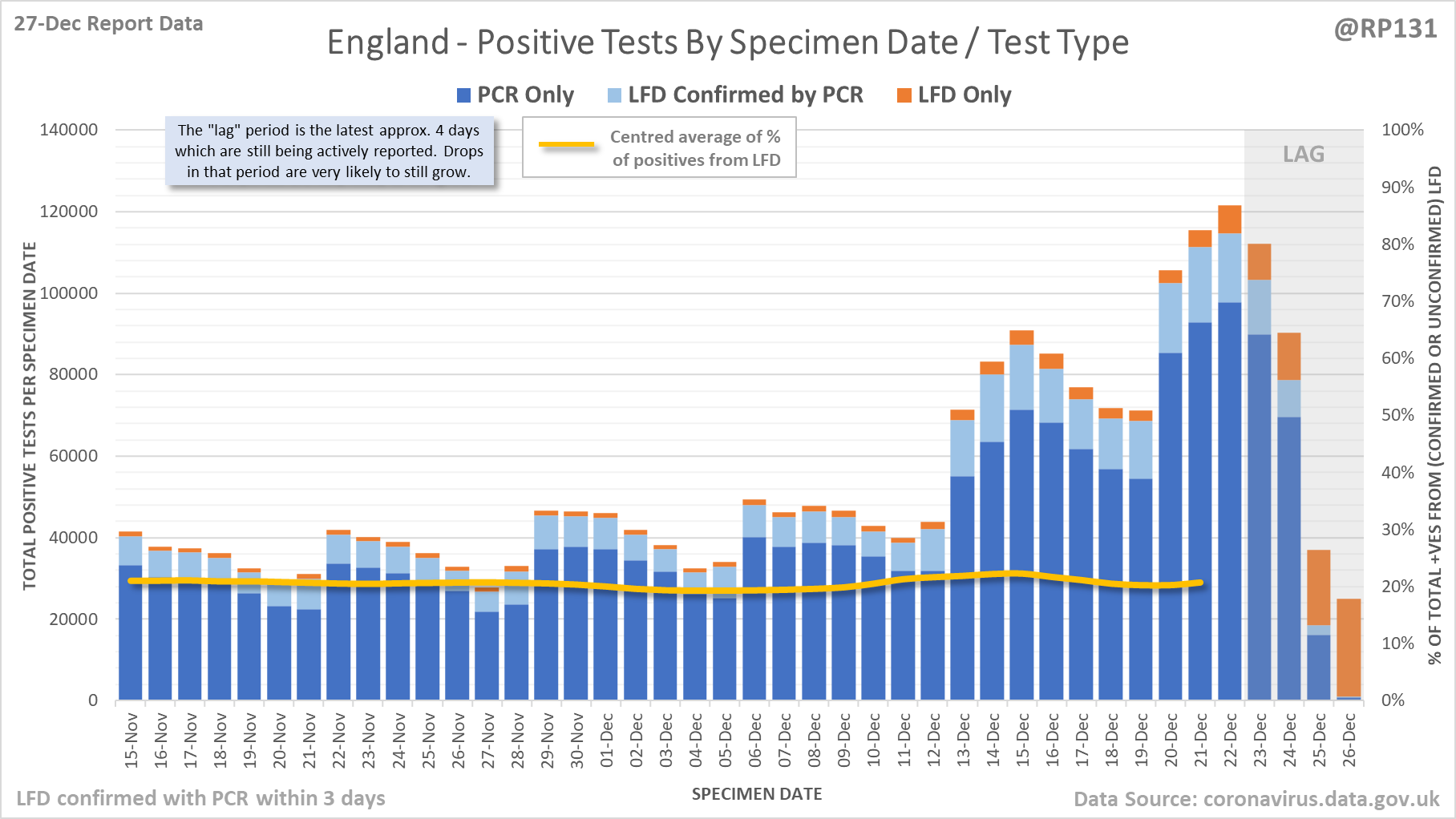 No point doing week-on-week comparisons as everything going to be inconsistent for a while. Very large number of day-1 lateral flow positives today (24,010) and likely to be big lags in PCR data. Give it a few days!