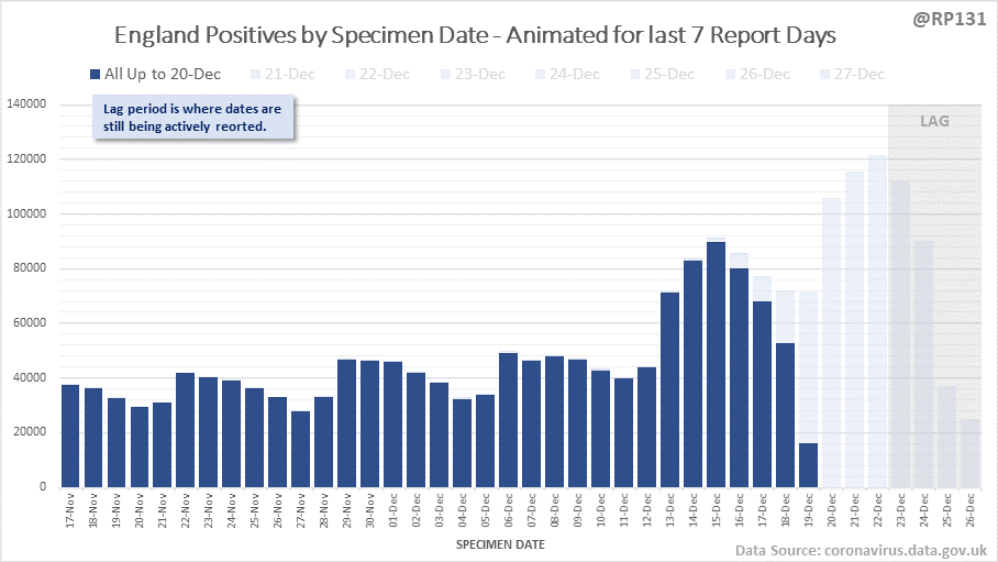 [10/13] Animated chart to show how the #covid19uk positive tests by specimen date have been contributed to by reports over the last 7 days. Note this just includes England numbers as other nations don't always publish their specimen date numbers every day.