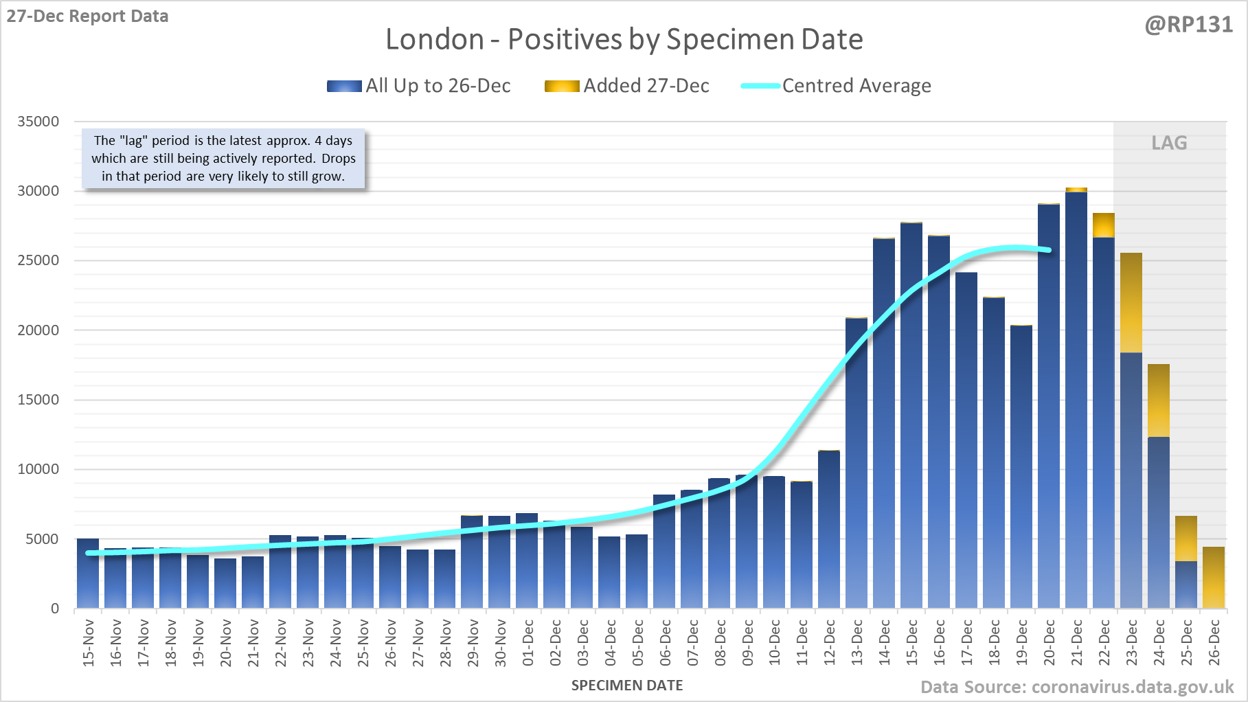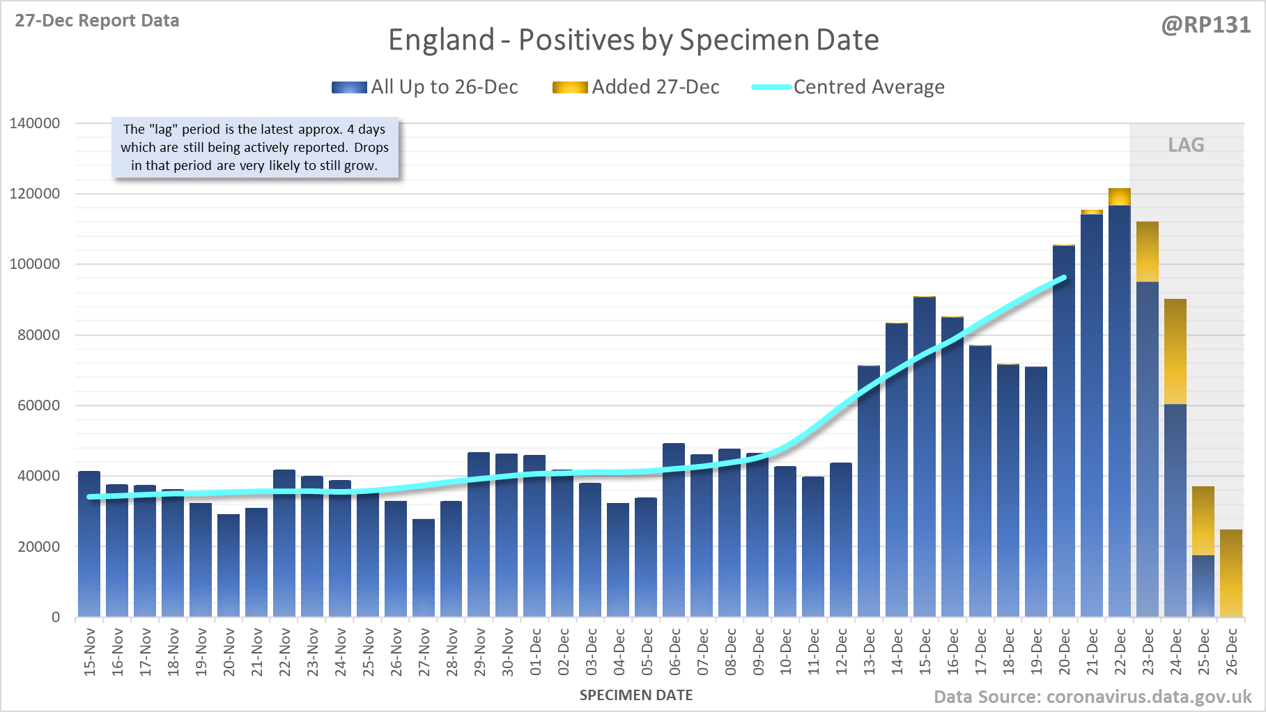 [6/13] Longer term view. 98,515 new #covid19uk positive tests reported today (27-Dec). This brings the rolling average by specimen date (allowing 4 days for lag) to 104,958, an increase of 36018 (52%) in the last week.