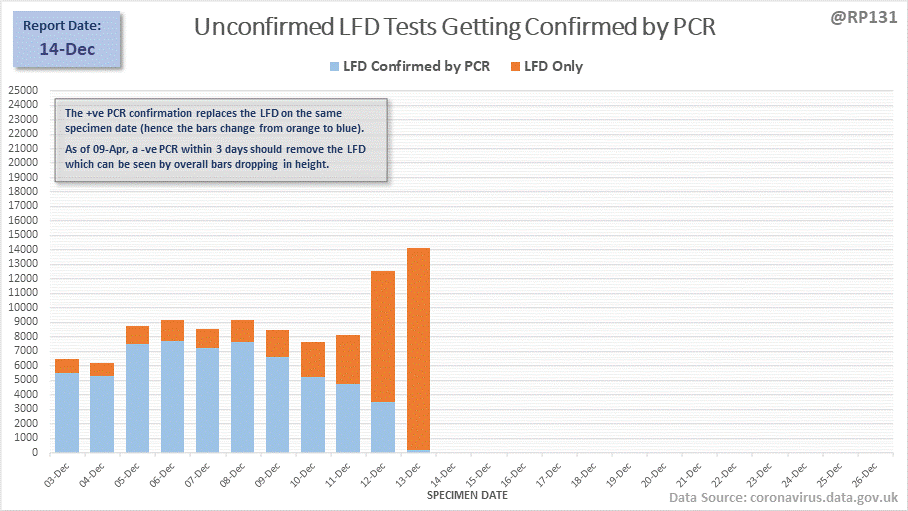 [2/13] Animated chart to show LFD-only positives being either converted into PCR confirmed positives or removed due to negattive confirmation, over the last 14 days of reports.