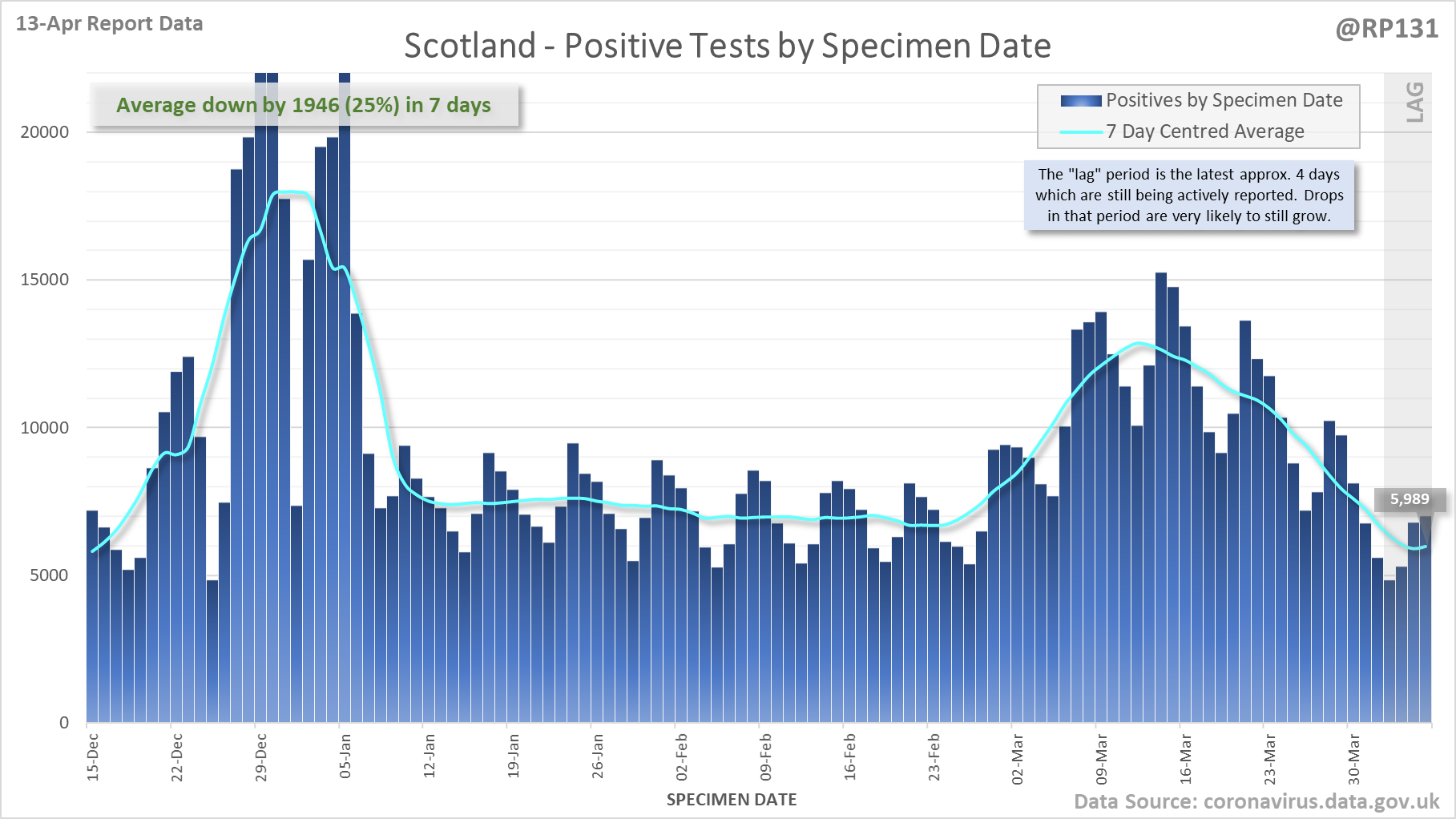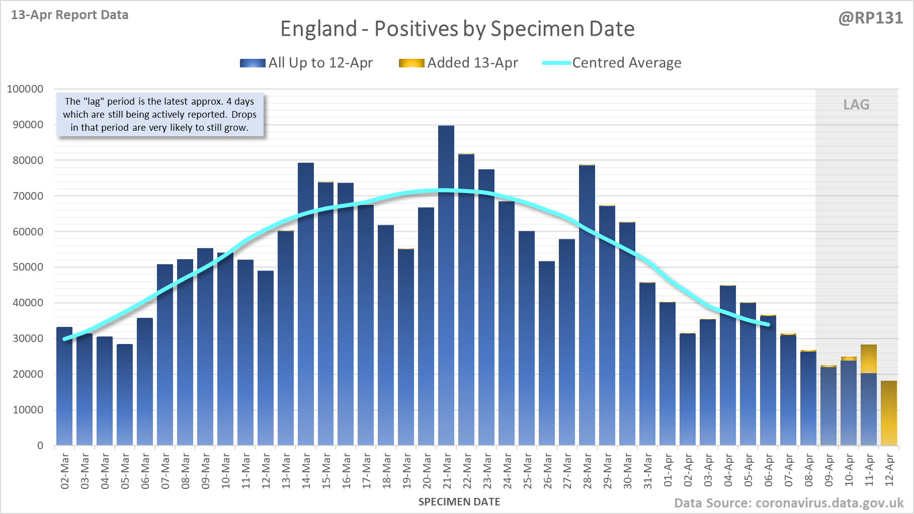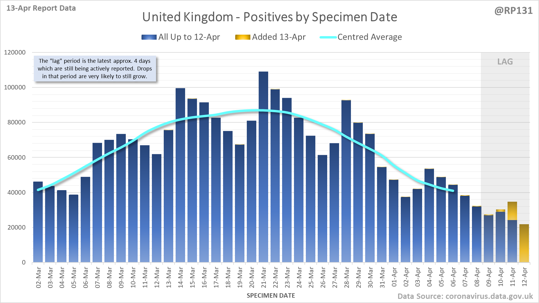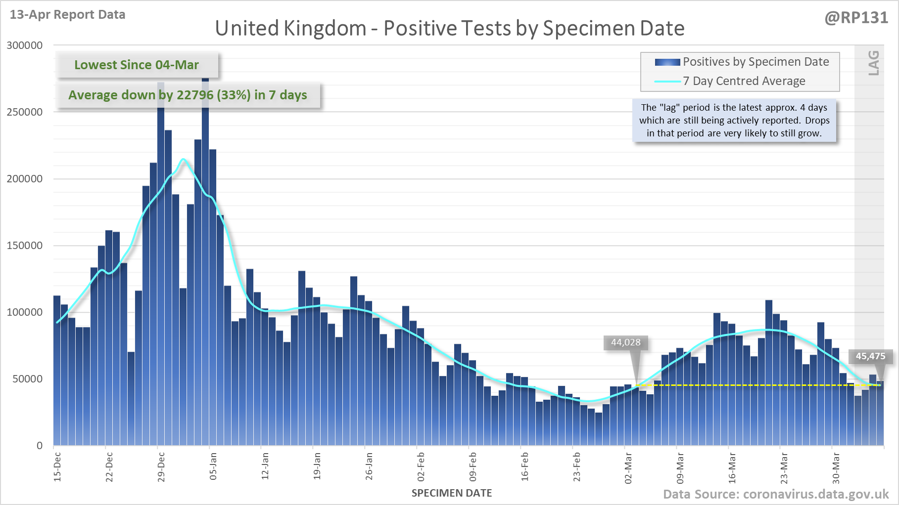 [7/14] Longer term view. 35,926 new #covid19uk positive tests reported today (13-Apr). This brings the rolling average by specimen date (allowing 4 days for lag) to 45,475, equivalent to around 04-Mar (i.e. 33 days ago), a reduction of 22796 (33%) in the last week.