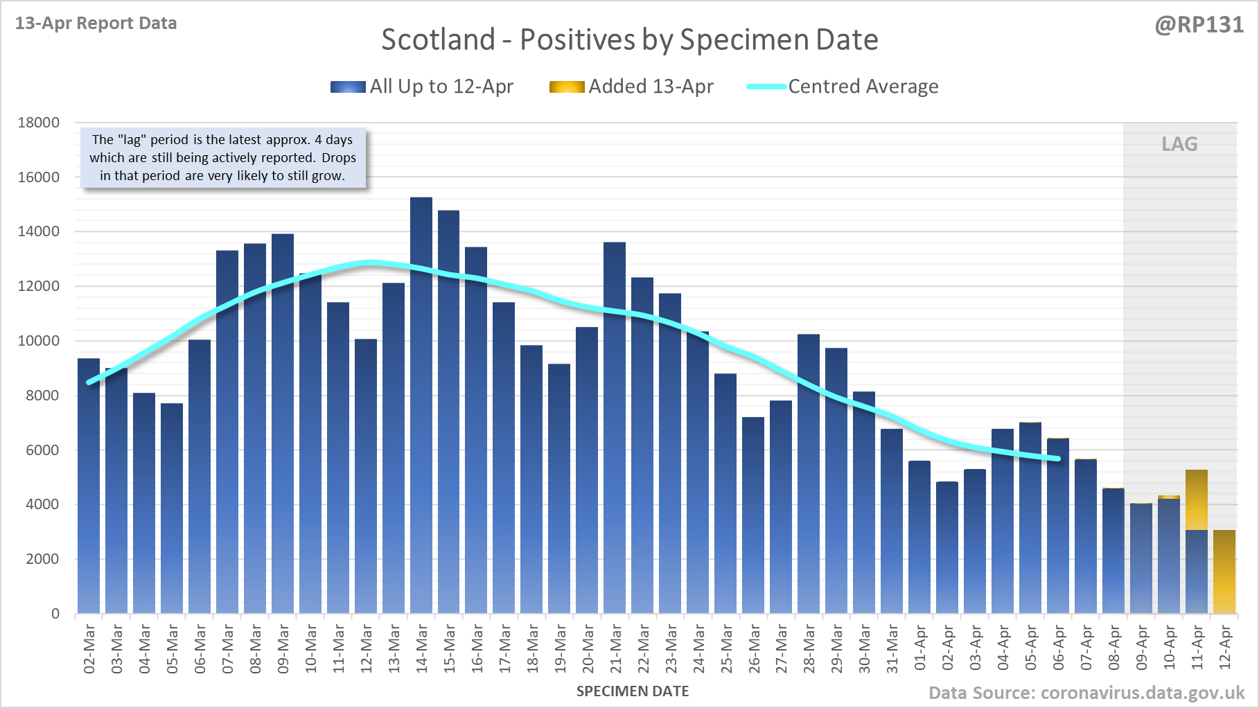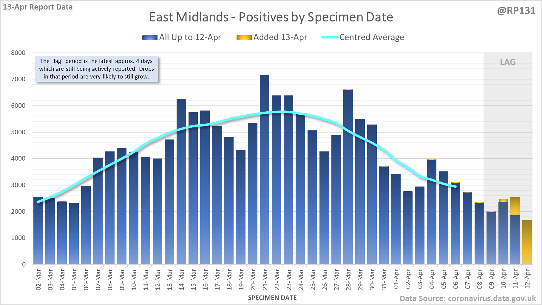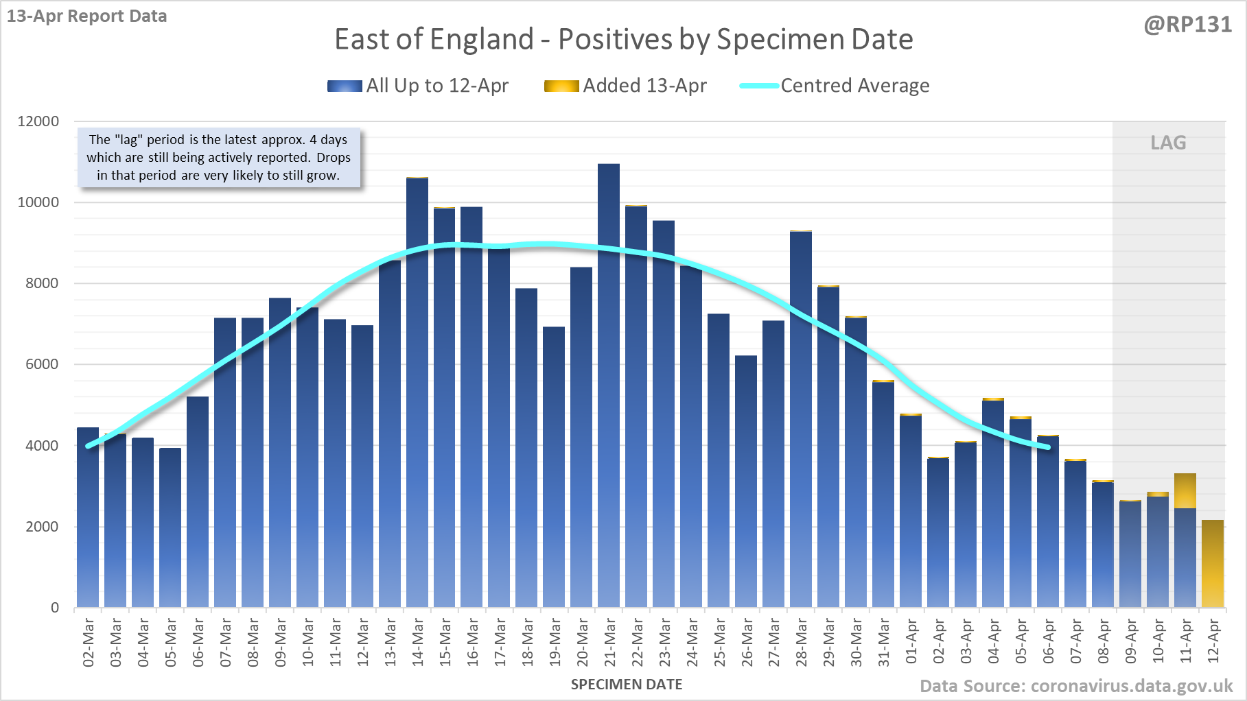 [7/14] Longer term view. 35,926 new #covid19uk positive tests reported today (13-Apr). This brings the rolling average by specimen date (allowing 4 days for lag) to 45,475, equivalent to around 04-Mar (i.e. 33 days ago), a reduction of 22796 (33%) in the last week.