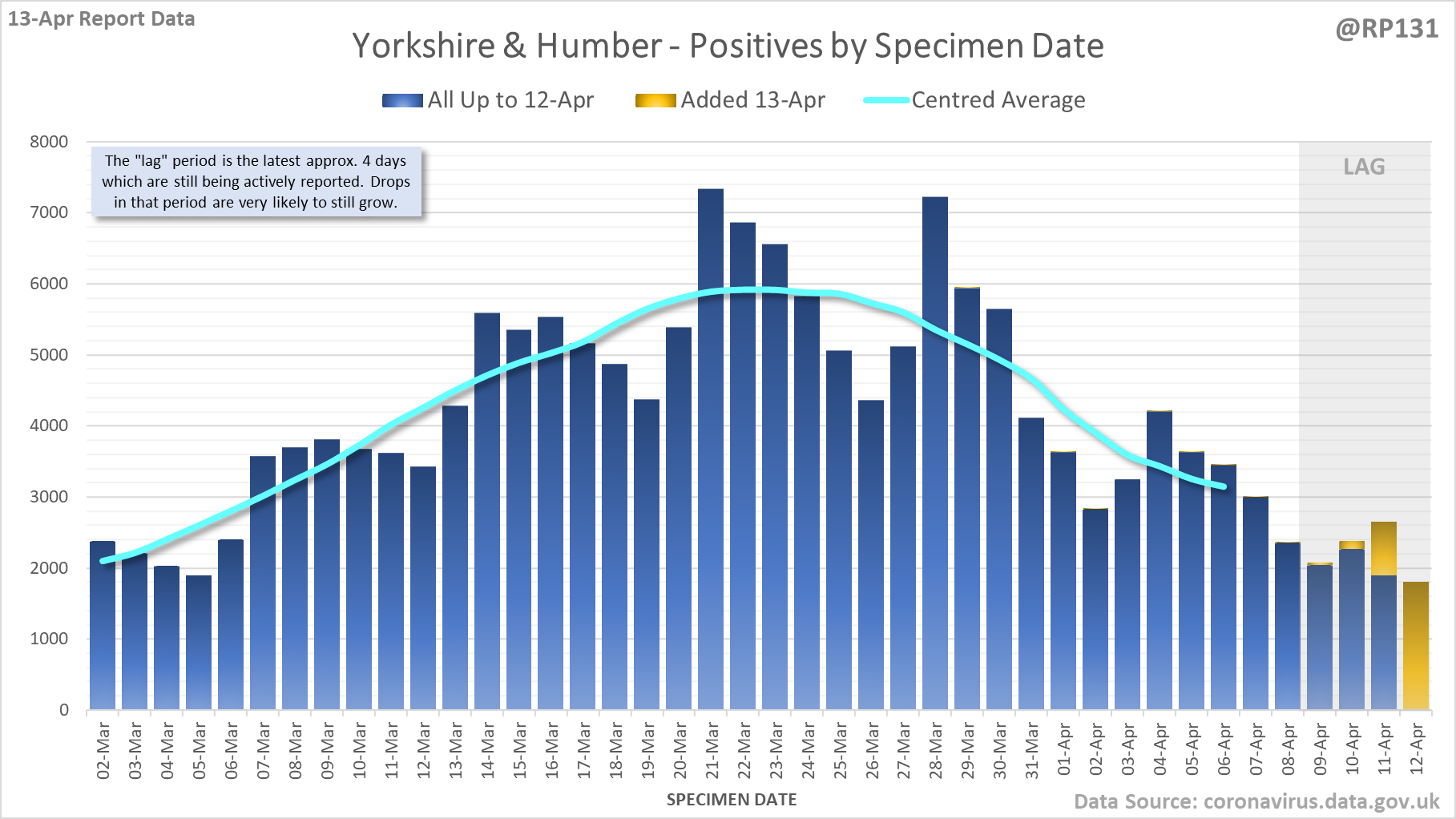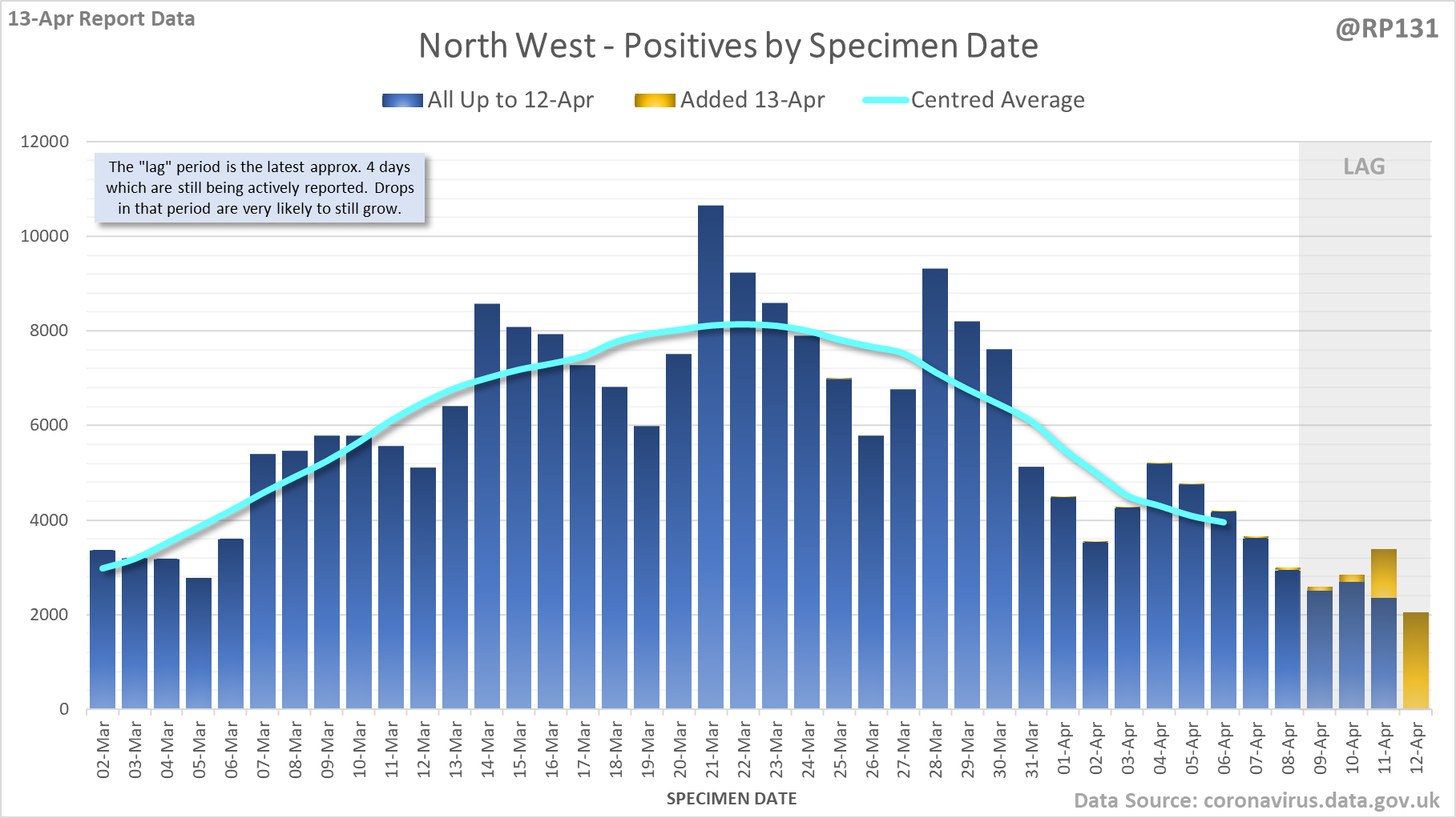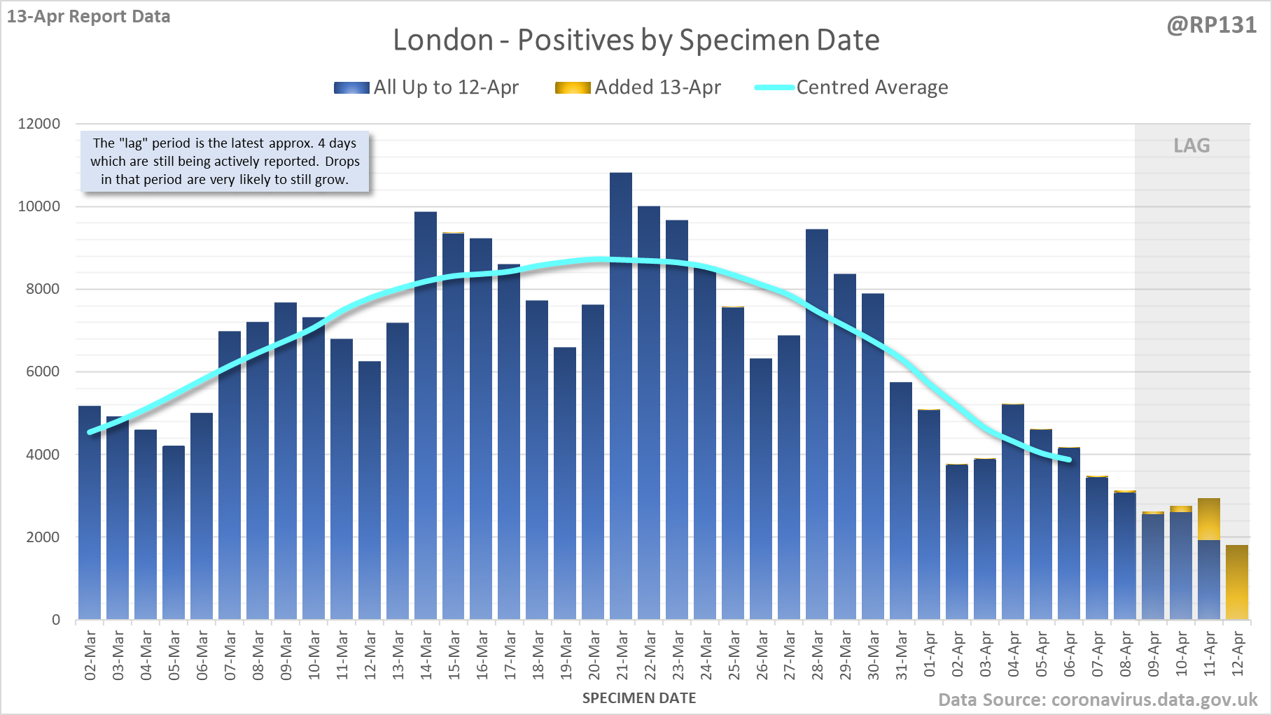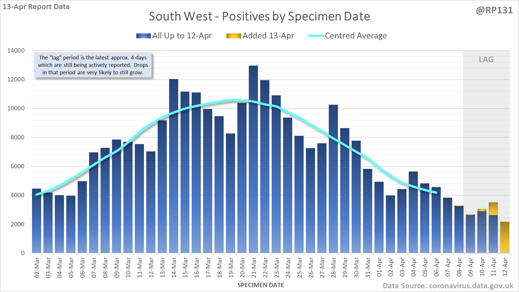 [7/14] Longer term view. 35,926 new #covid19uk positive tests reported today (13-Apr). This brings the rolling average by specimen date (allowing 4 days for lag) to 45,475, equivalent to around 04-Mar (i.e. 33 days ago), a reduction of 22796 (33%) in the last week.