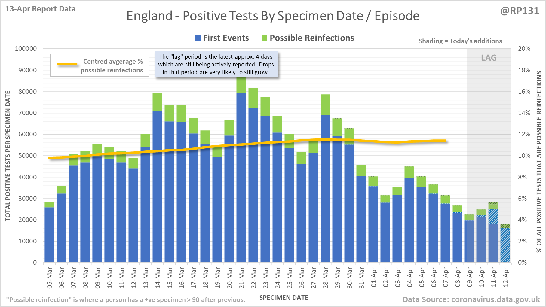 [2/14] Chart to show England positive tests (as of 13-Apr) by breakdown of first infection events and possible reinfection events.