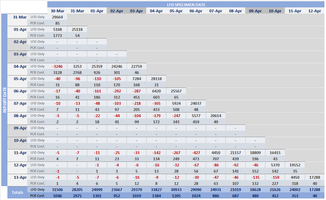 [4/14] Pivot table of daily changes to LFD Only and LFD Confirmed by PCR figures to see if we can identify where LFDs are now being removed due to negative follow-up PCRs.