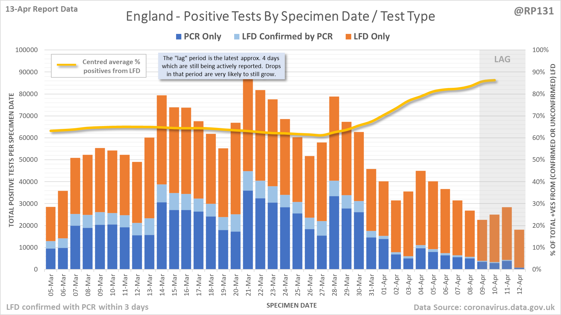 [5/14] England positive tests by type of test used. Version with the rolling average percentage of tests from LFD.