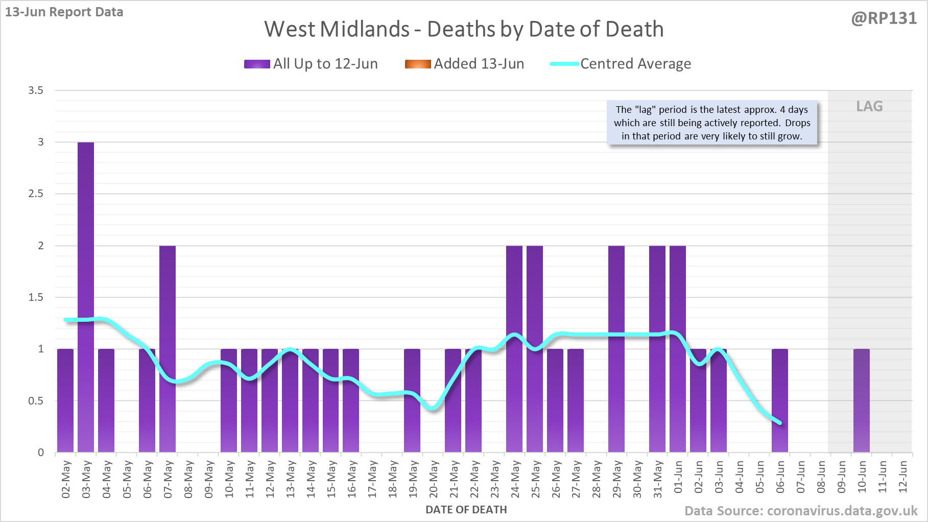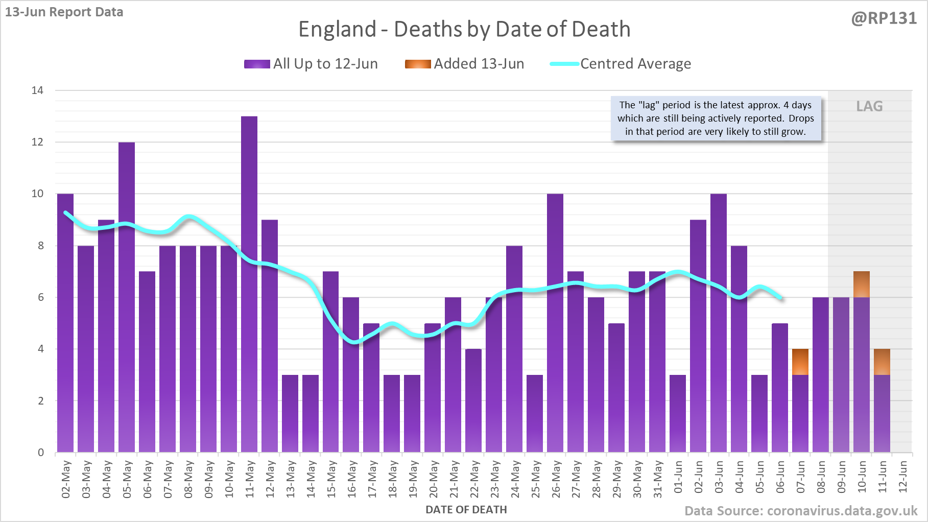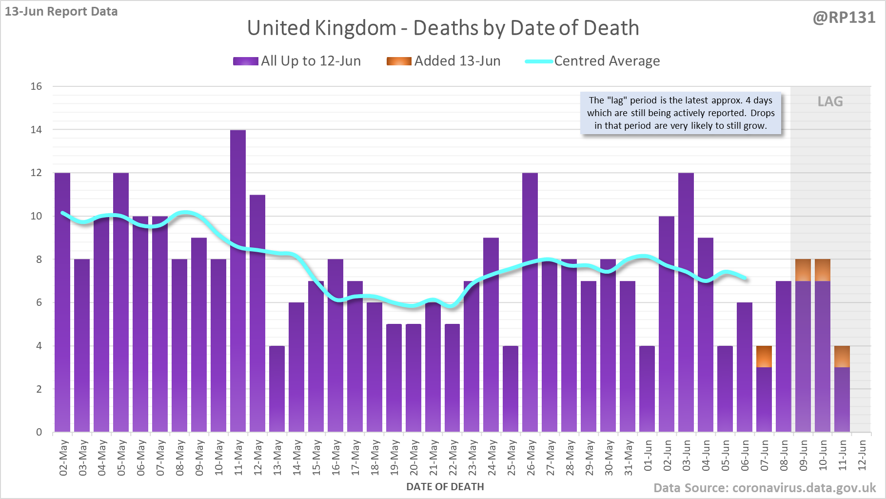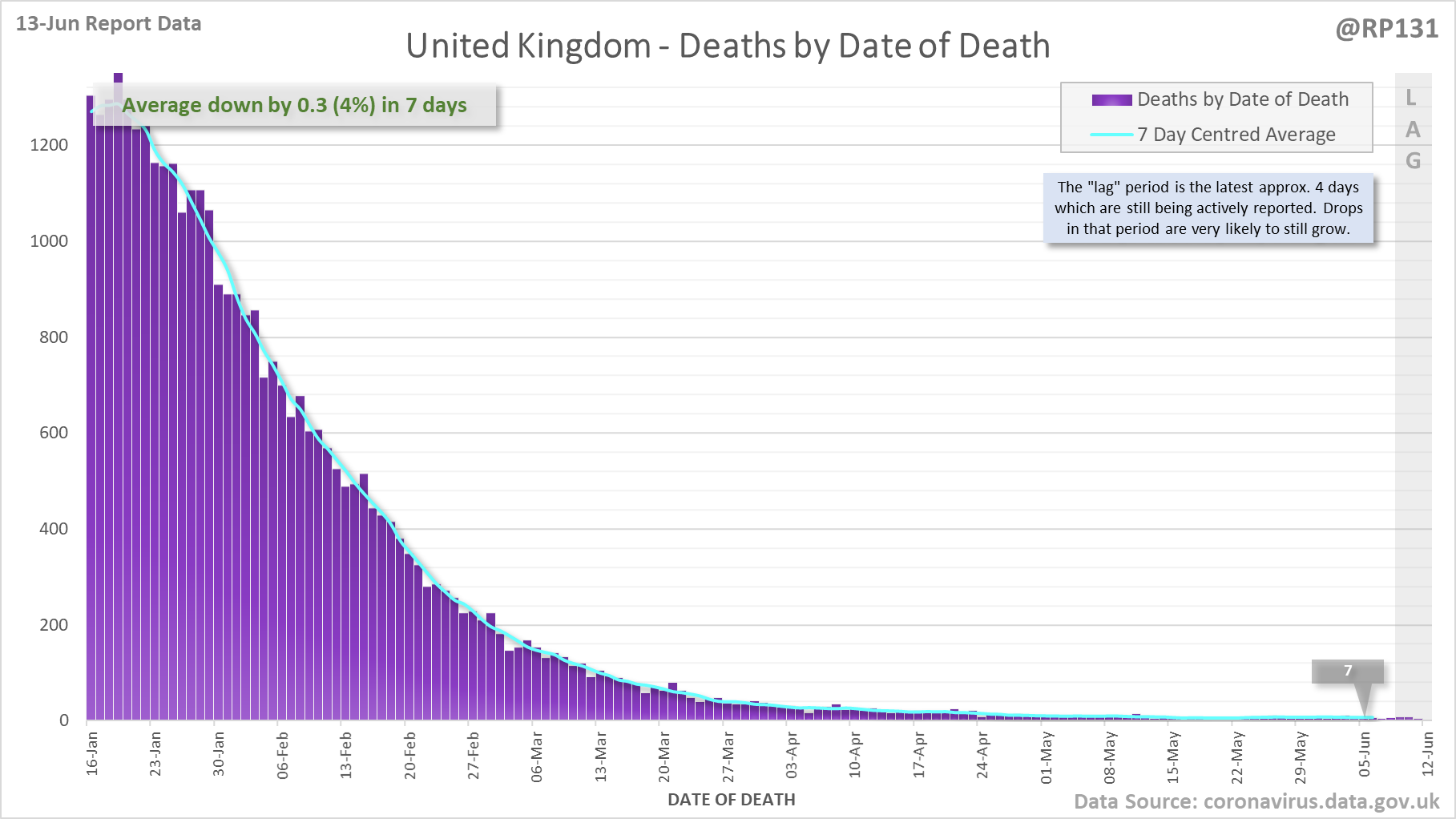 [1/7] 8 new #covid19uk deaths reported today (13-Jun). This brings the rolling average by date of death (allowing 4 days for lag) to 7, a reduction of 0.3 (3.7%) in the last week.