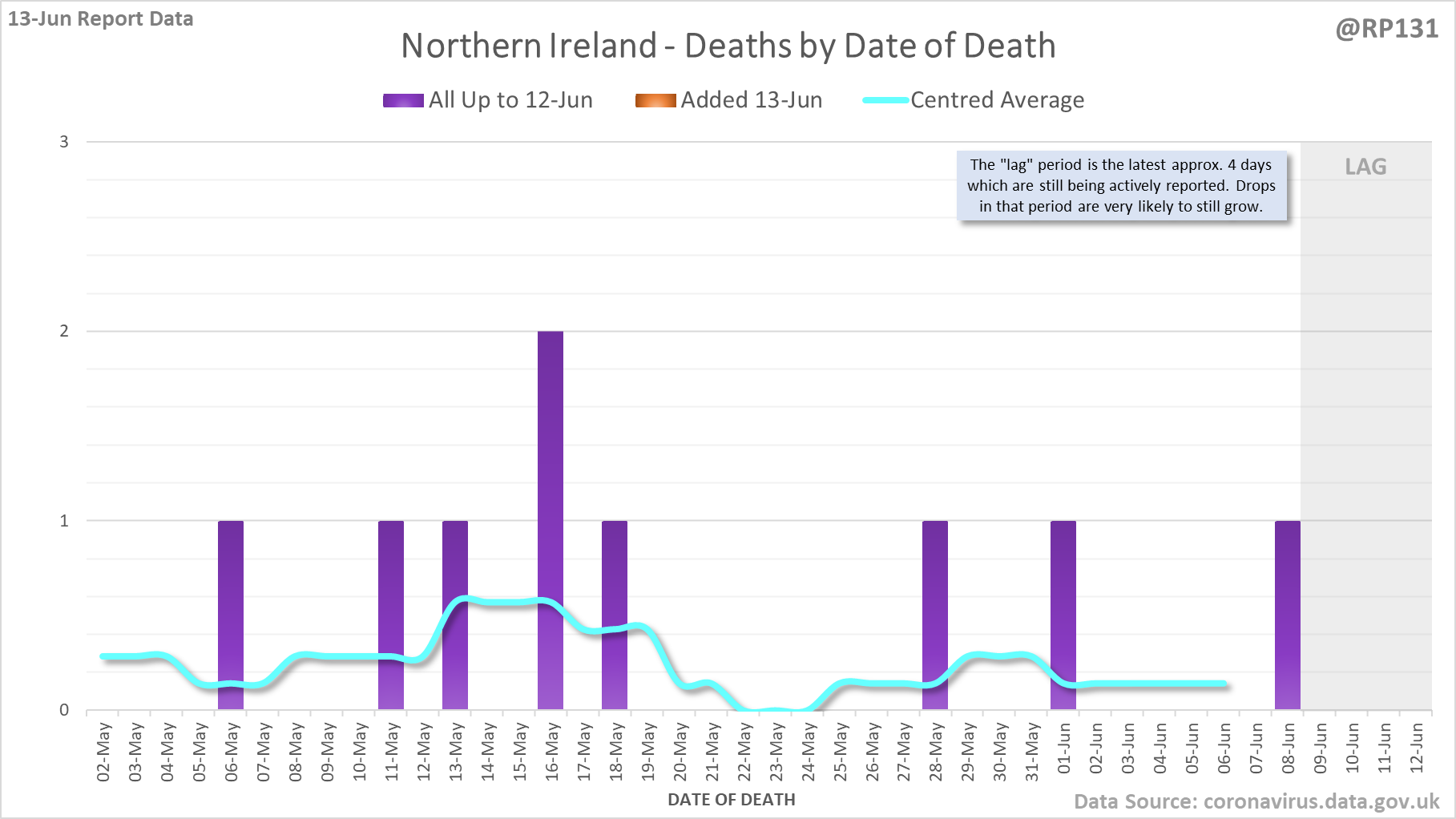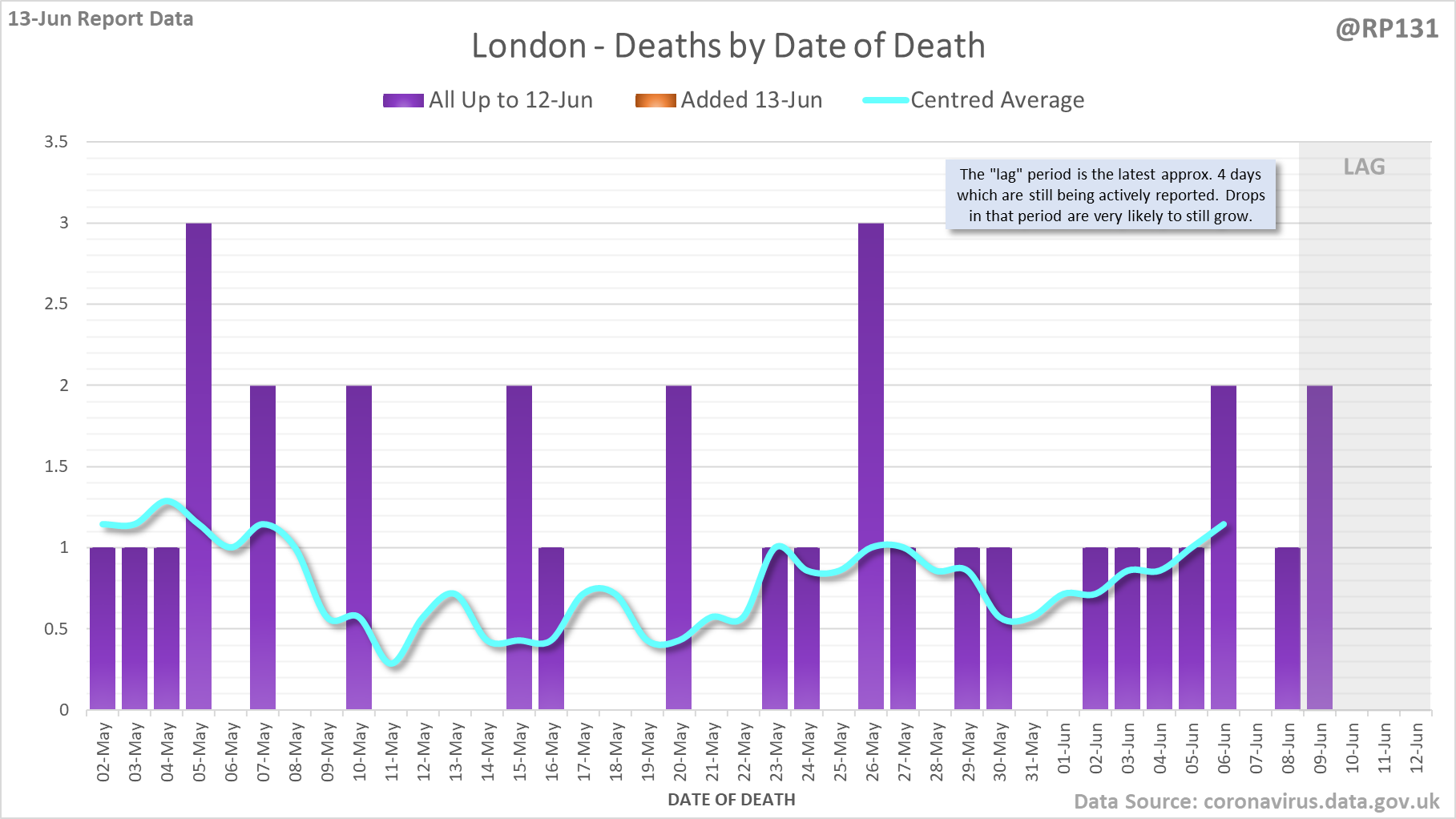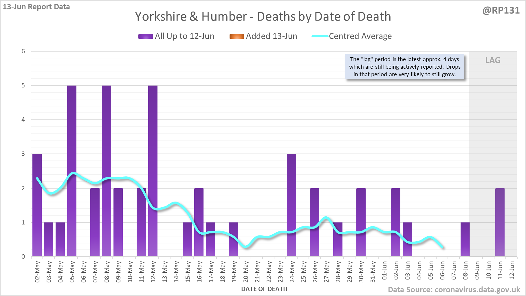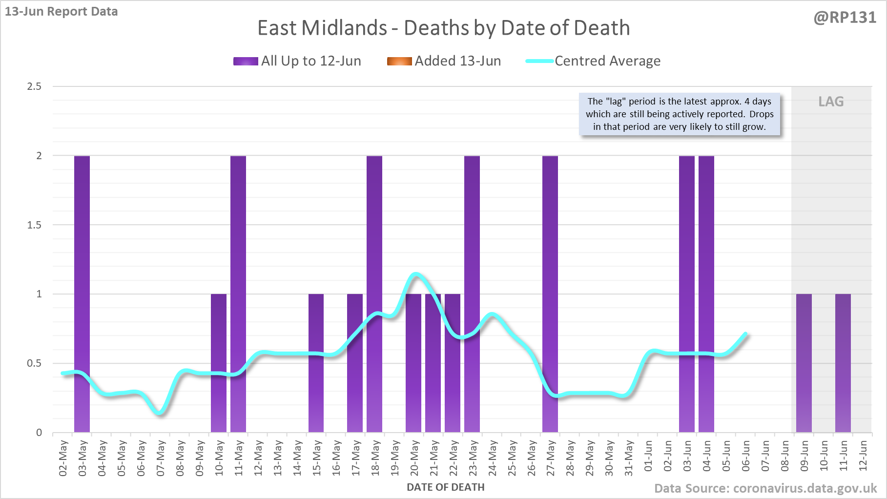 [1/7] 8 new #covid19uk deaths reported today (13-Jun). This brings the rolling average by date of death (allowing 4 days for lag) to 7, a reduction of 0.3 (3.7%) in the last week.