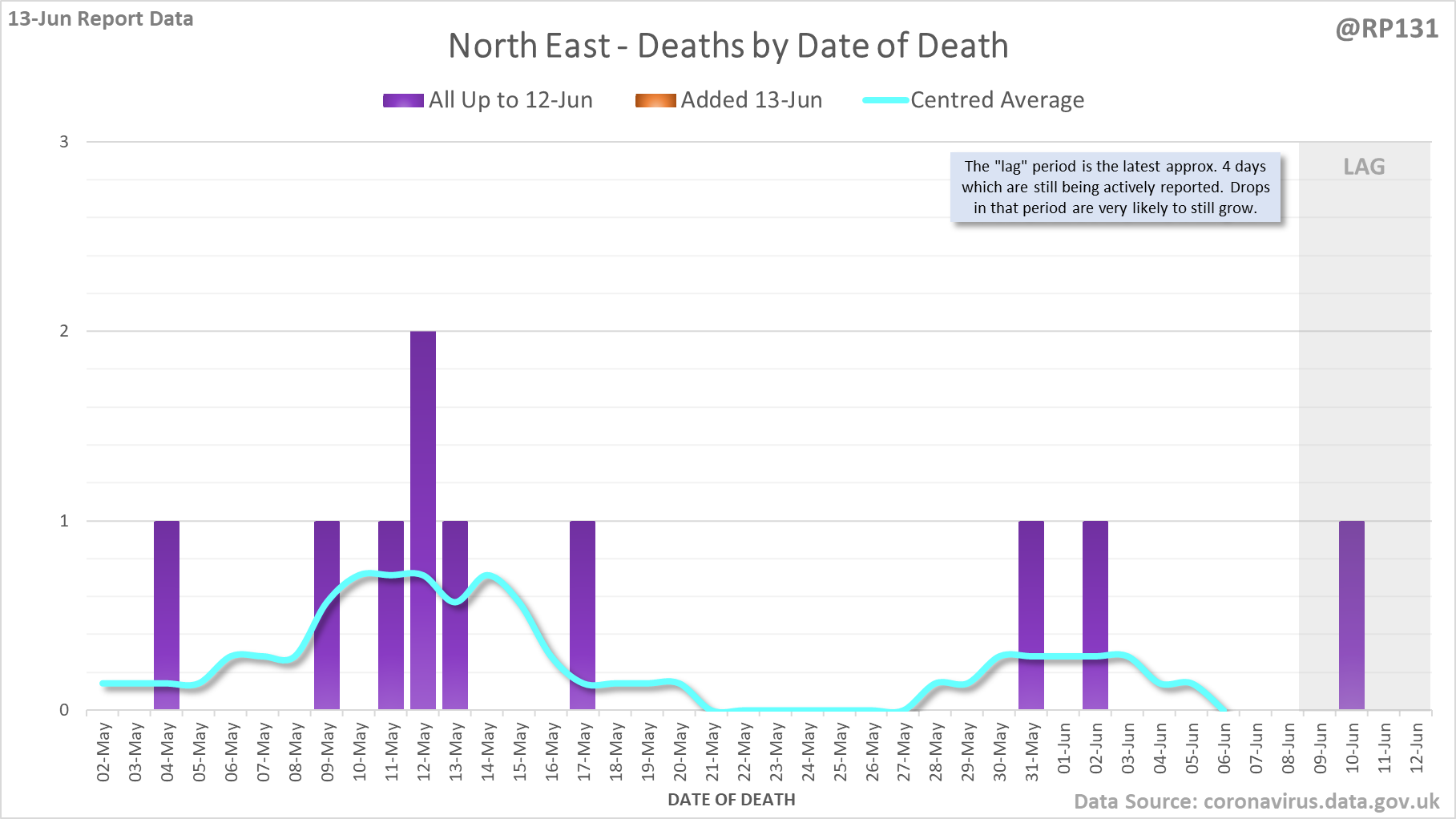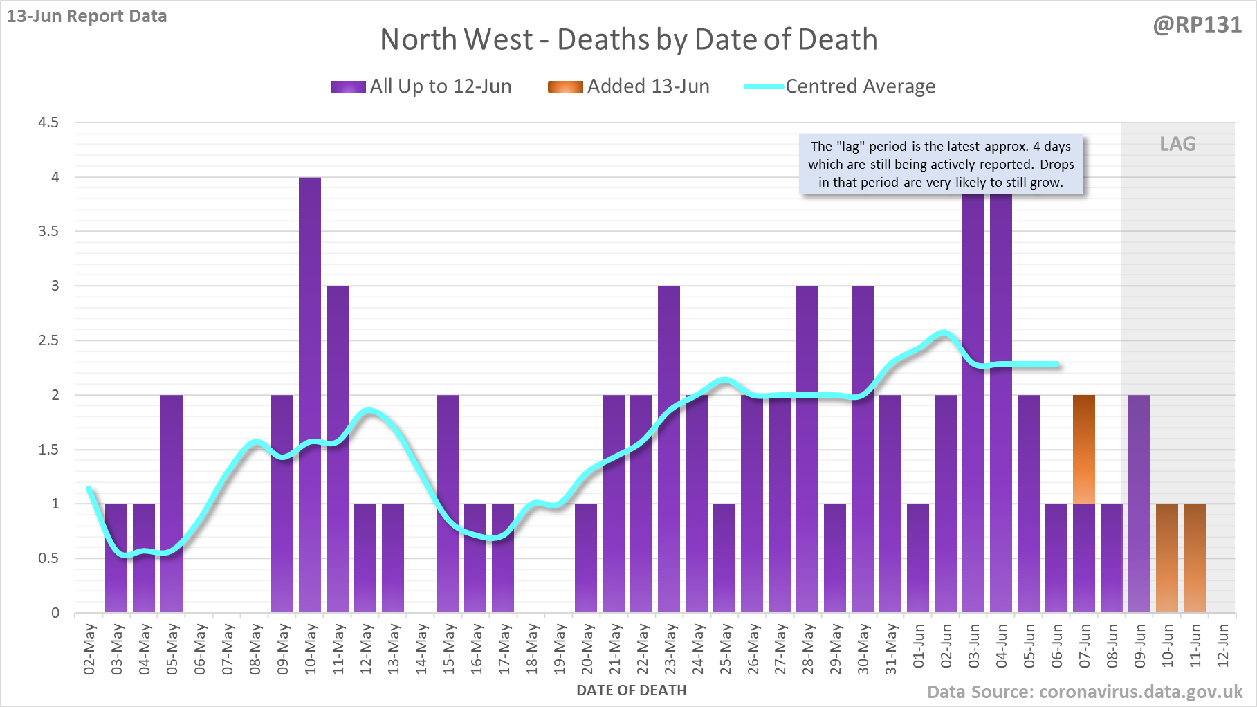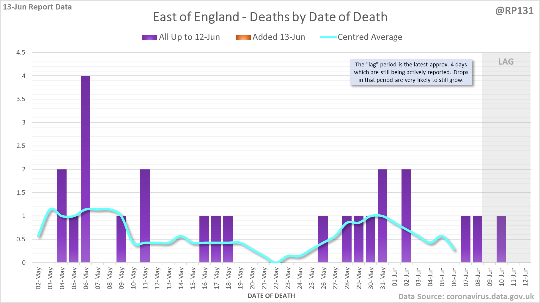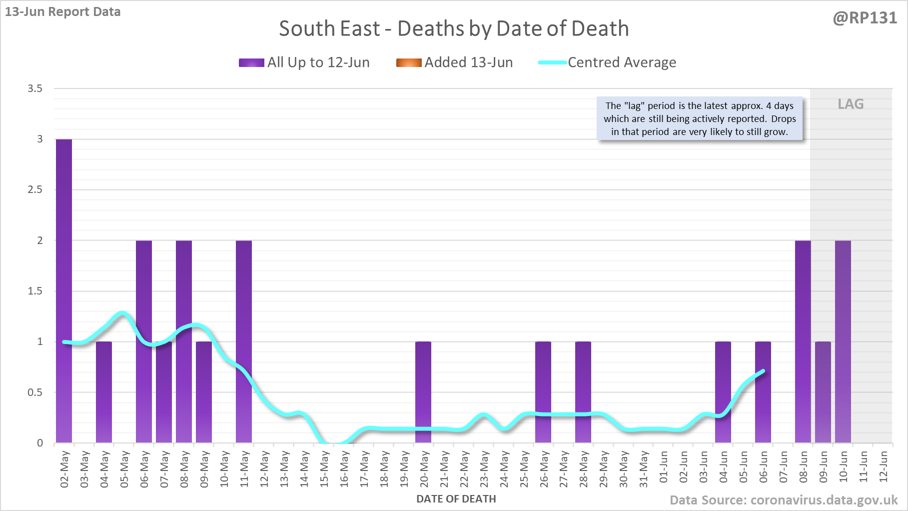 [1/7] 8 new #covid19uk deaths reported today (13-Jun). This brings the rolling average by date of death (allowing 4 days for lag) to 7, a reduction of 0.3 (3.7%) in the last week.