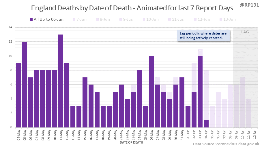 [4/7] Animated chart to show how the #covid19uk deaths by date of death have been contributed to by reports over the last 7 days. Note this just includes England numbers as other nations don't always publish their date-of-death data every day.