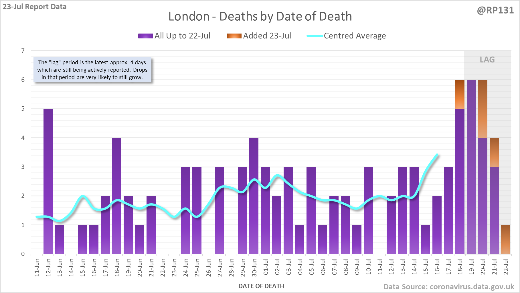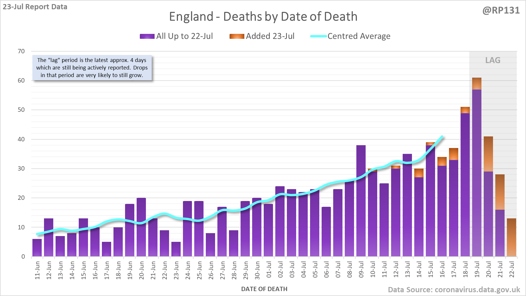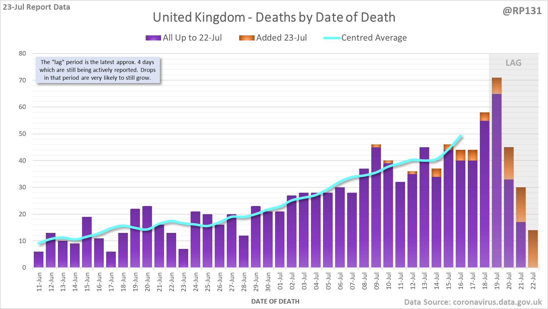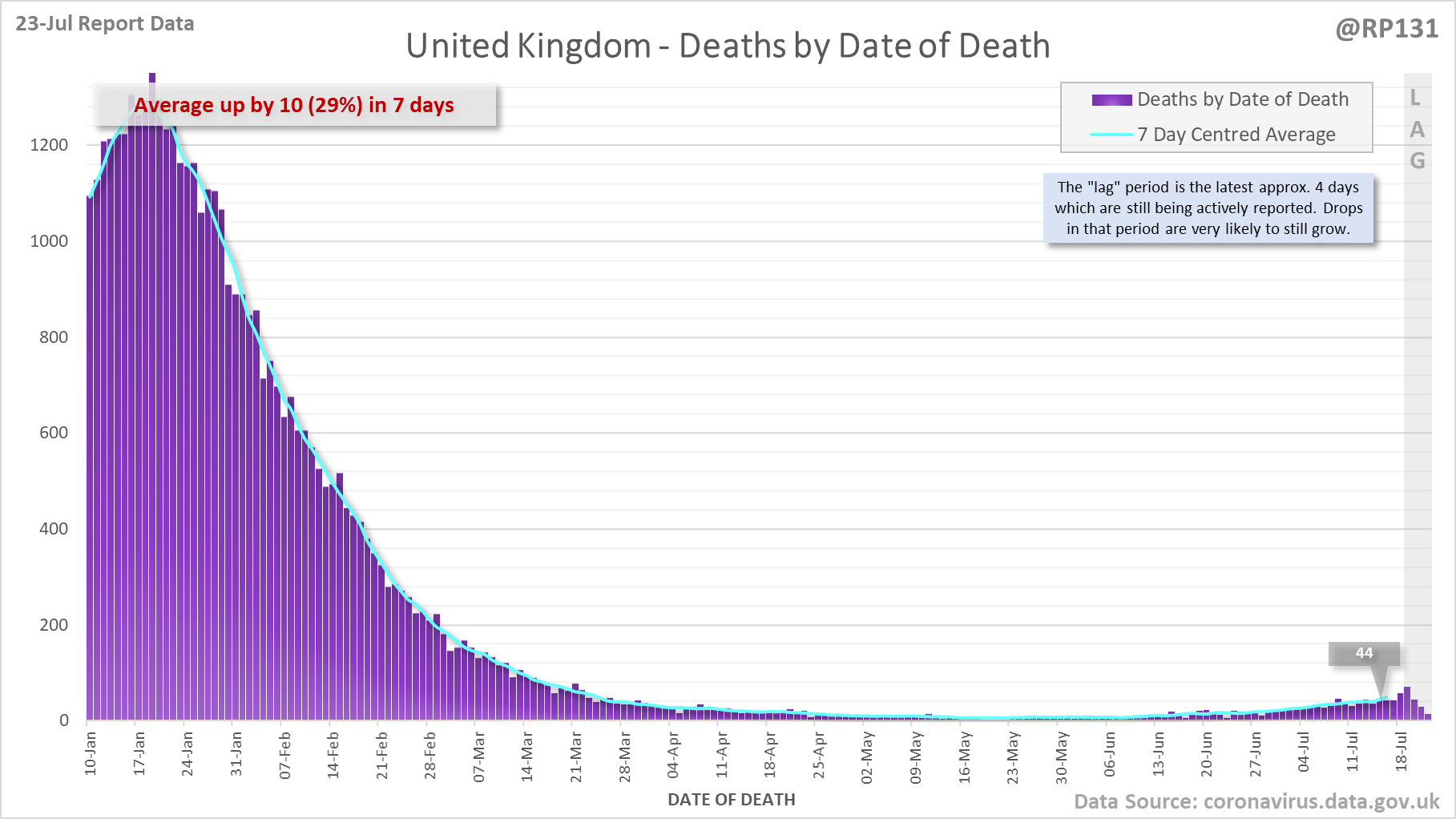 [1/7] 64 new #covid19uk deaths reported today (23-Jul). This brings the rolling average by date of death (allowing 4 days for lag) to 44, an increase of 10 (29%) in the last week.