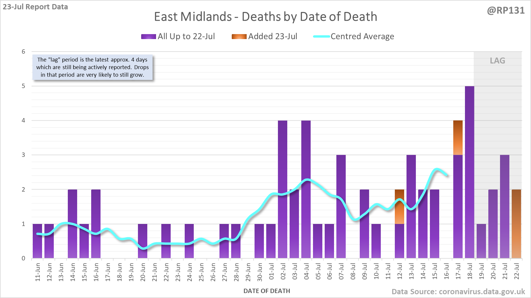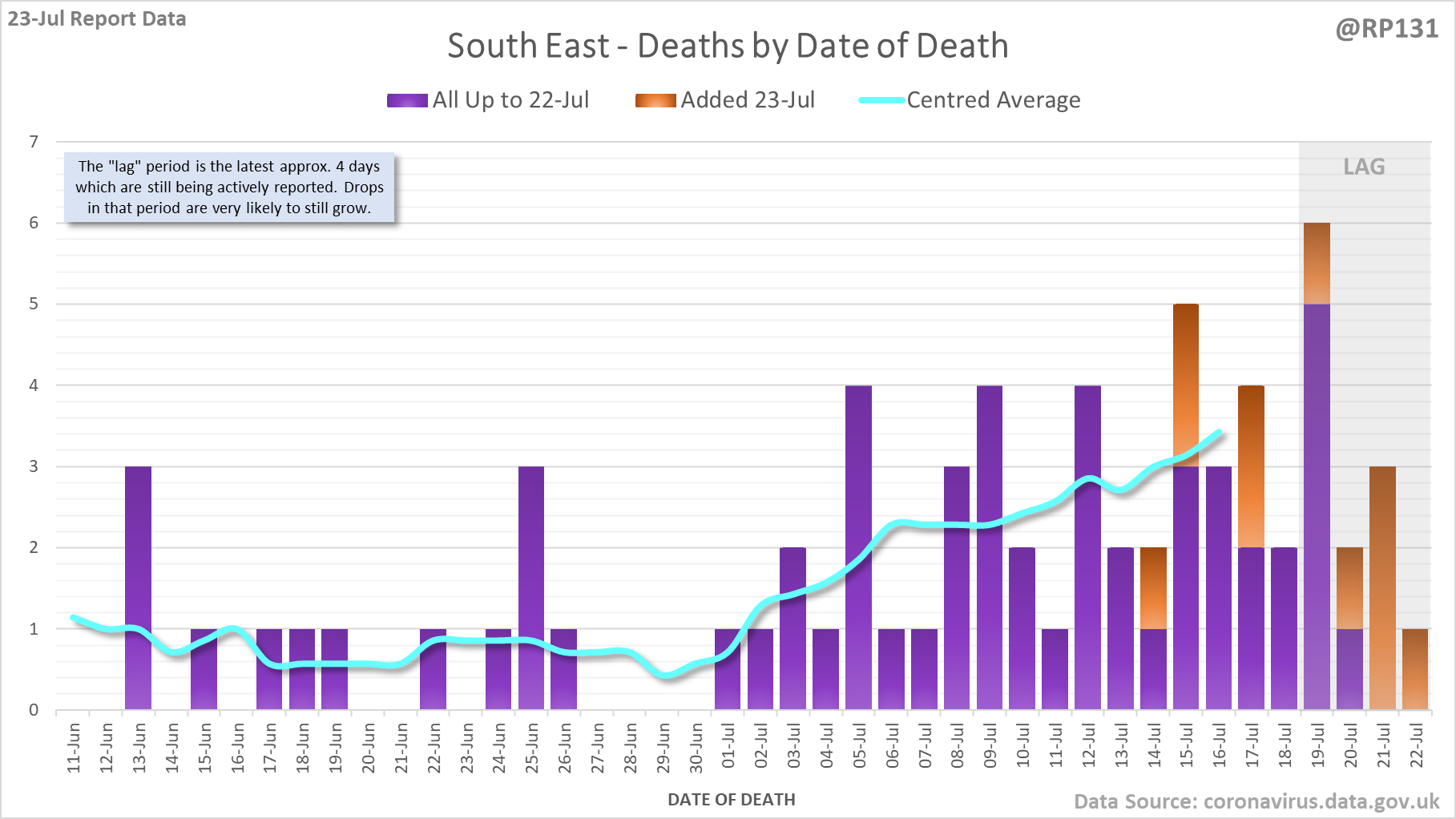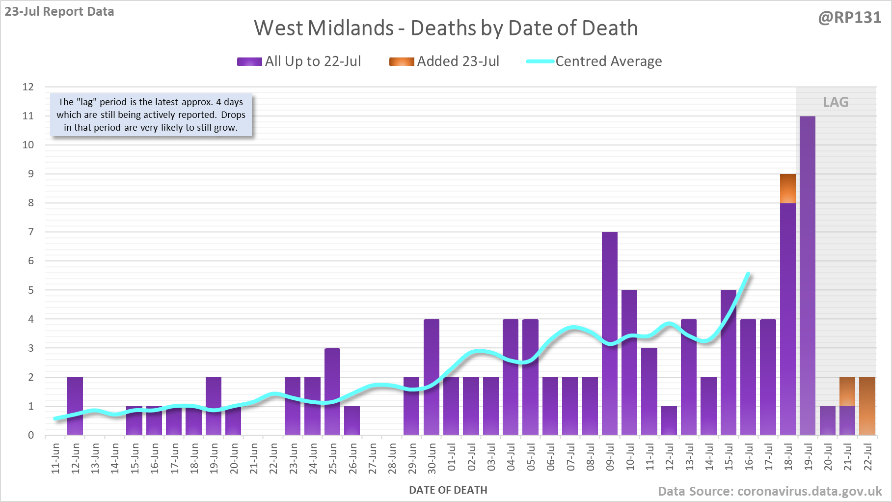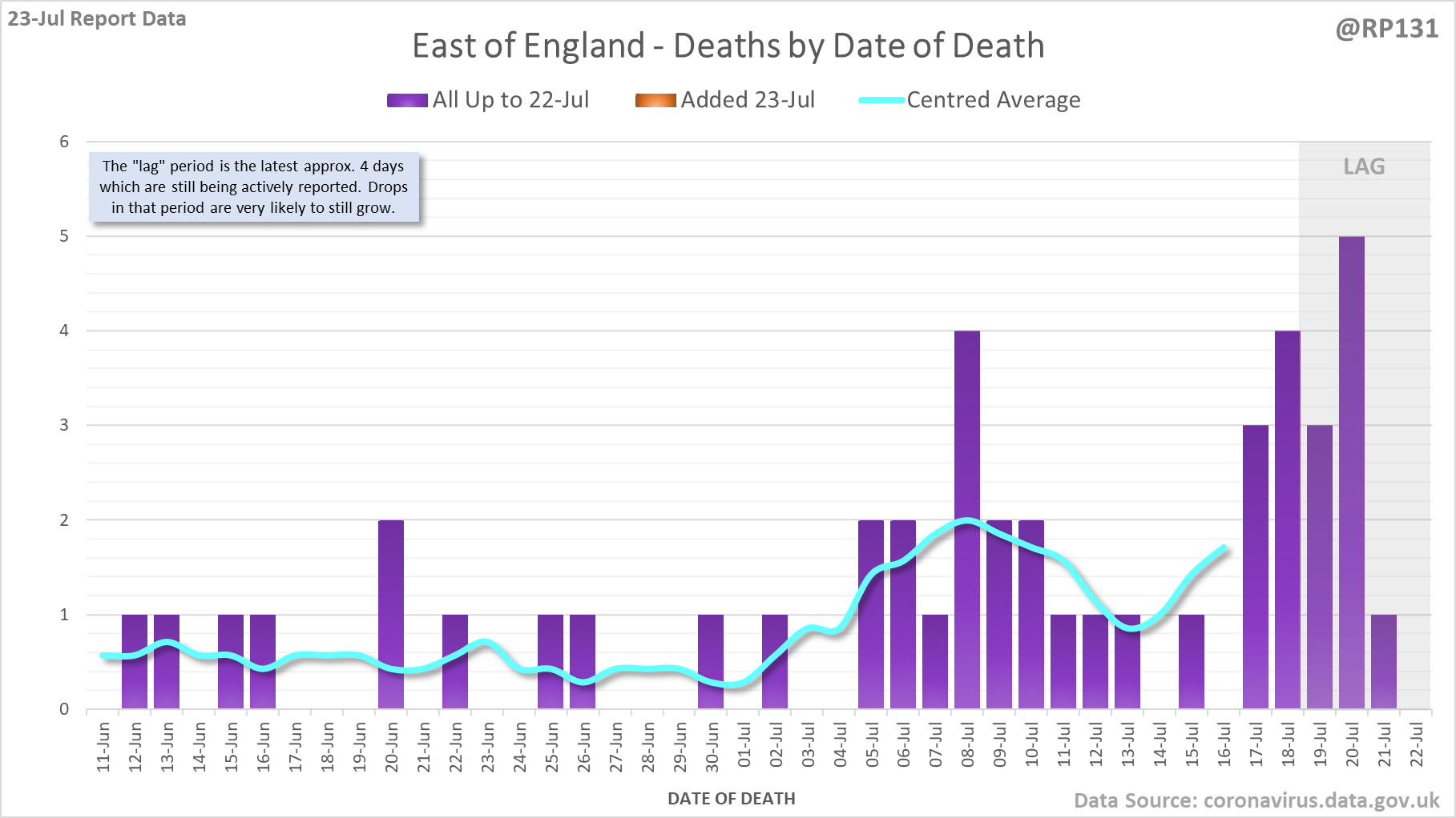[1/7] 64 new #covid19uk deaths reported today (23-Jul). This brings the rolling average by date of death (allowing 4 days for lag) to 44, an increase of 10 (29%) in the last week.