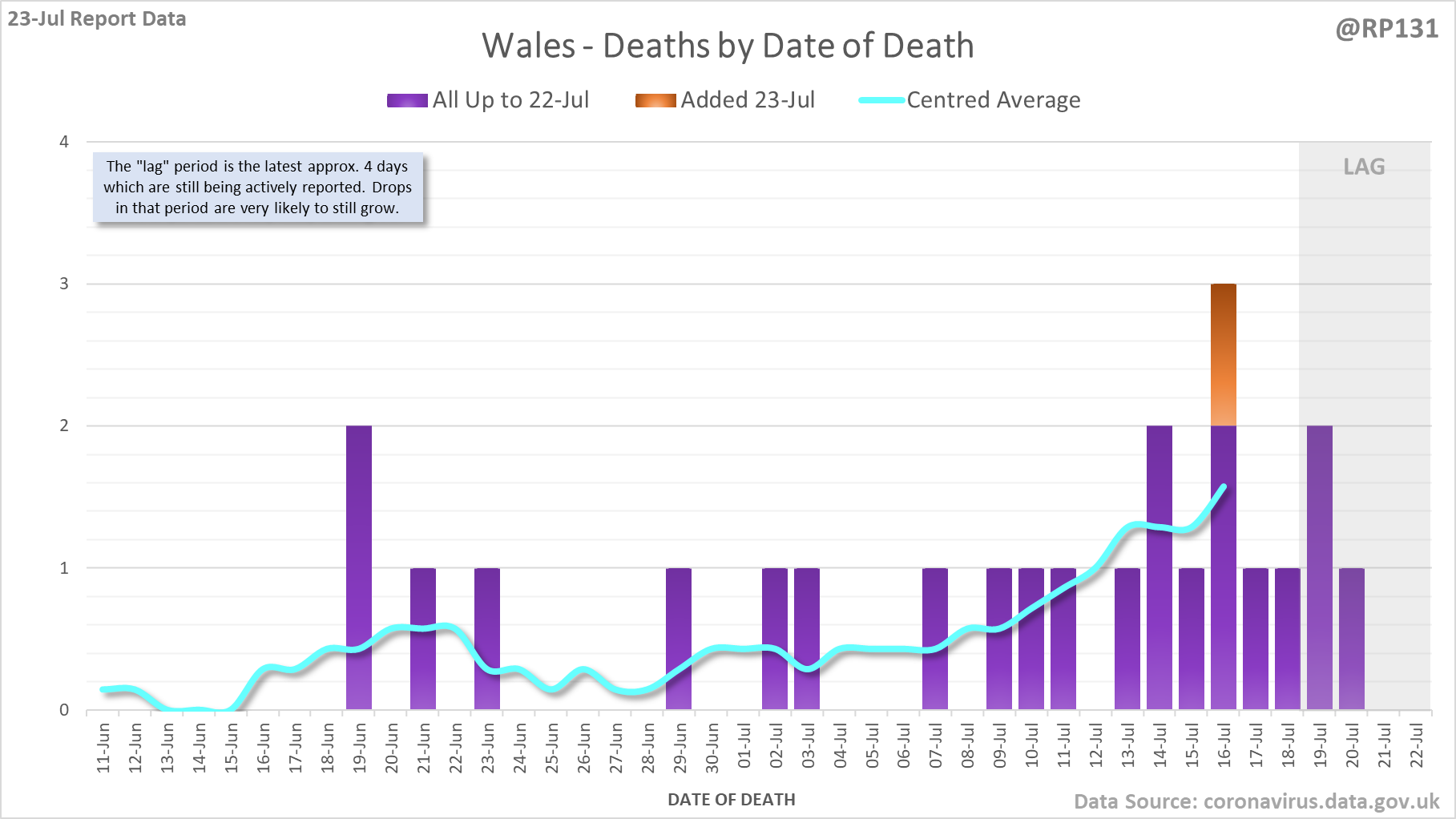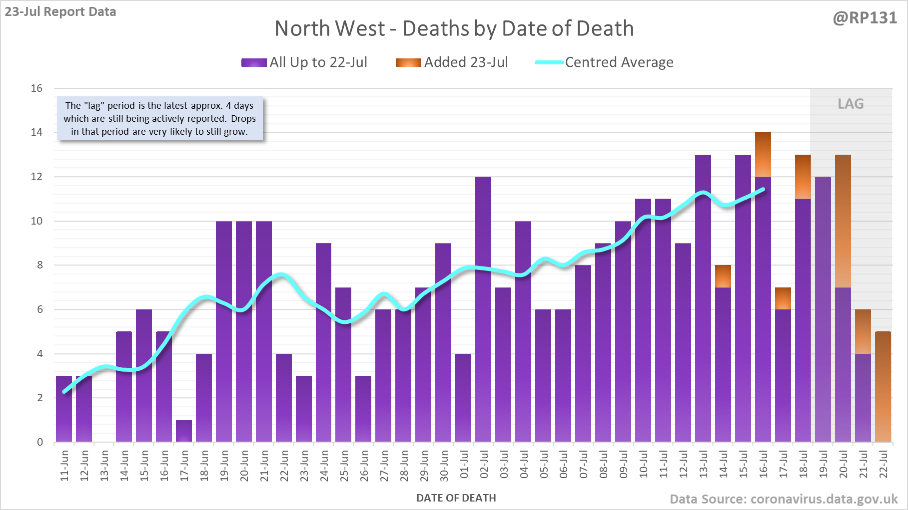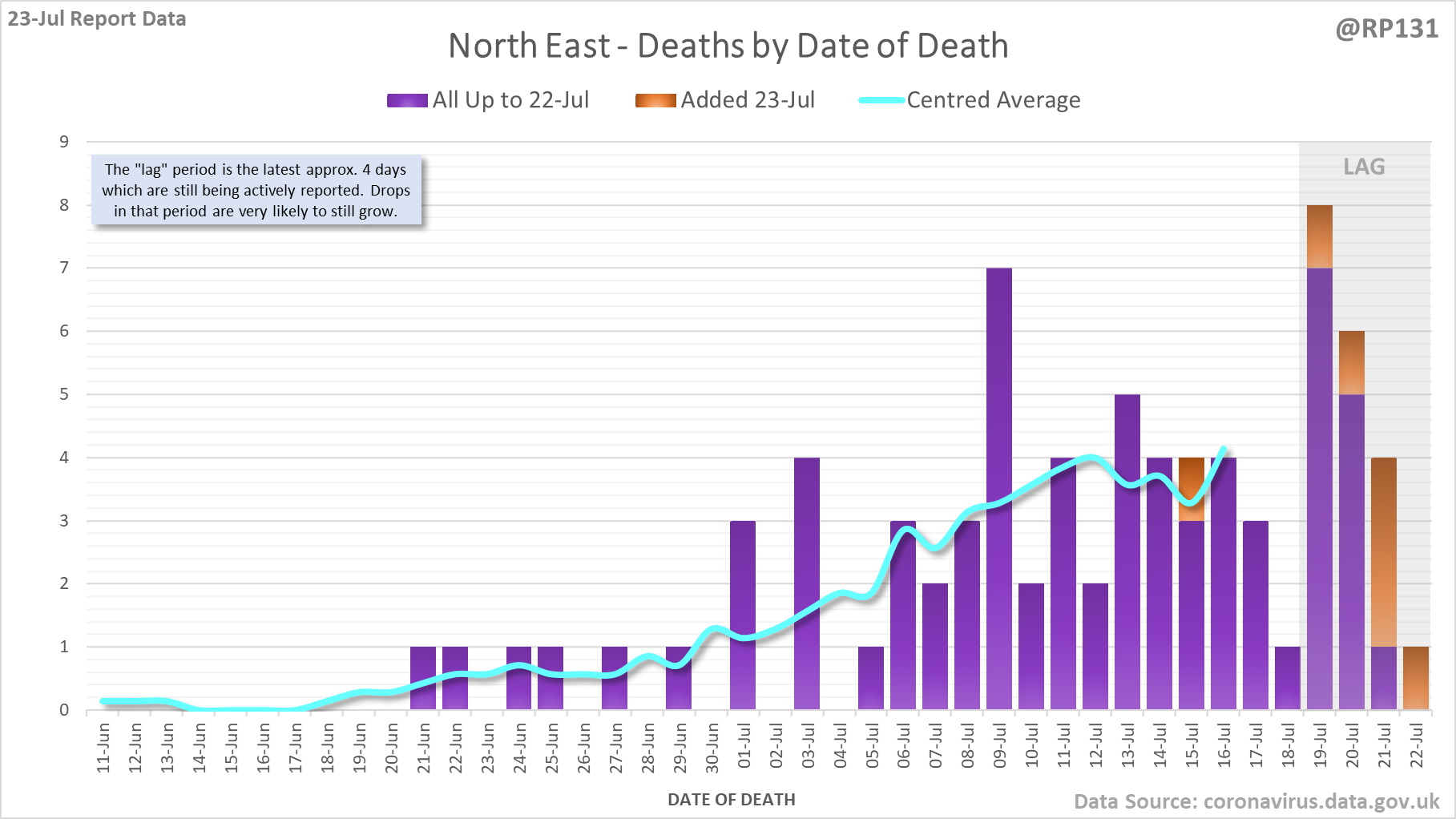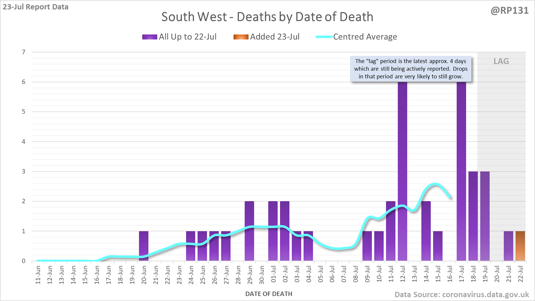 [1/7] 64 new #covid19uk deaths reported today (23-Jul). This brings the rolling average by date of death (allowing 4 days for lag) to 44, an increase of 10 (29%) in the last week.