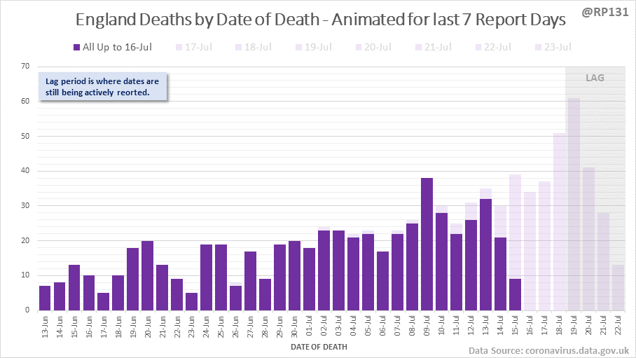 [4/7] Animated chart to show how the #covid19uk deaths by date of death have been contributed to by reports over the last 7 days. Note this just includes England numbers as other nations don't always publish their date-of-death data every day.