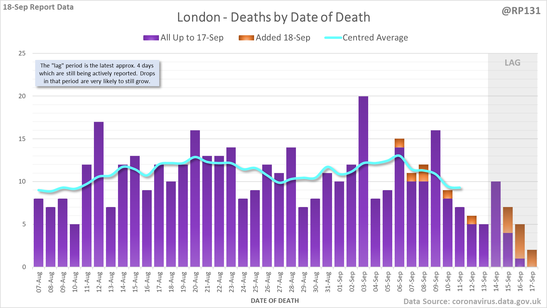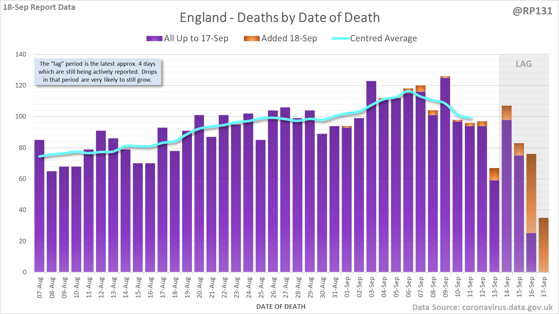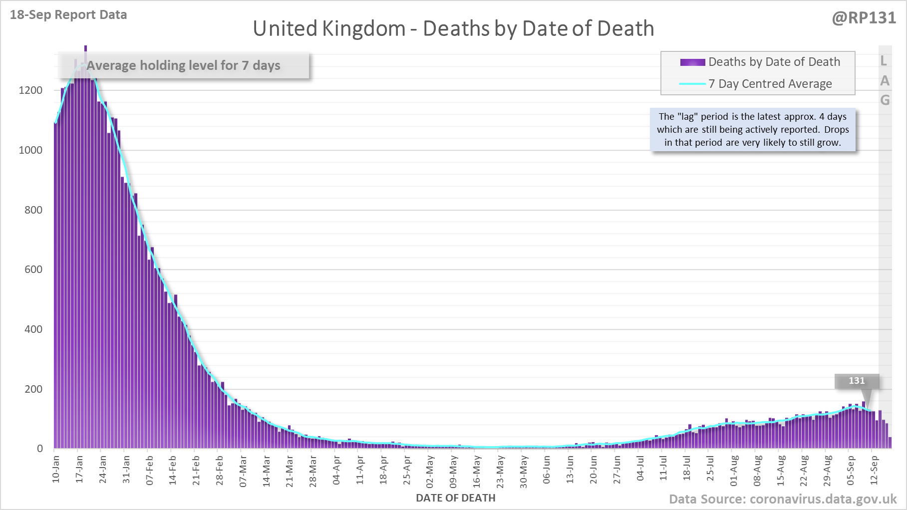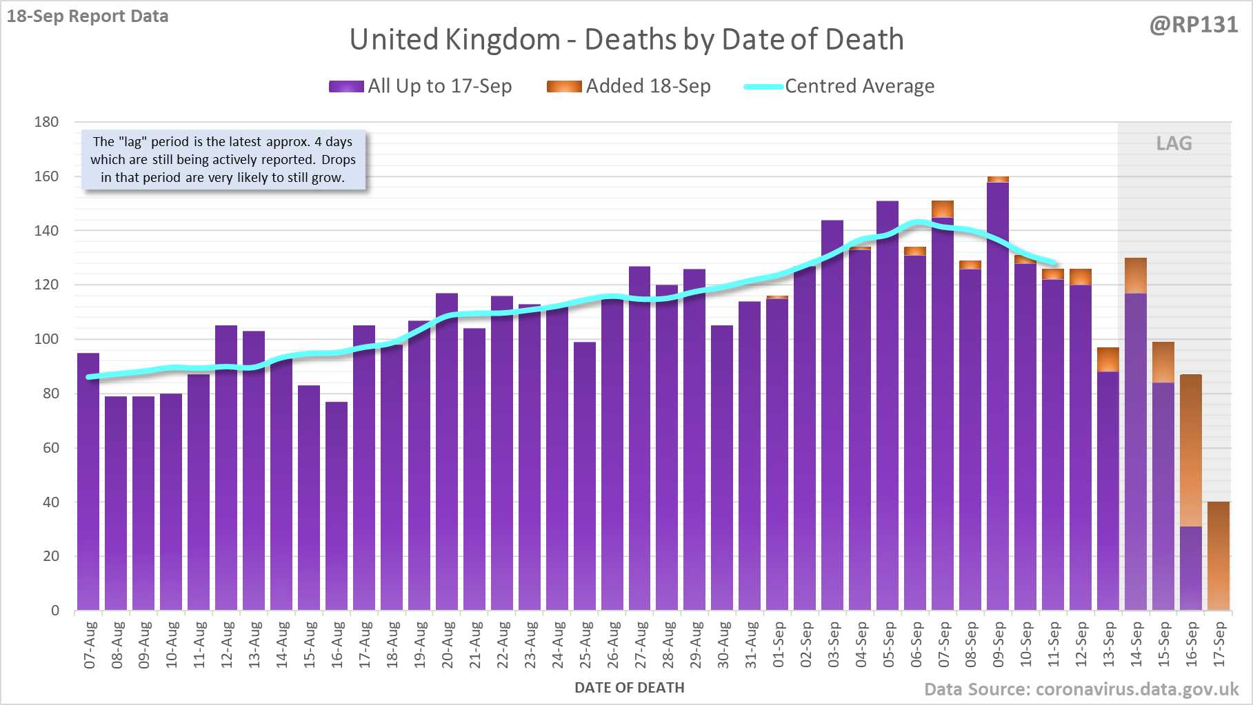 [1/7] 164 new #covid19uk deaths reported today (18-Sep). This brings the rolling average by date of death (allowing 4 days for lag) to 131.