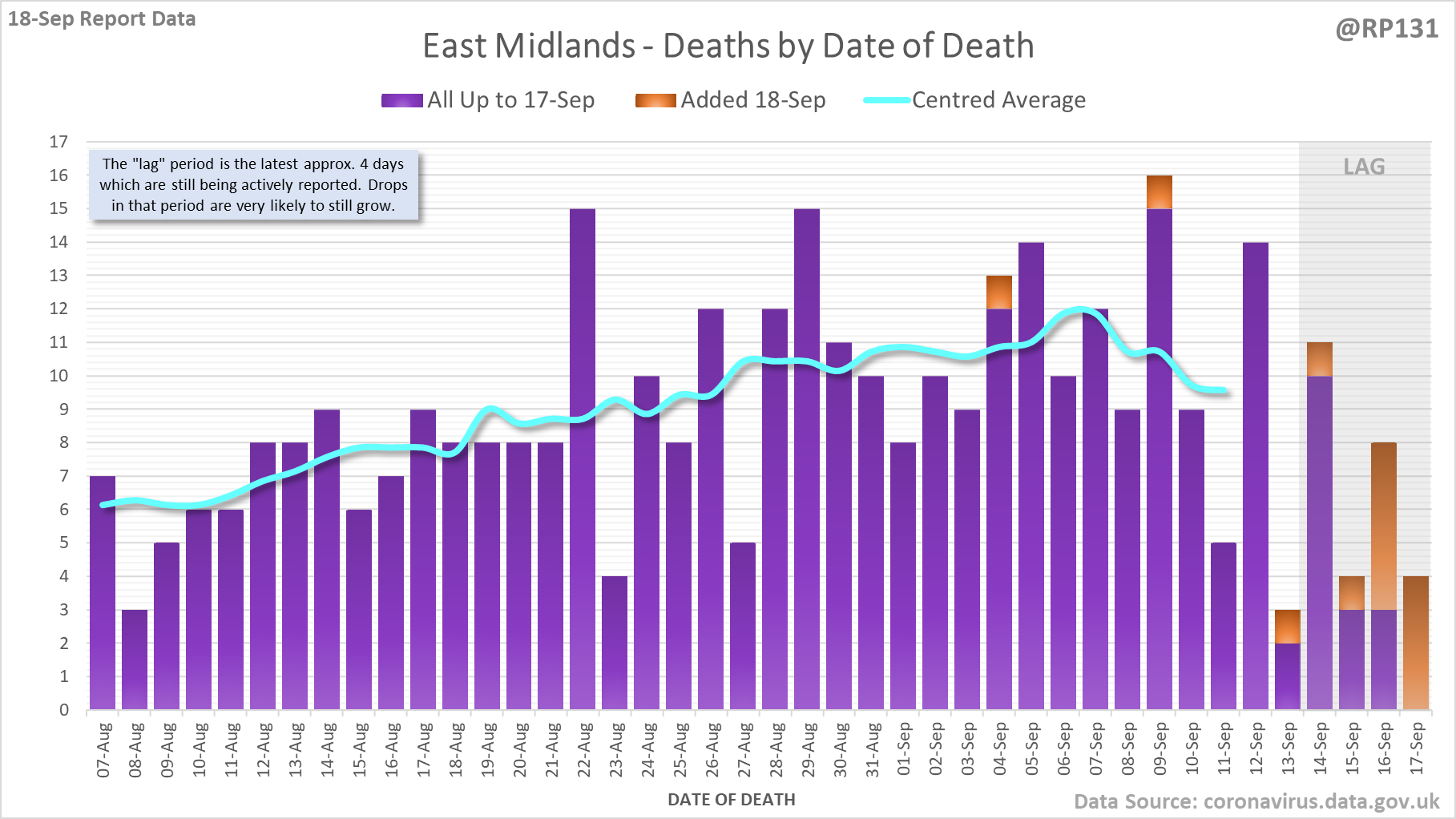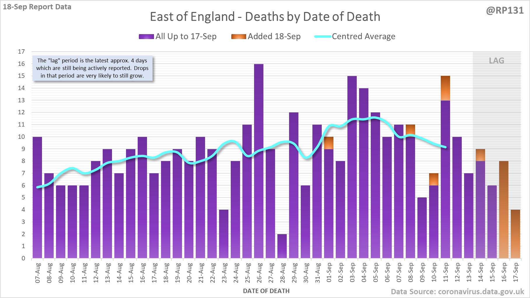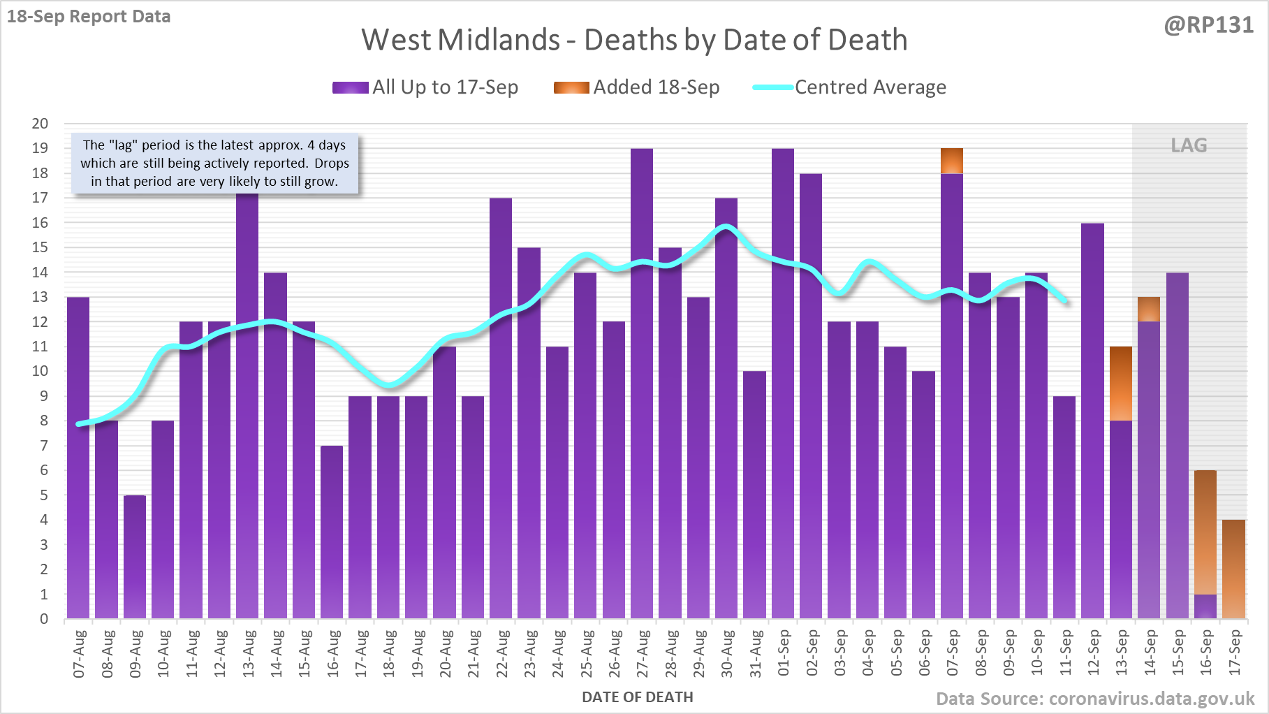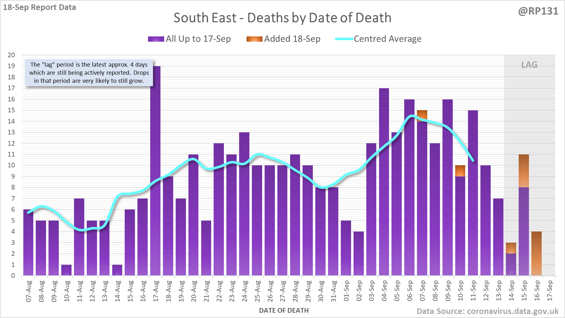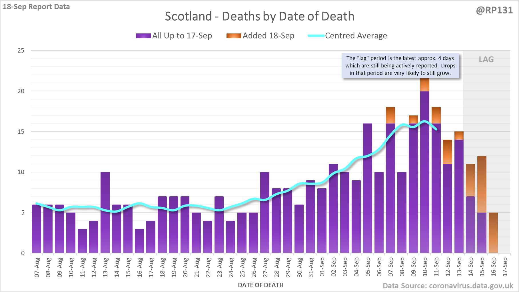 [1/7] 164 new #covid19uk deaths reported today (18-Sep). This brings the rolling average by date of death (allowing 4 days for lag) to 131.