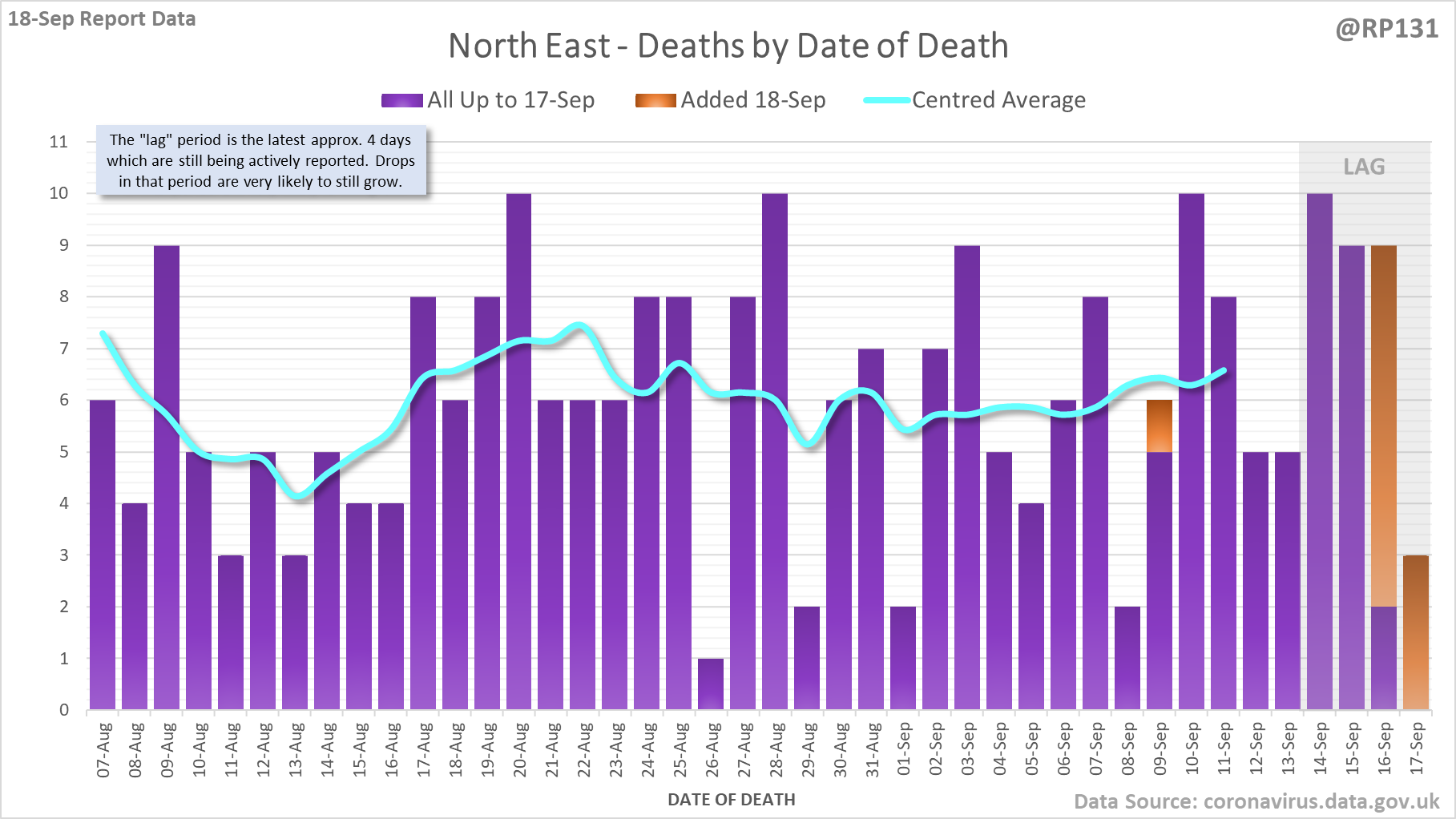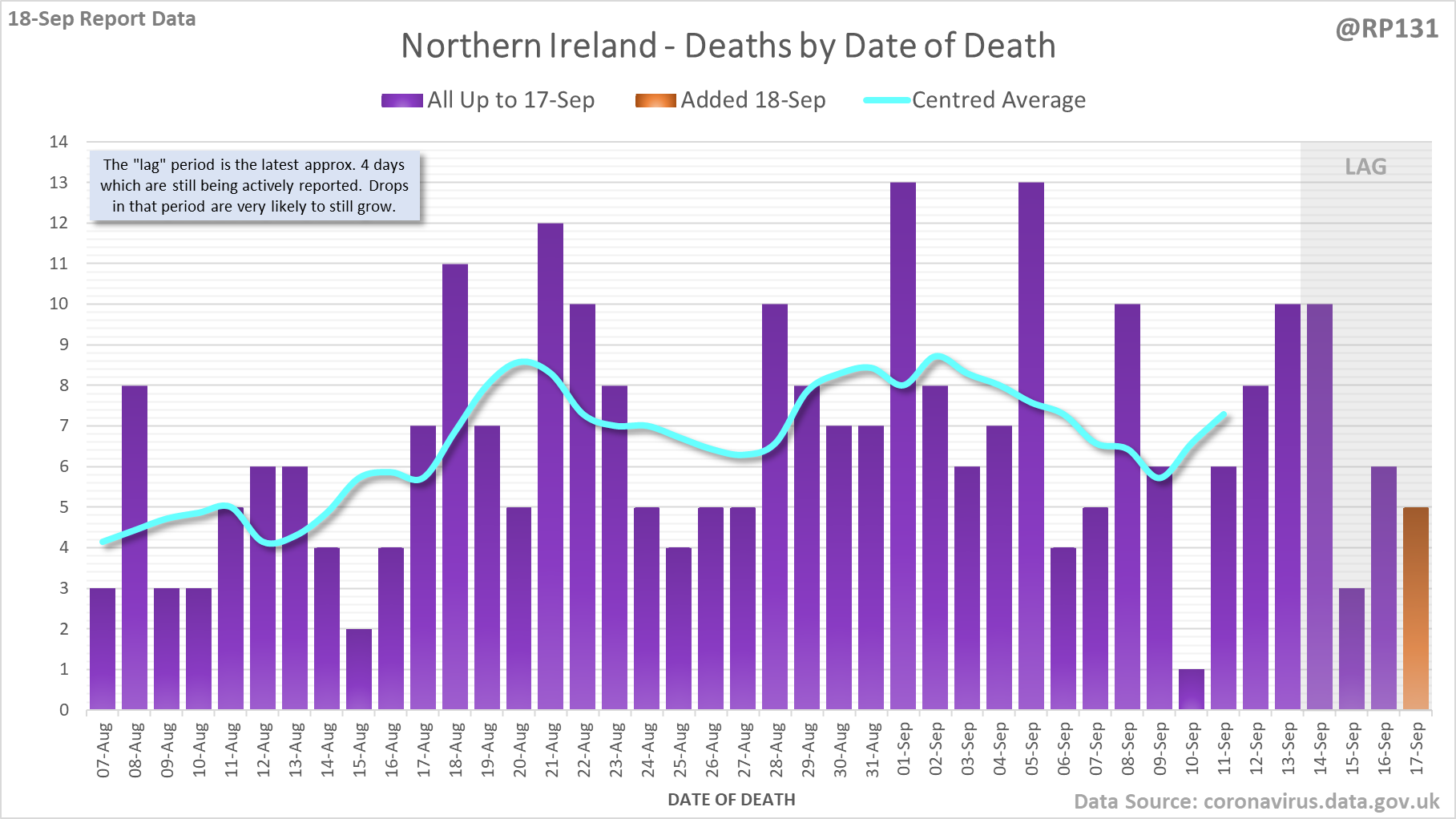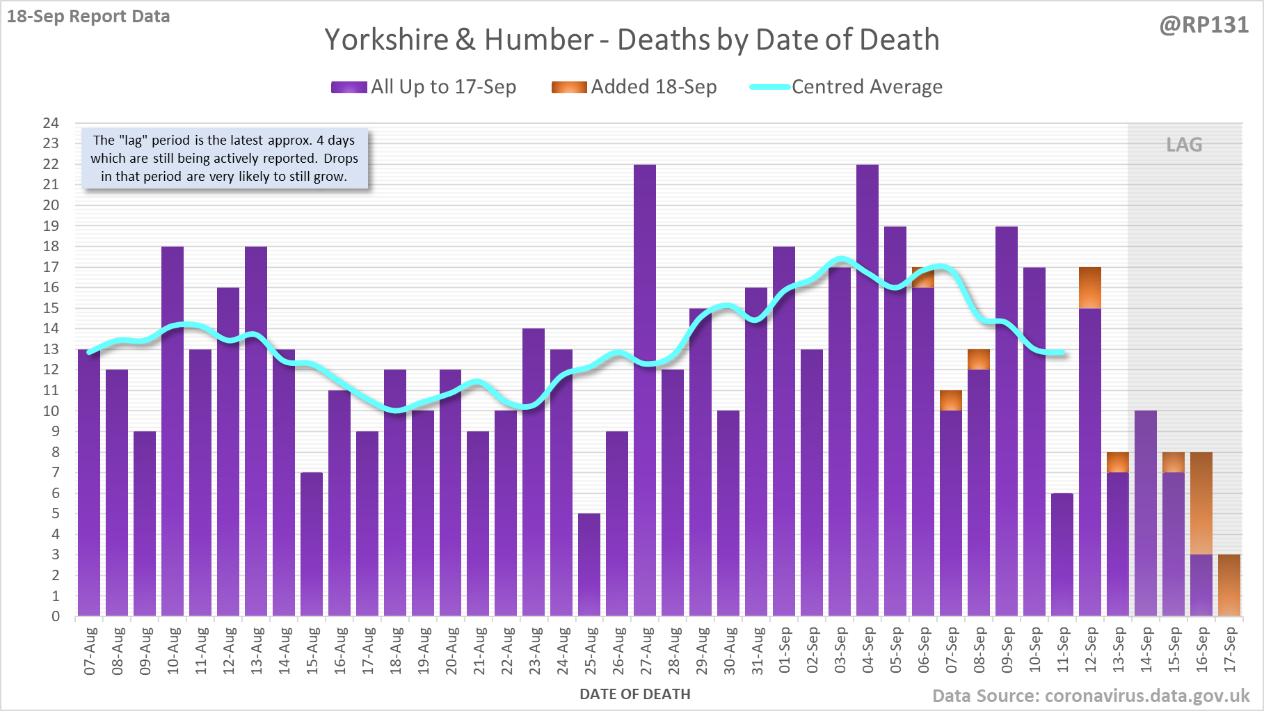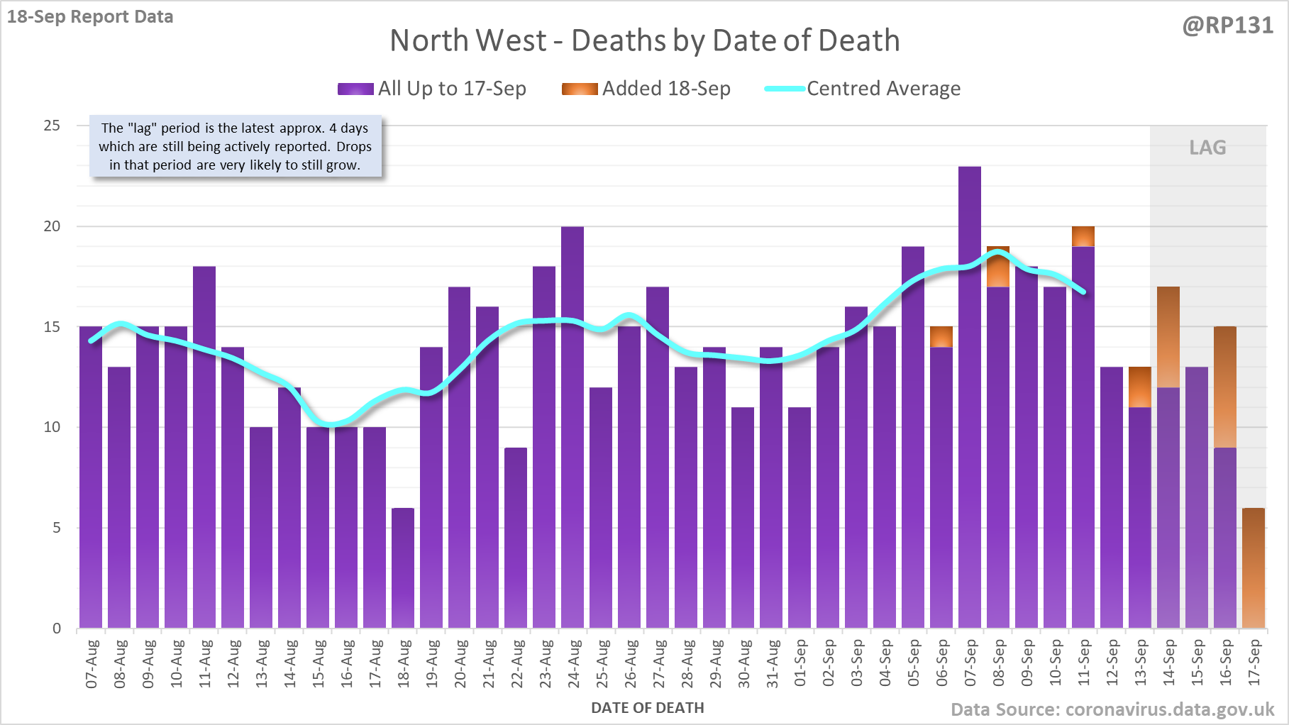 [1/7] 164 new #covid19uk deaths reported today (18-Sep). This brings the rolling average by date of death (allowing 4 days for lag) to 131.