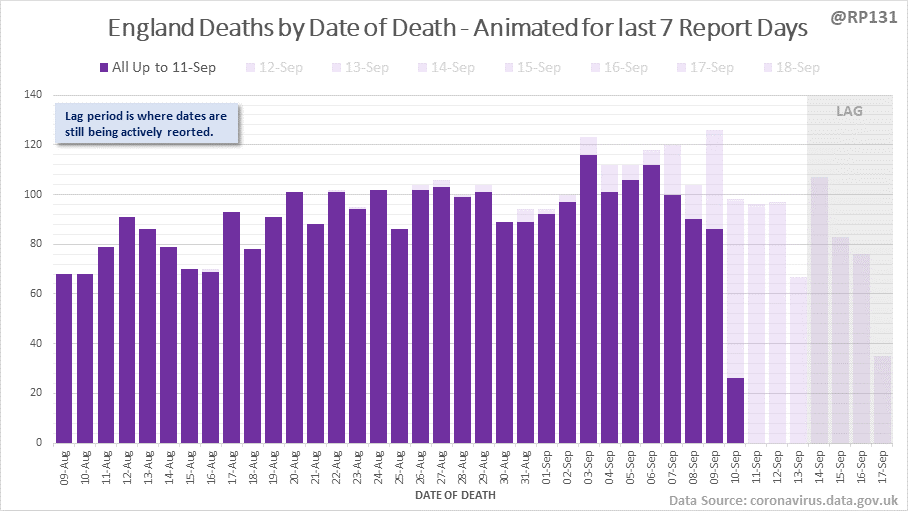 [4/7] Animated chart to show how the #covid19uk deaths by date of death have been contributed to by reports over the last 7 days. Note this just includes England numbers as other nations don't always publish their date-of-death data every day.