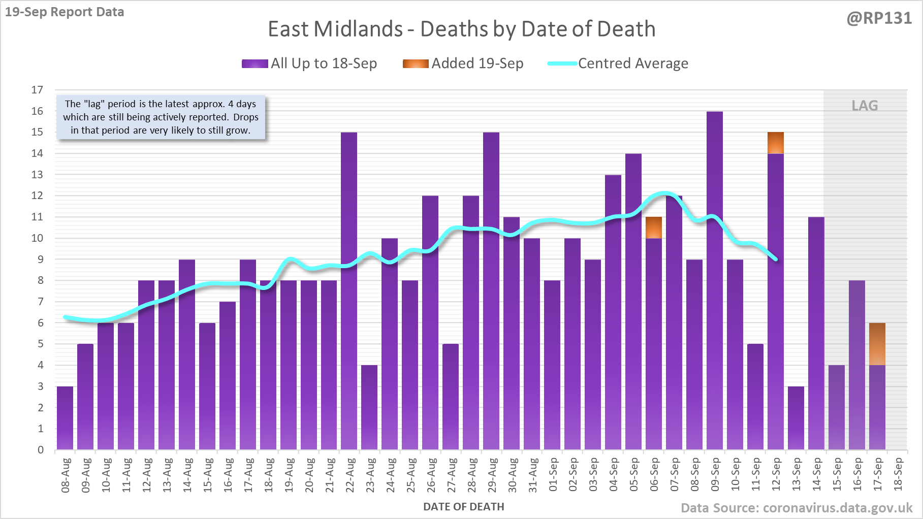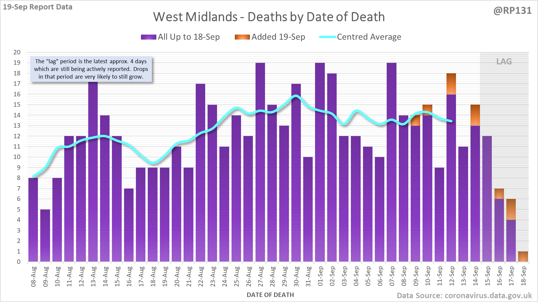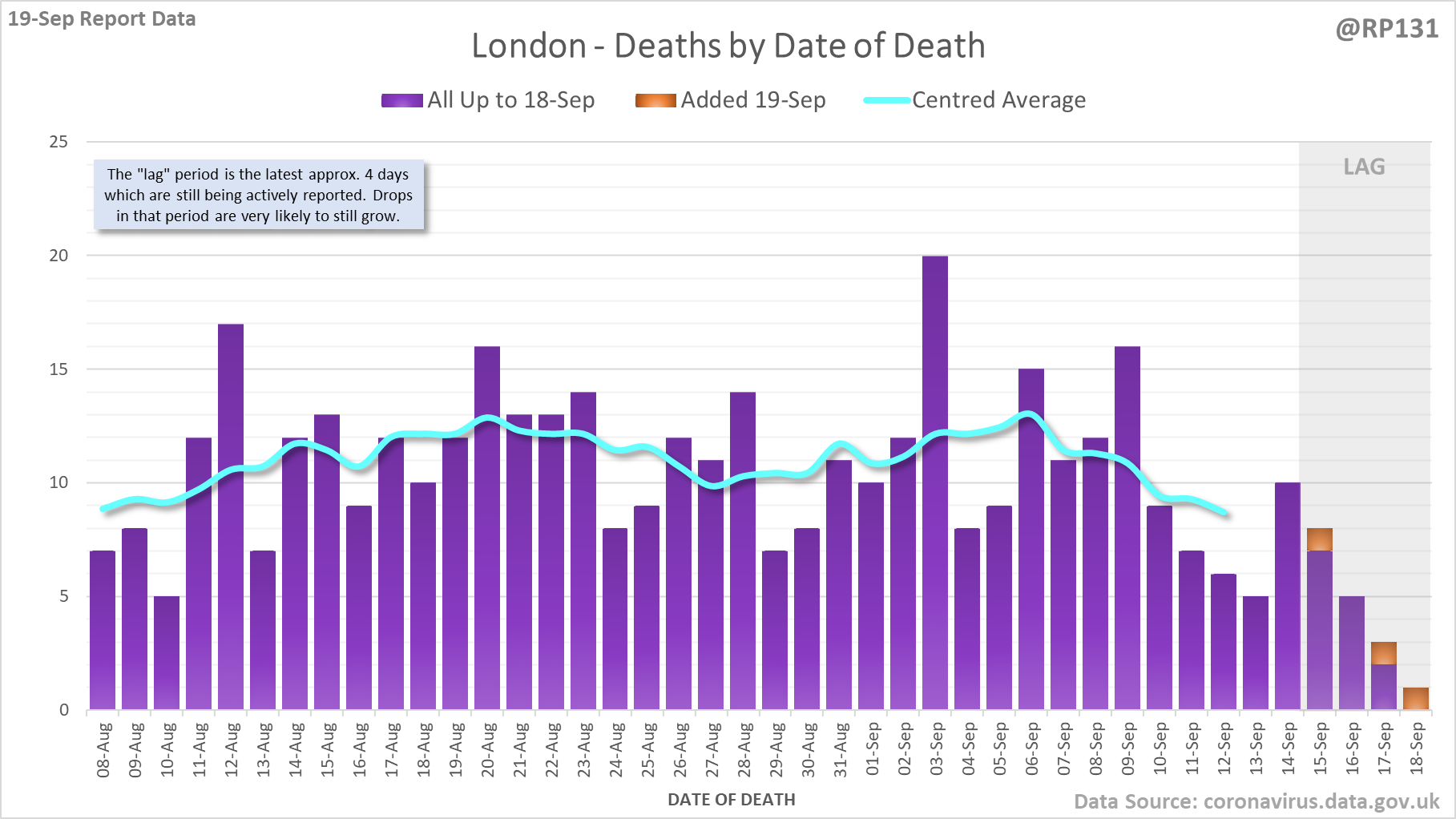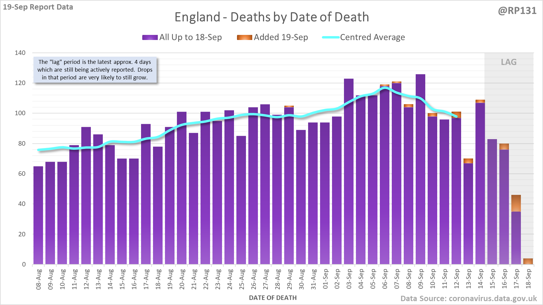 [1/7] 56 new #covid19uk deaths reported today (19-Sep). This brings the rolling average by date of death (allowing 4 days for lag) to 131, equivalent to around 03-Sep (i.e. 9 days ago), a reduction of 6 (4.4%) in the last week.