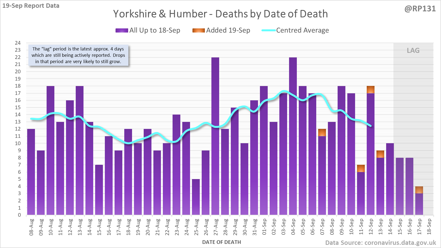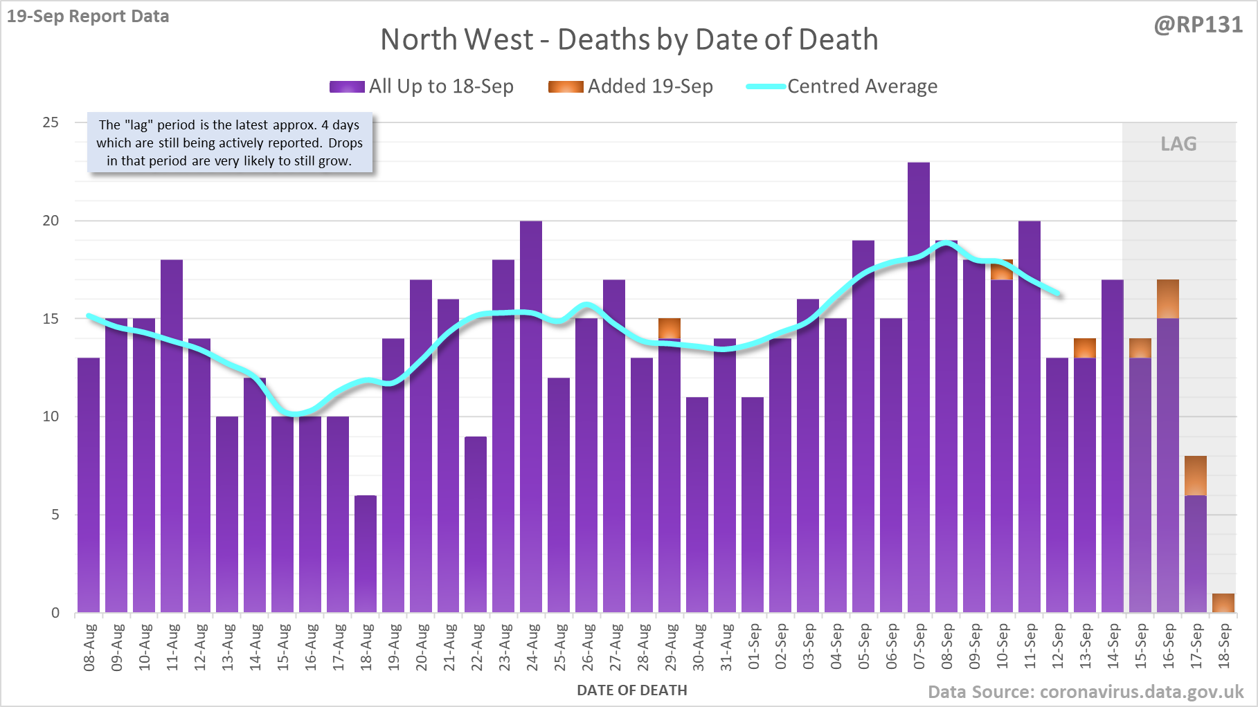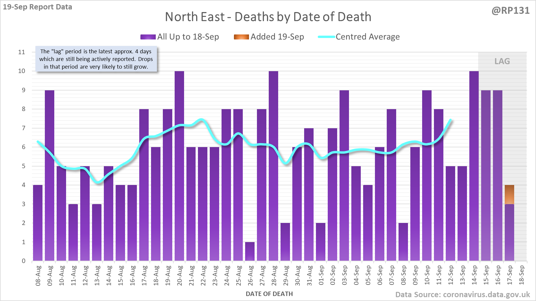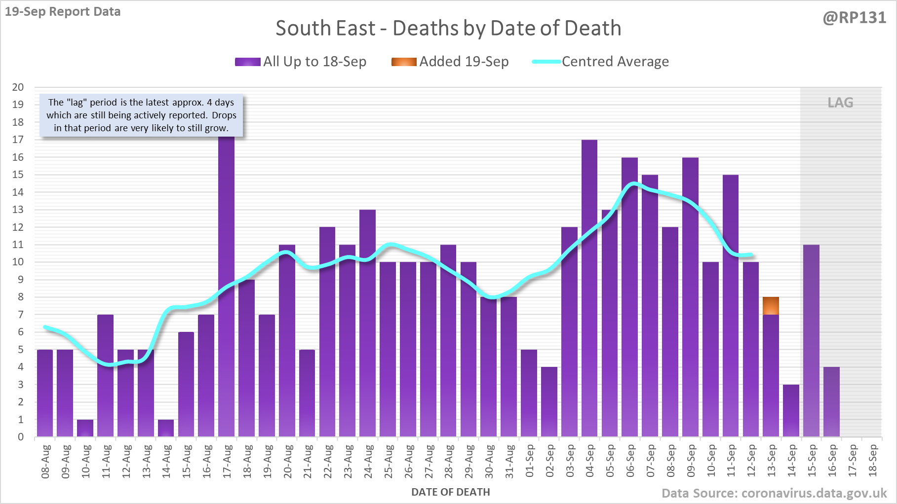 [1/7] 56 new #covid19uk deaths reported today (19-Sep). This brings the rolling average by date of death (allowing 4 days for lag) to 131, equivalent to around 03-Sep (i.e. 9 days ago), a reduction of 6 (4.4%) in the last week.