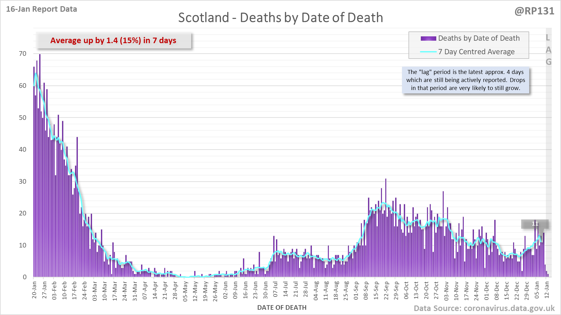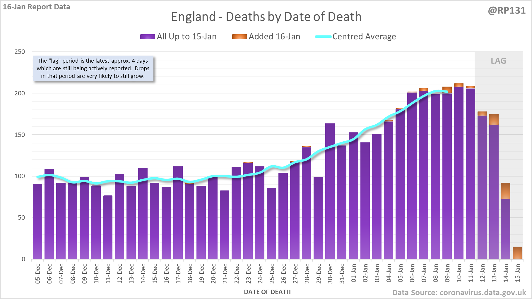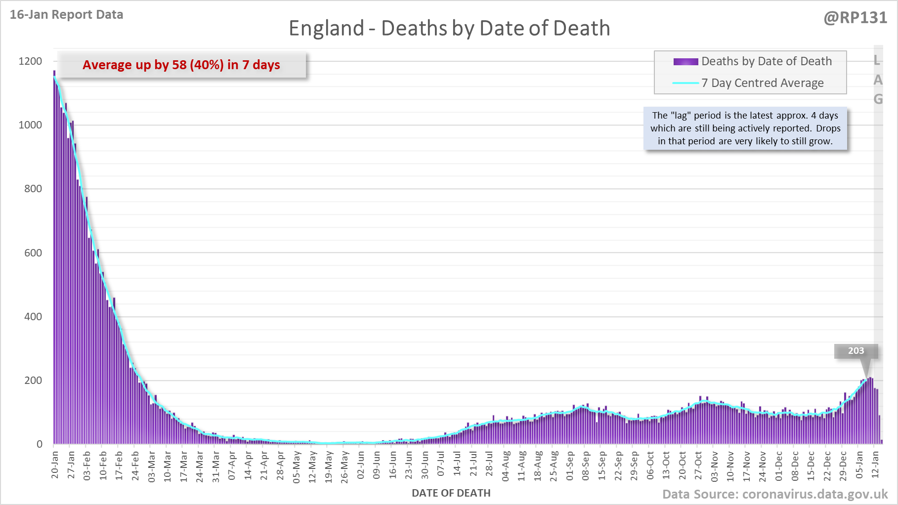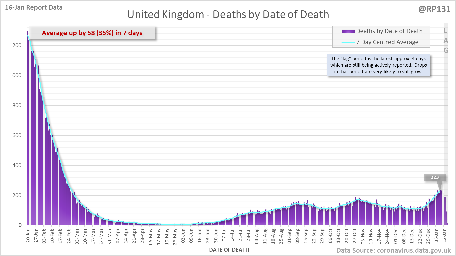 [1/8] 88 new #covid19uk deaths reported today (16-Jan). This brings the rolling average by date of death (allowing 4 days for lag) to 223, an increase of 58 (35%) in the last week.