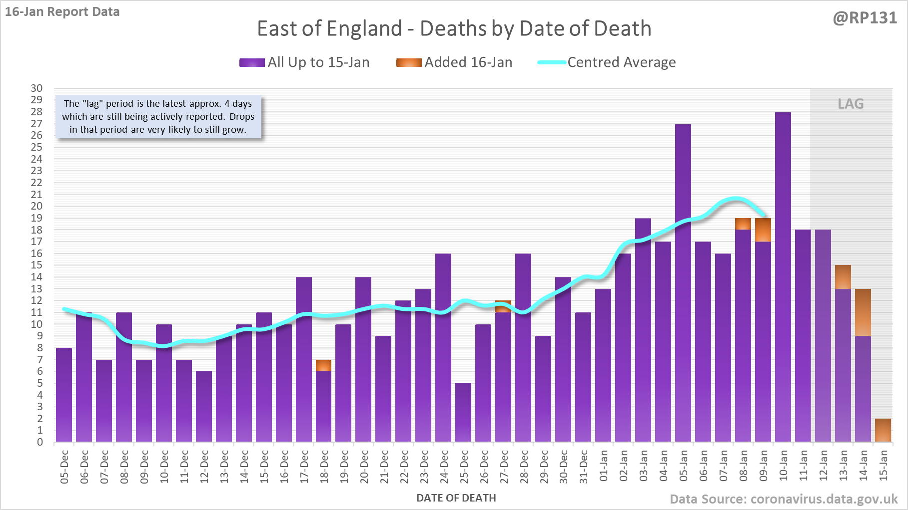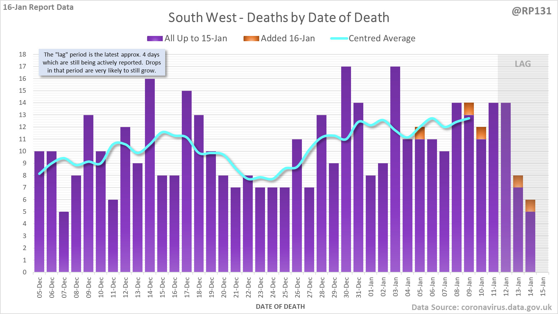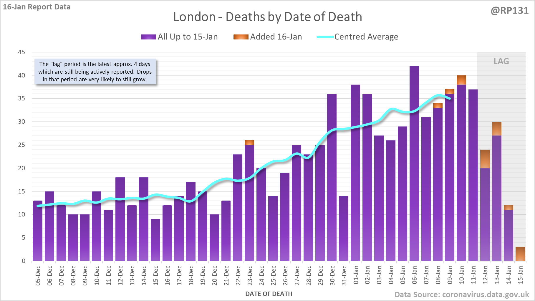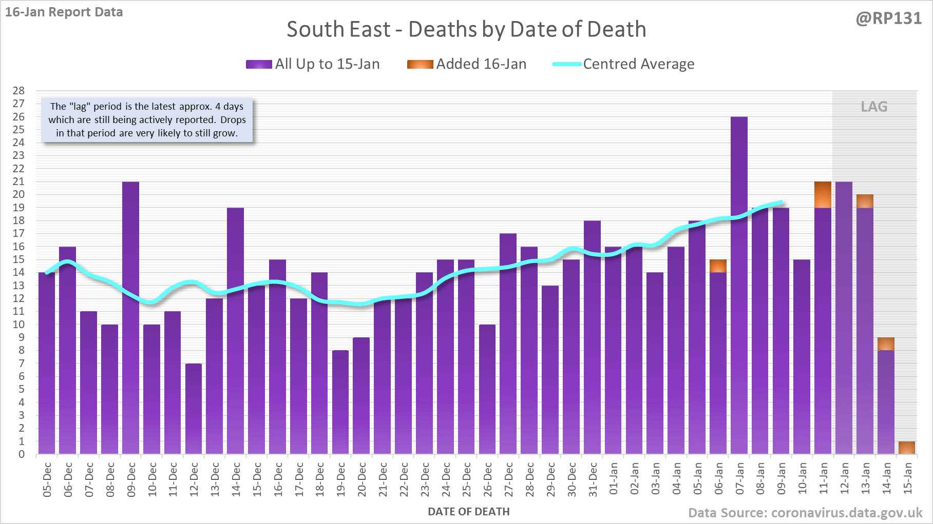 [1/8] 88 new #covid19uk deaths reported today (16-Jan). This brings the rolling average by date of death (allowing 4 days for lag) to 223, an increase of 58 (35%) in the last week.