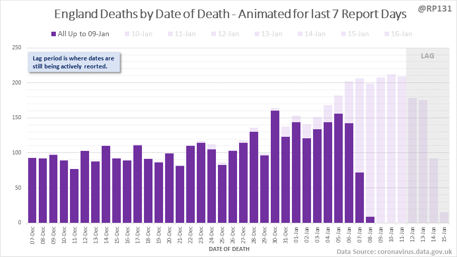 [5/8] Animated chart to show how the #covid19uk deaths by date of death have been contributed to by reports over the last 7 days. Note this just includes England numbers as other nations don't always publish their date-of-death data every day.