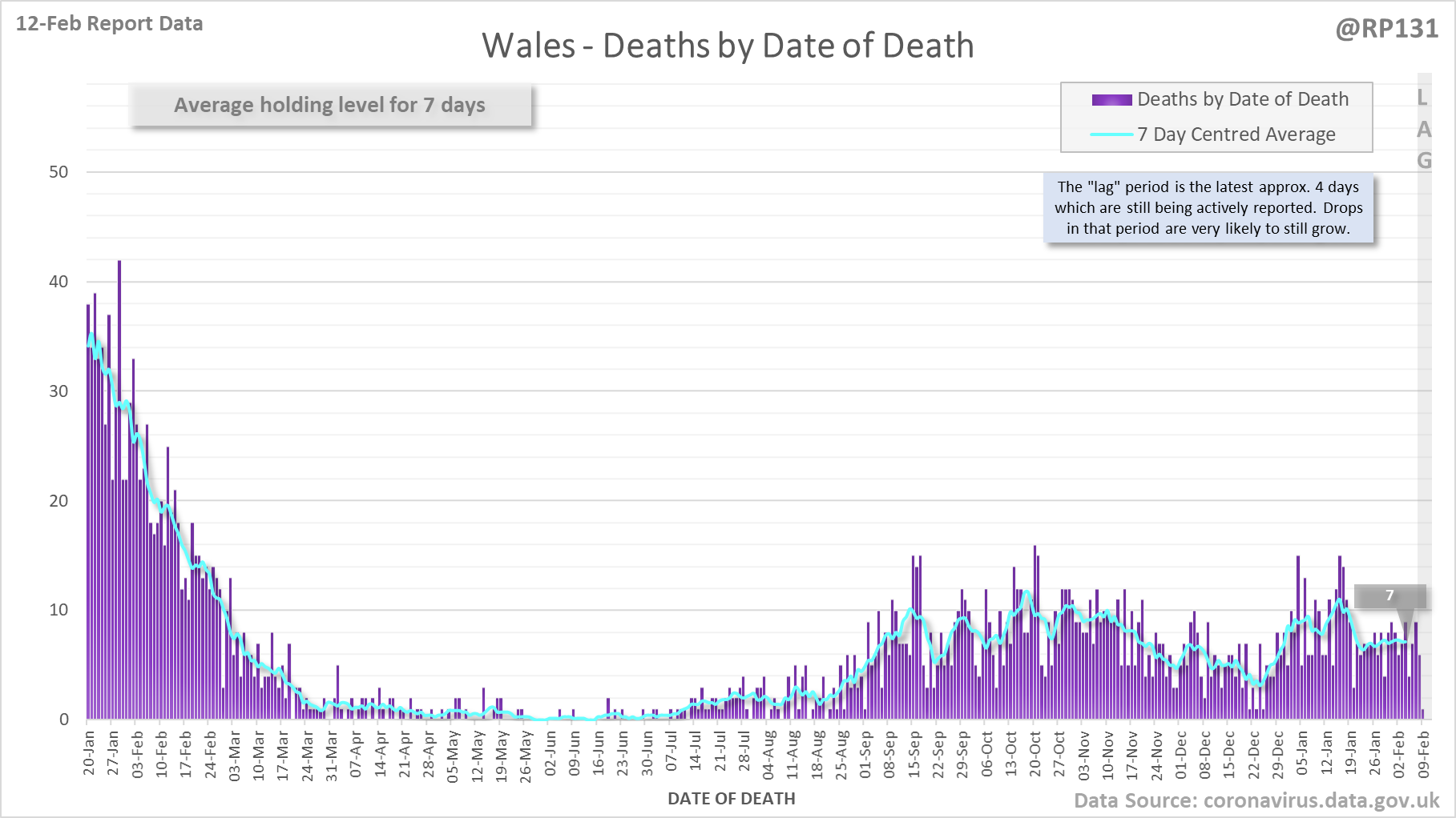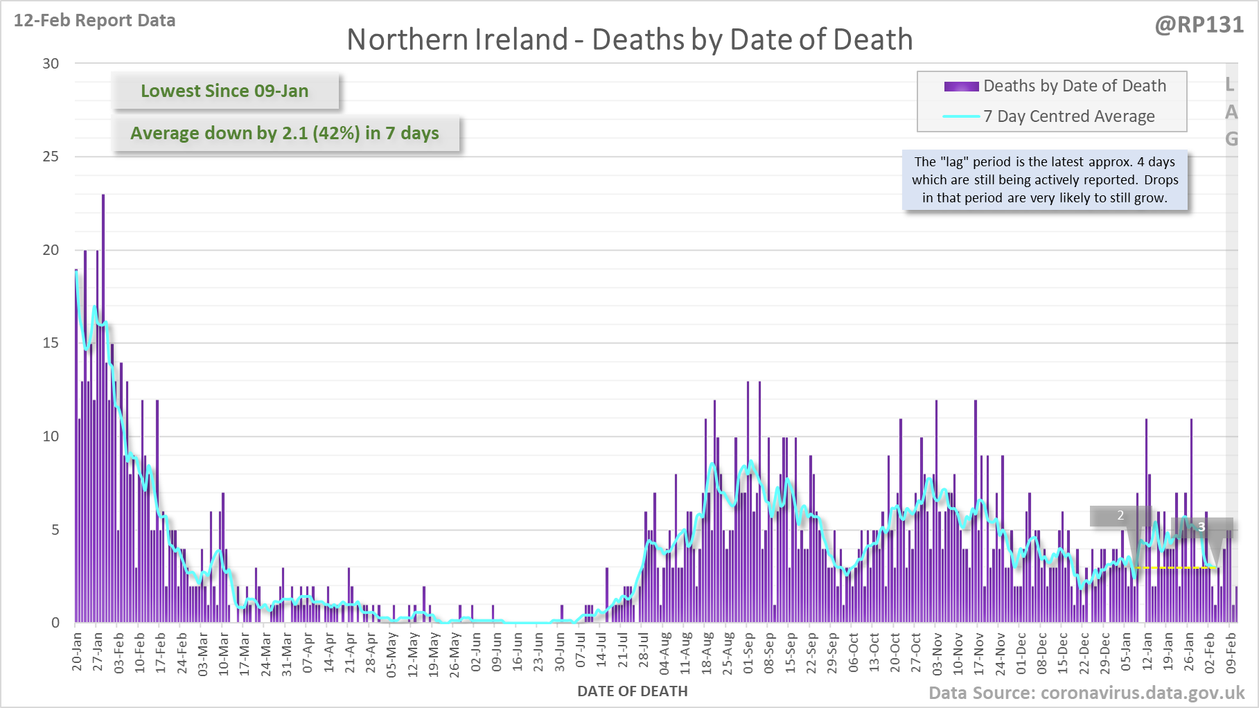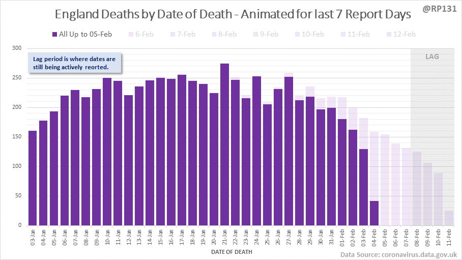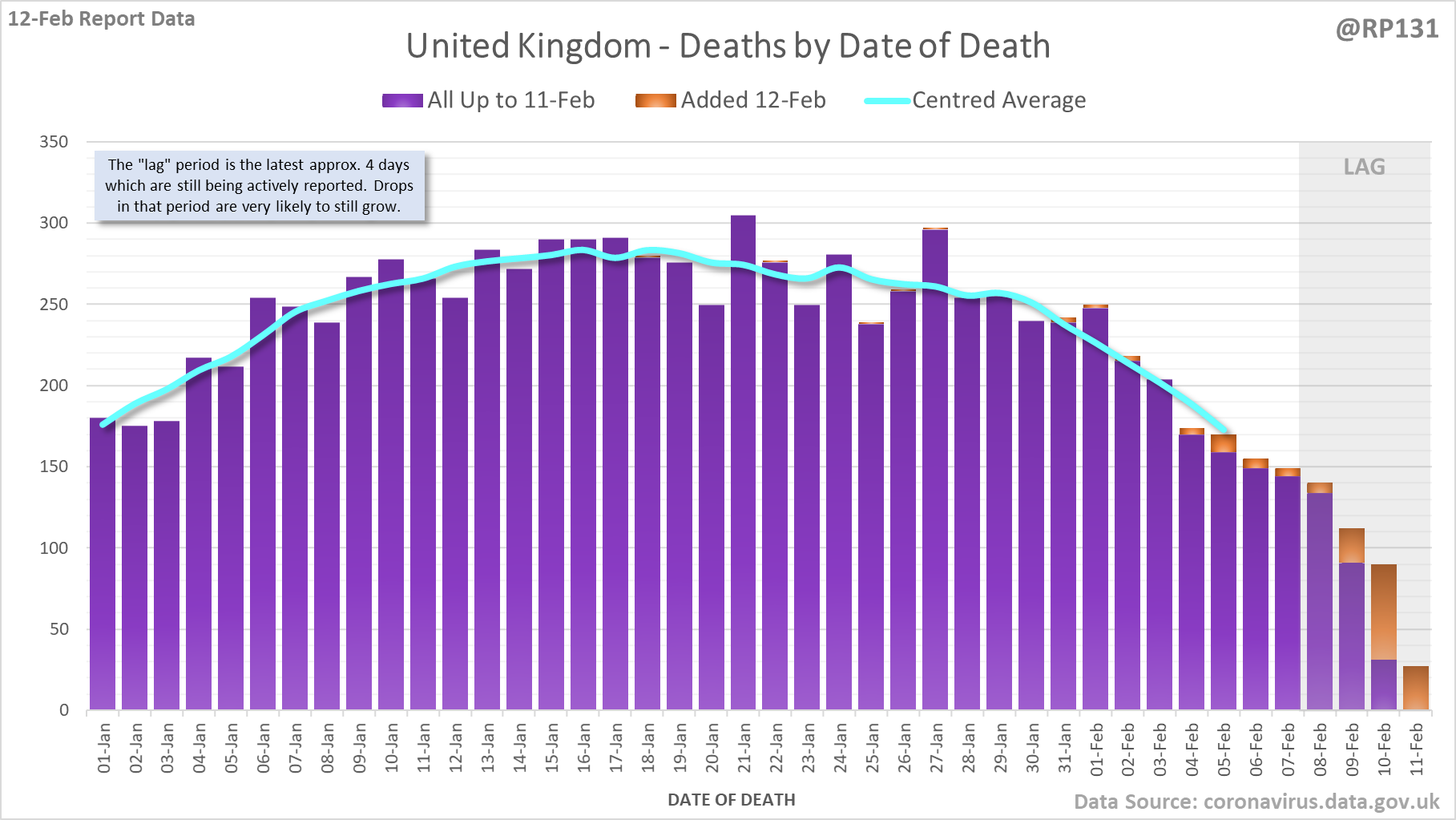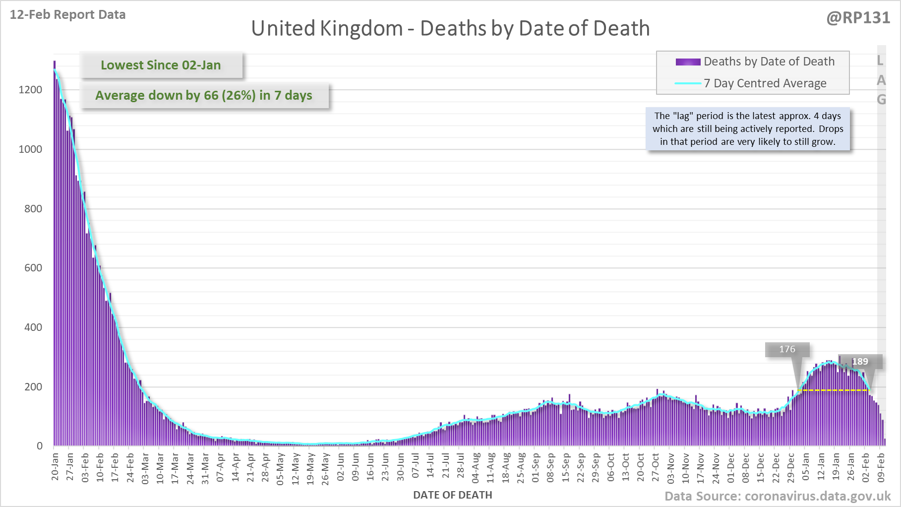 [1/8] 167 new #covid19uk deaths reported today (12-Feb). This brings the rolling average by date of death (allowing 4 days for lag) to 189, equivalent to around 02-Jan (i.e. 34 days ago), a reduction of 66 (26%) in the last week.