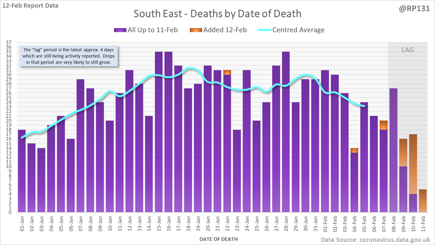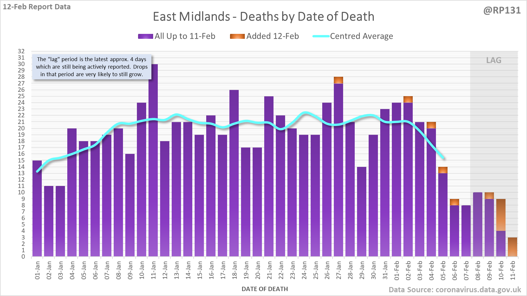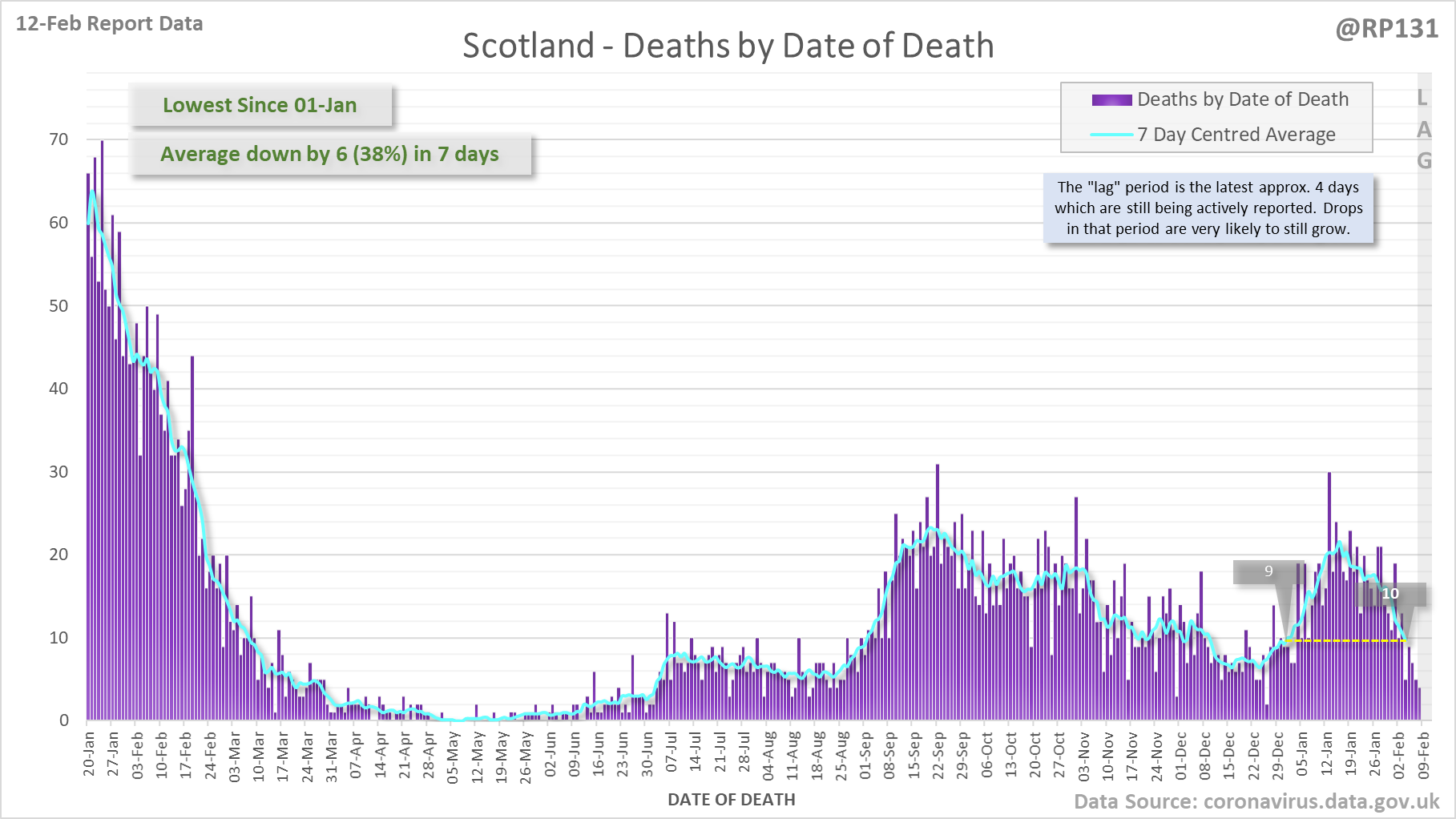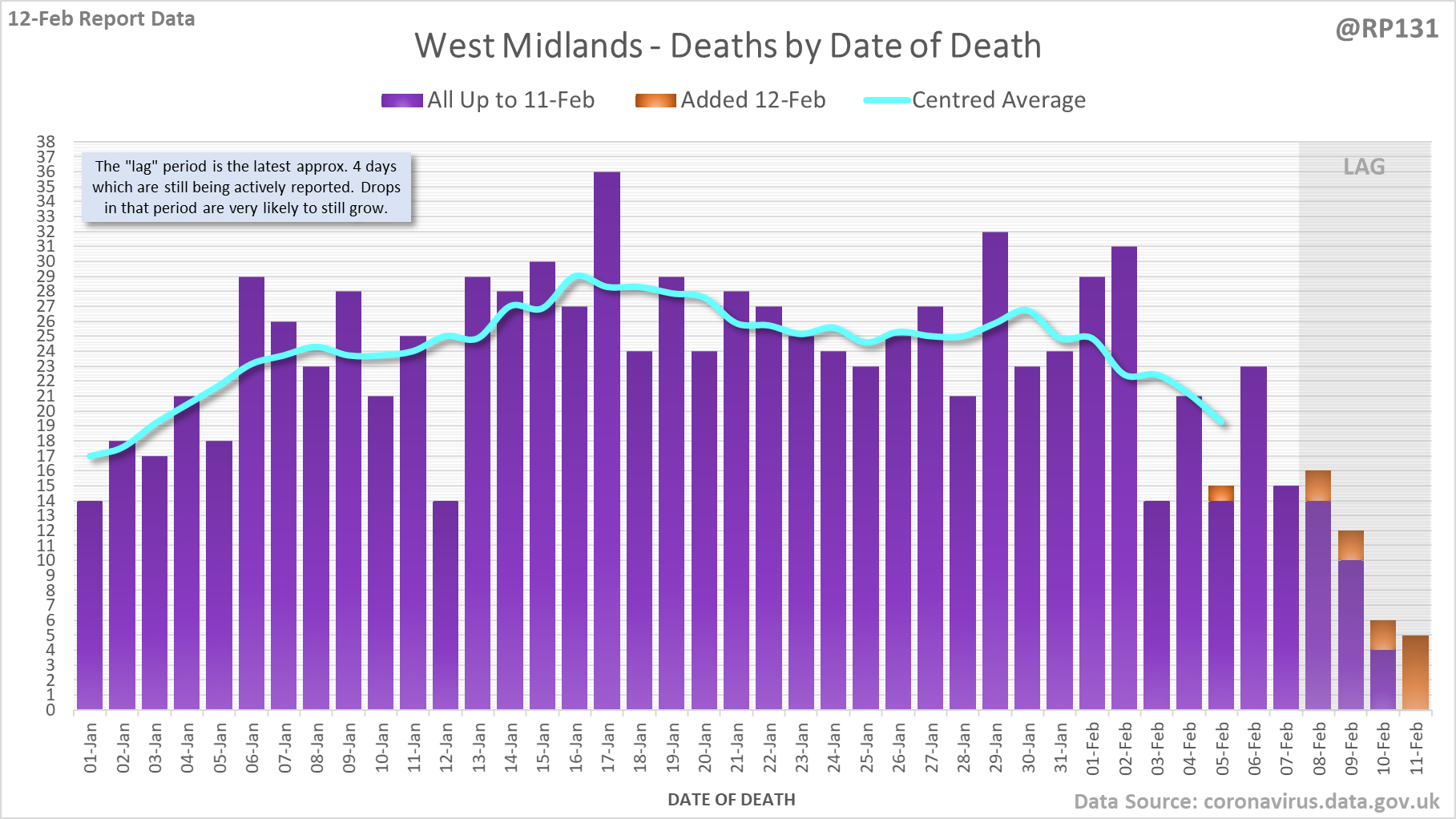 [1/8] 167 new #covid19uk deaths reported today (12-Feb). This brings the rolling average by date of death (allowing 4 days for lag) to 189, equivalent to around 02-Jan (i.e. 34 days ago), a reduction of 66 (26%) in the last week.
