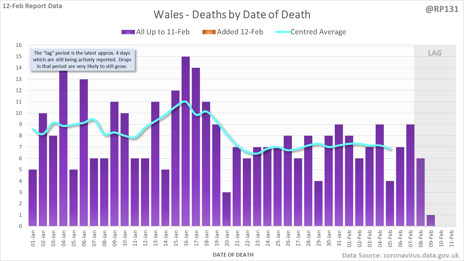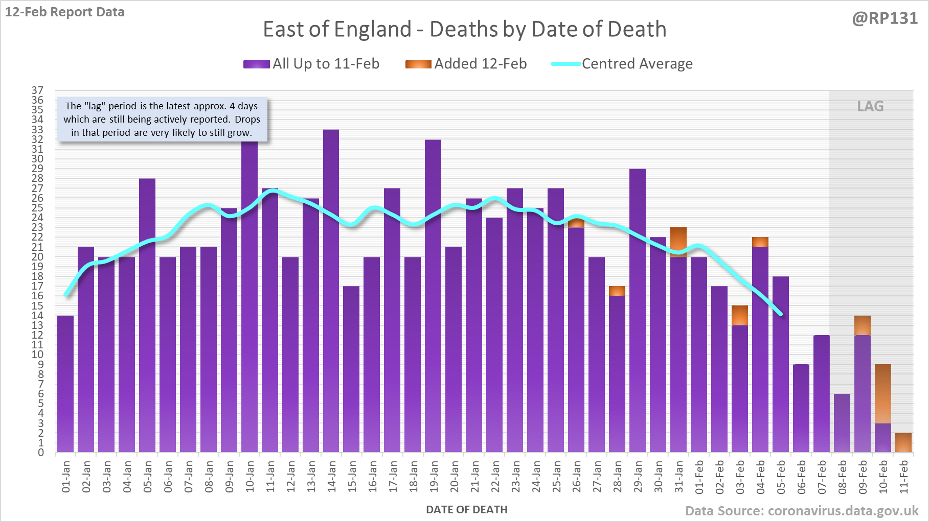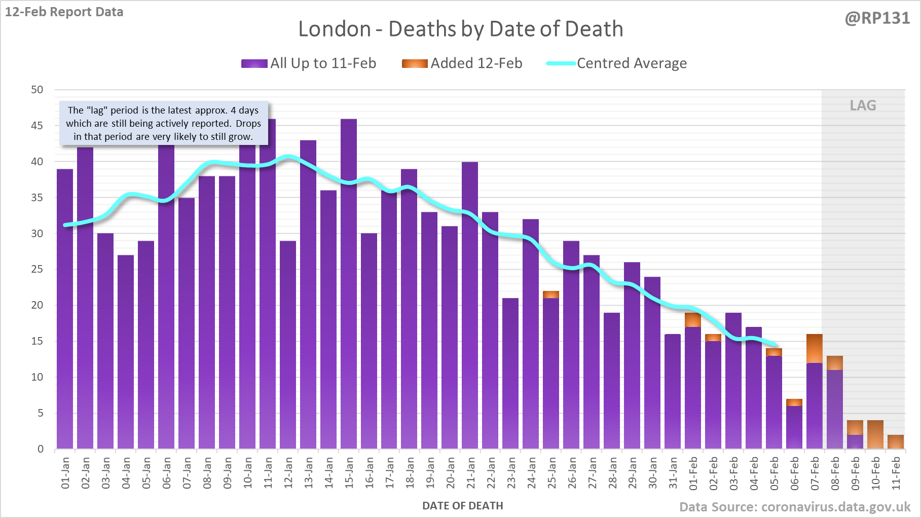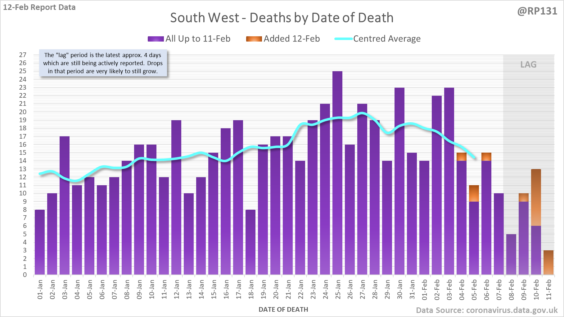 [1/8] 167 new #covid19uk deaths reported today (12-Feb). This brings the rolling average by date of death (allowing 4 days for lag) to 189, equivalent to around 02-Jan (i.e. 34 days ago), a reduction of 66 (26%) in the last week.