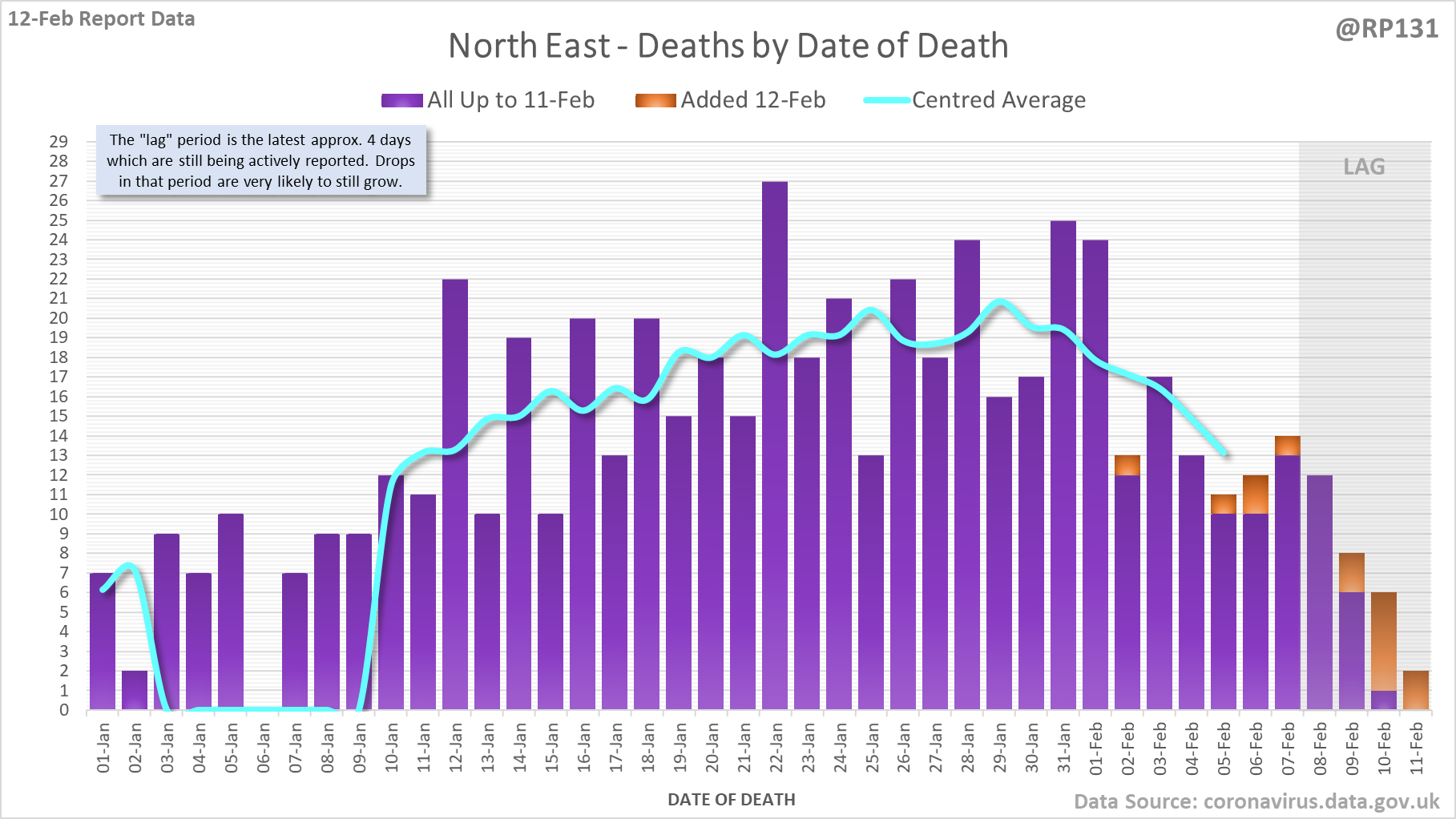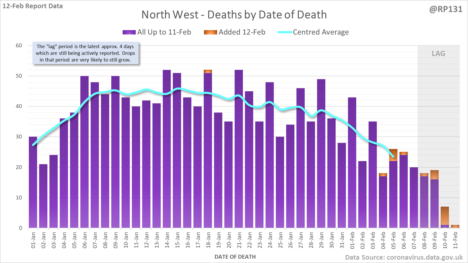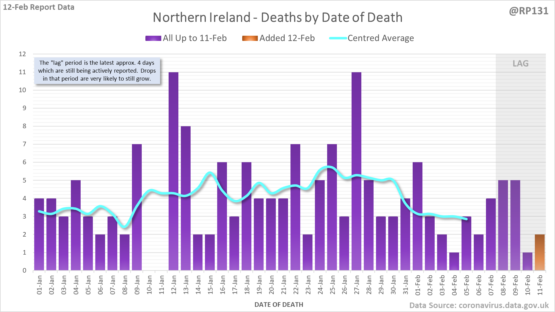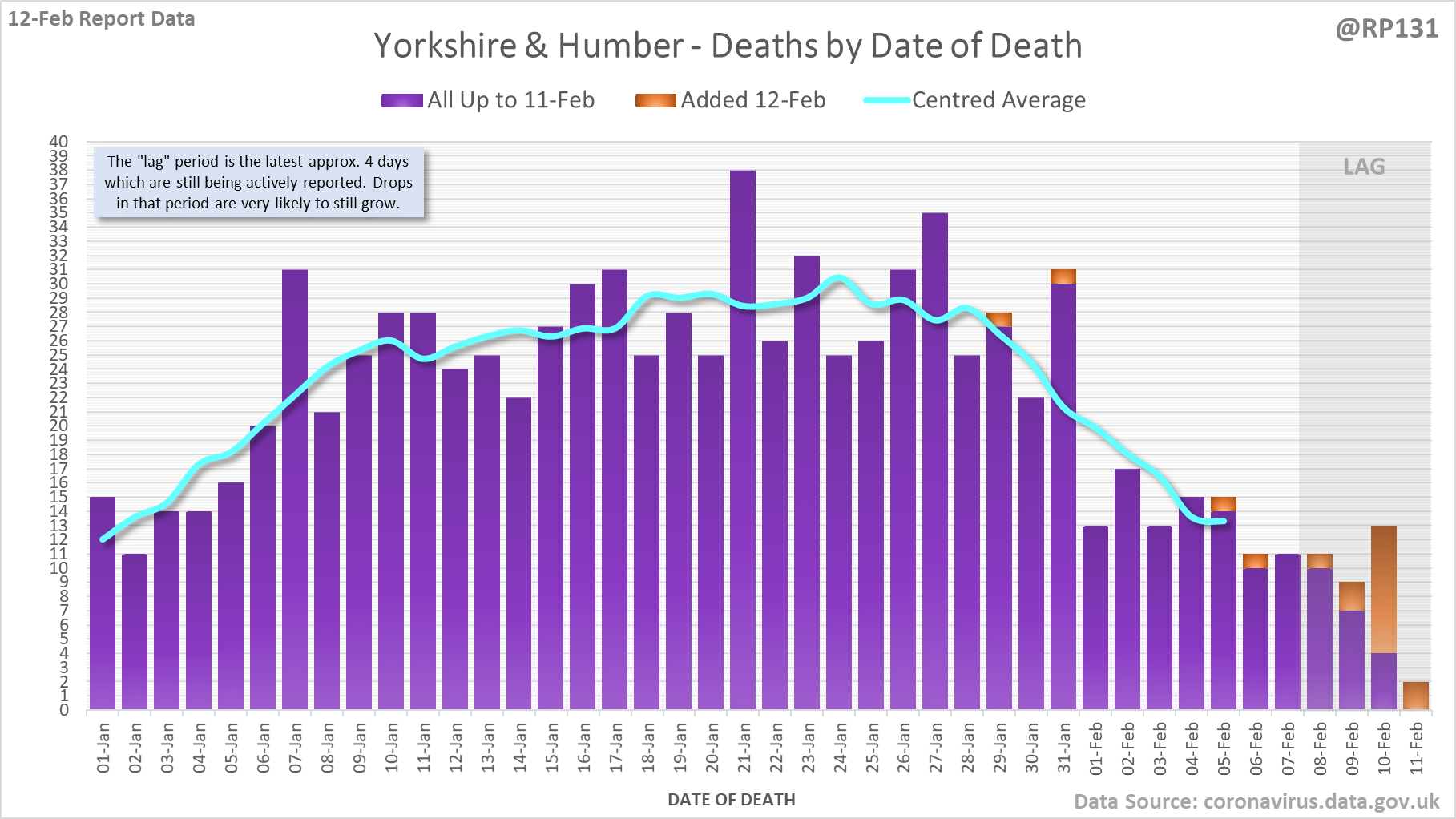 [1/8] 167 new #covid19uk deaths reported today (12-Feb). This brings the rolling average by date of death (allowing 4 days for lag) to 189, equivalent to around 02-Jan (i.e. 34 days ago), a reduction of 66 (26%) in the last week.