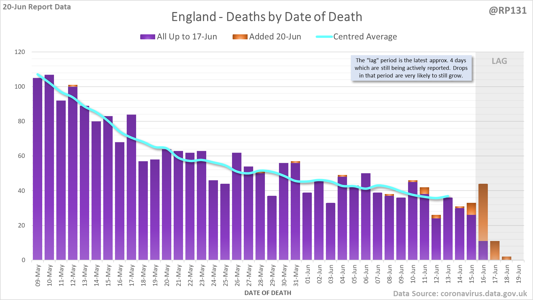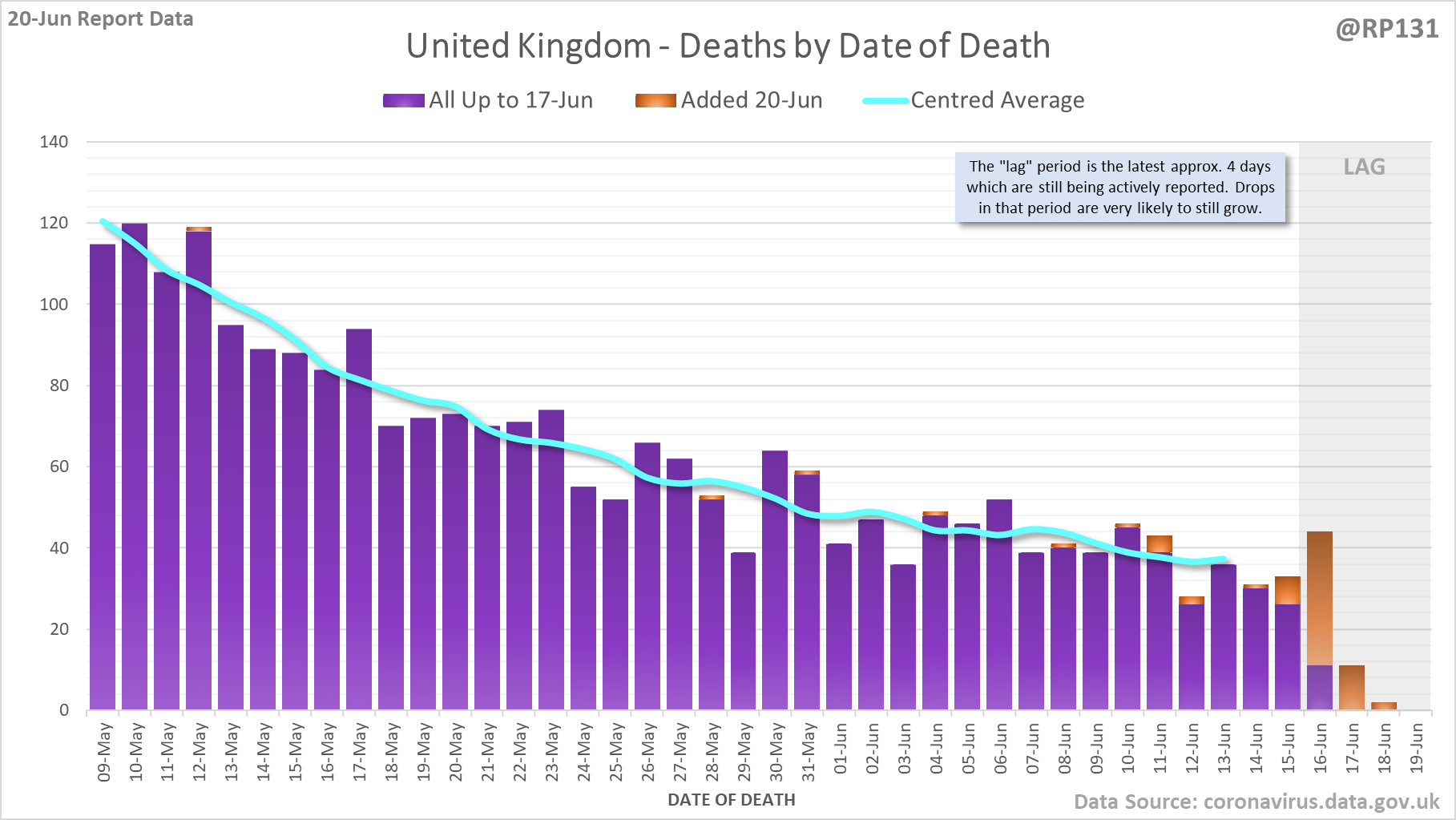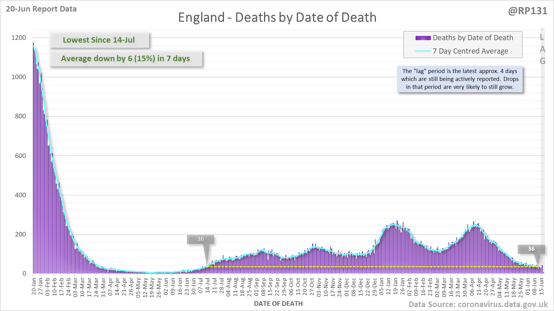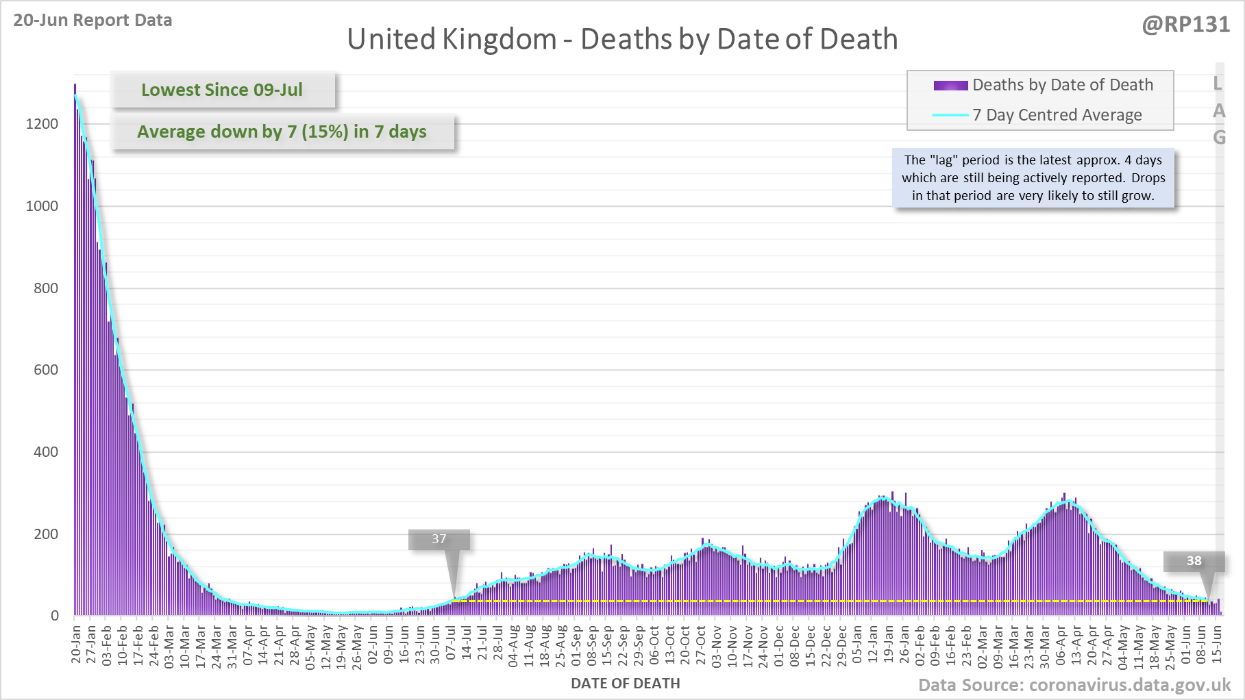 [1/8] 64 new #covid19uk deaths reported today (20-Jun). This brings the rolling average by date of death (allowing 4 days for lag) to 38, equivalent to around 09-Jul (i.e. 338 days ago), a reduction of 7 (15%) in the last week.
