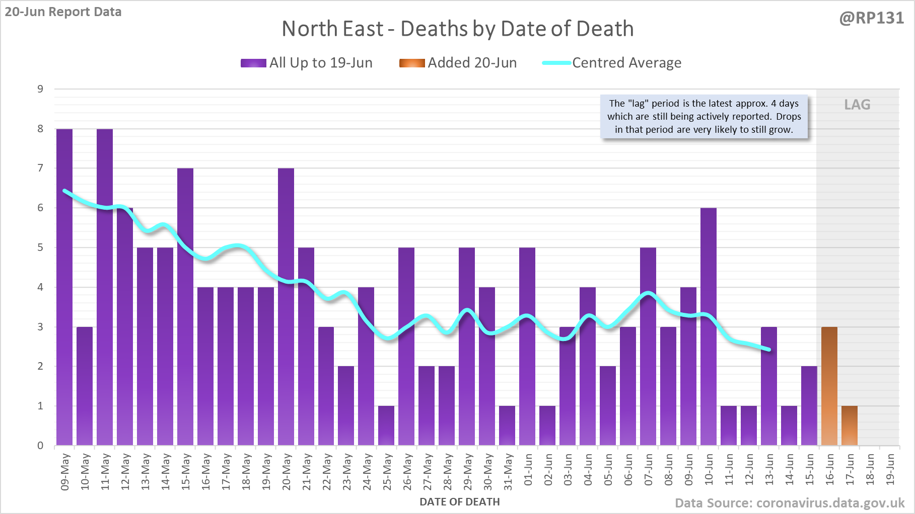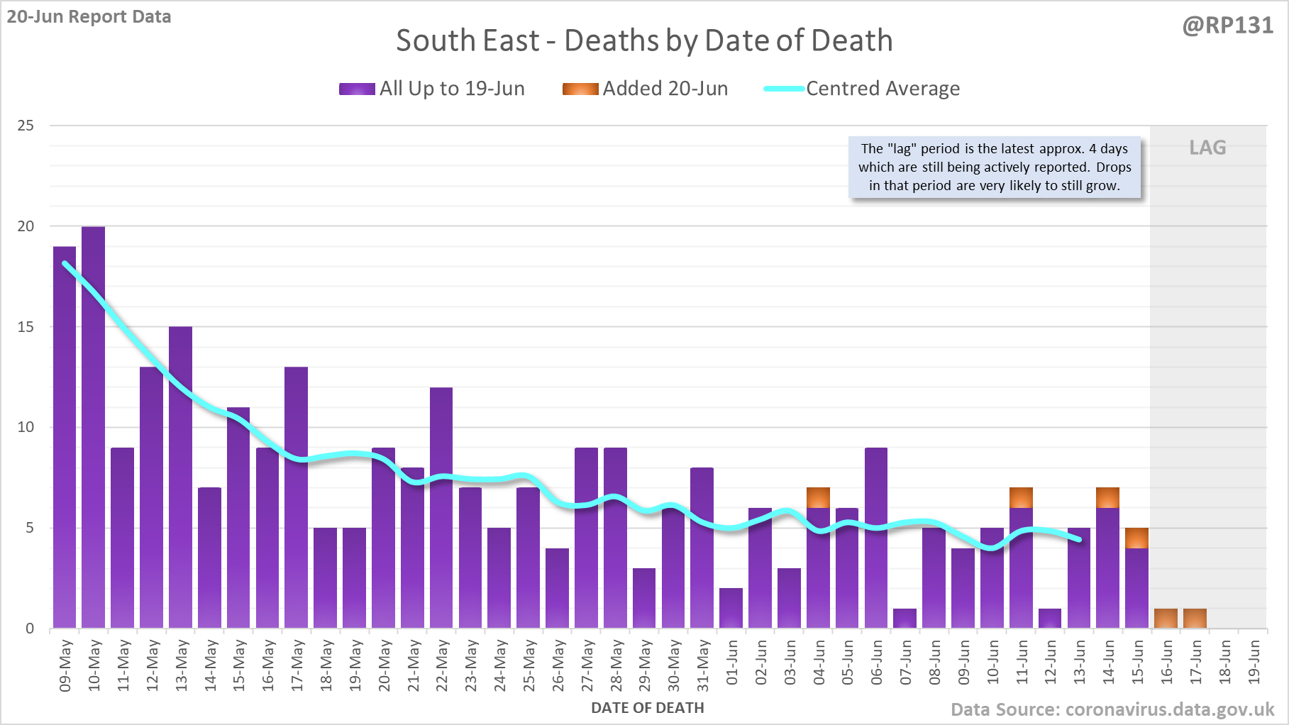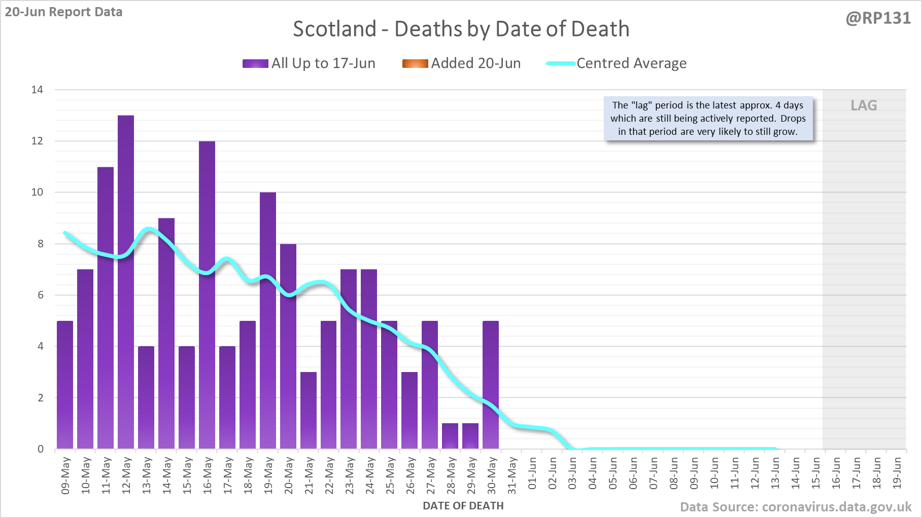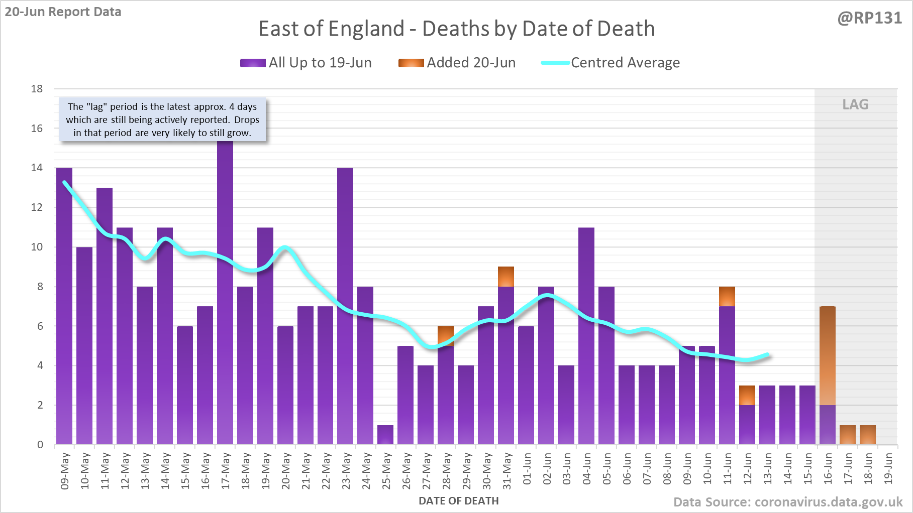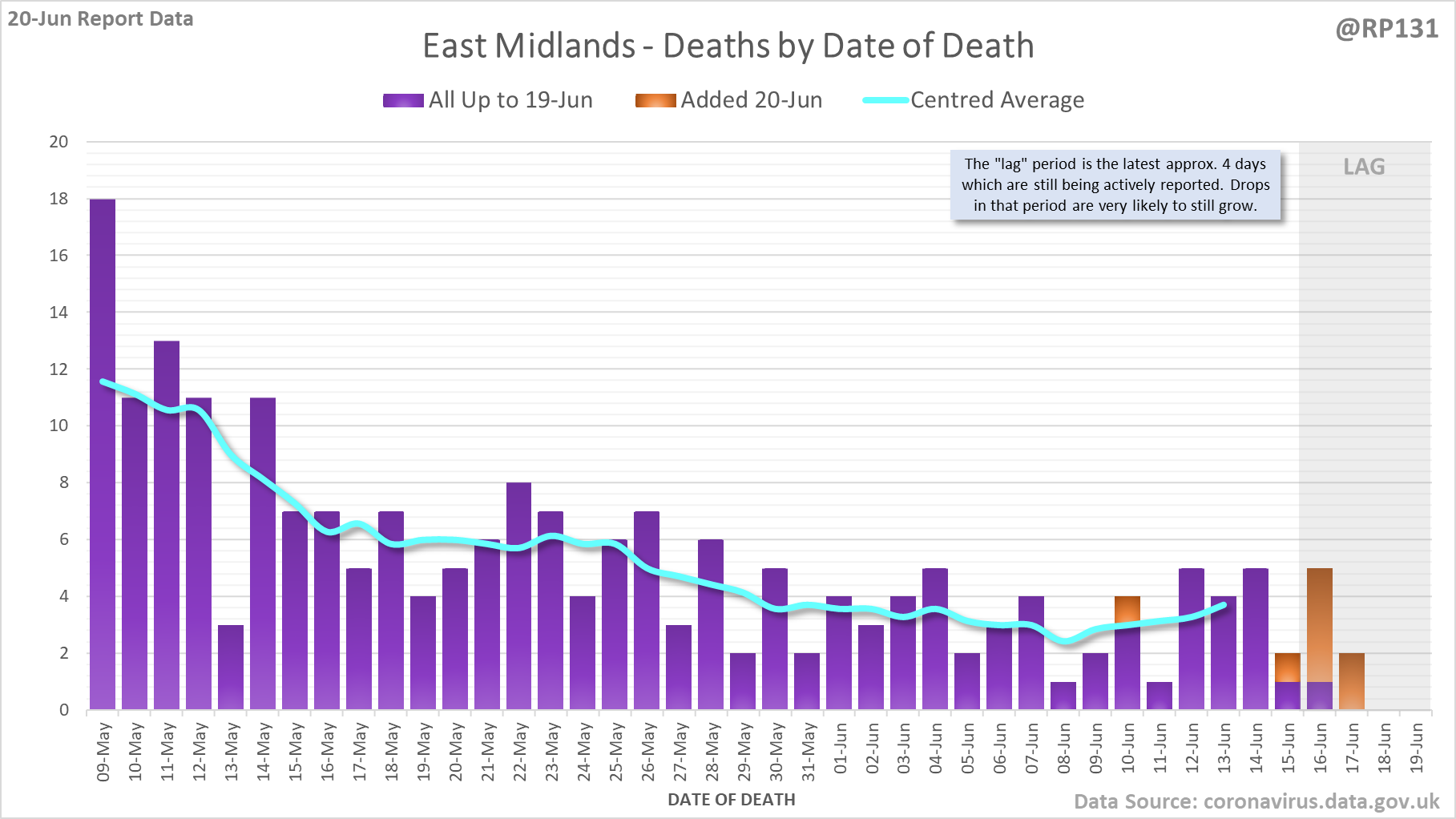 [1/8] 64 new #covid19uk deaths reported today (20-Jun). This brings the rolling average by date of death (allowing 4 days for lag) to 38, equivalent to around 09-Jul (i.e. 338 days ago), a reduction of 7 (15%) in the last week.