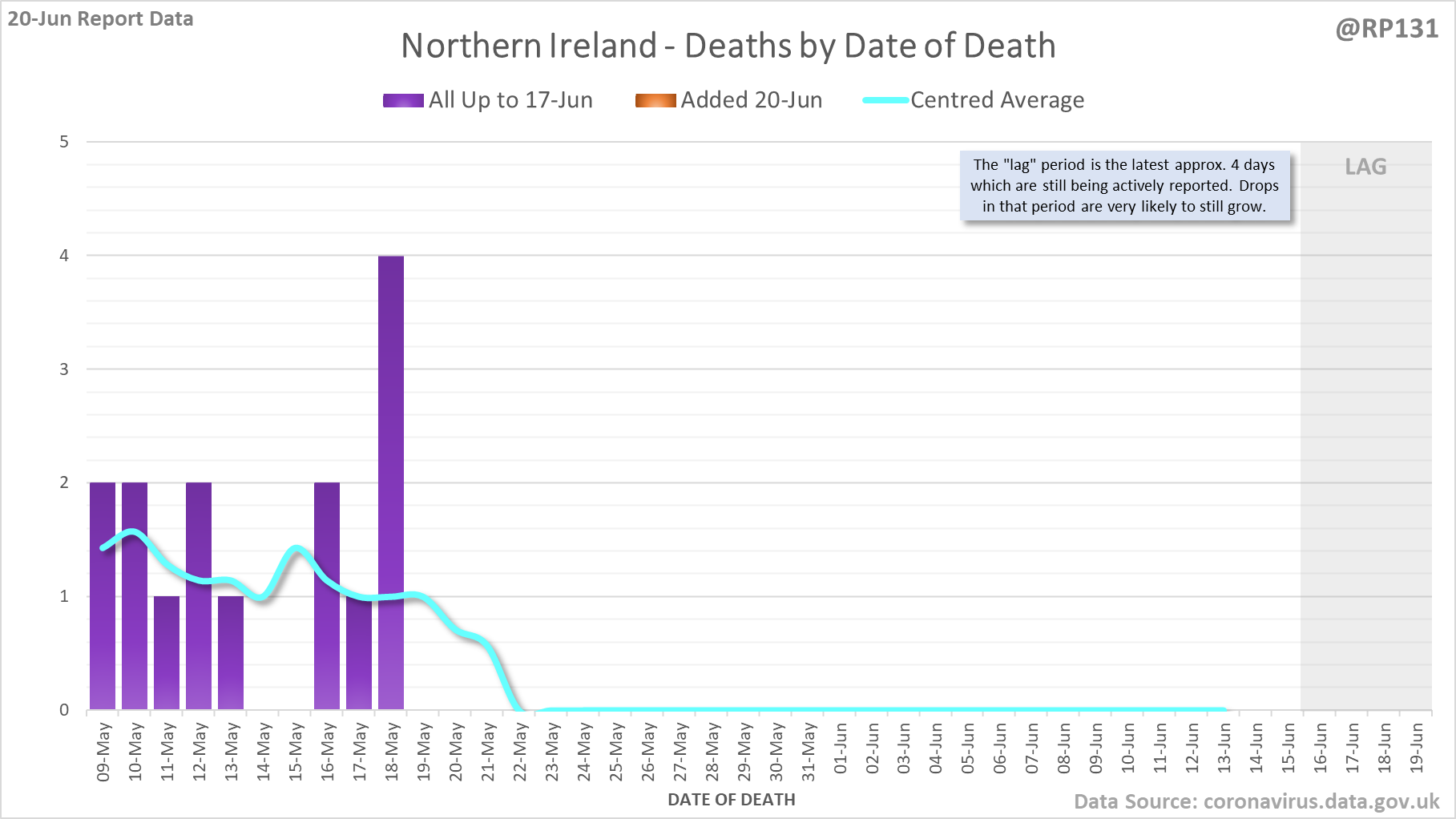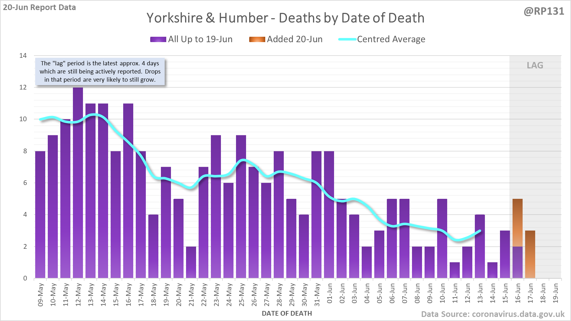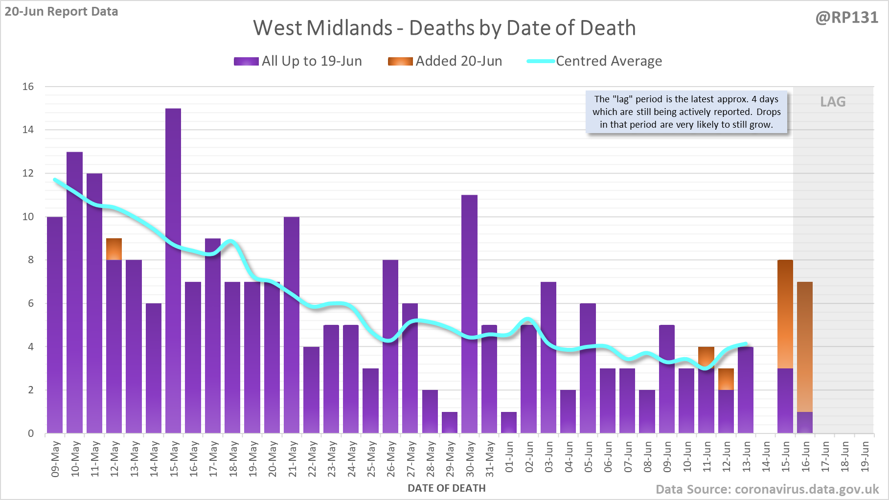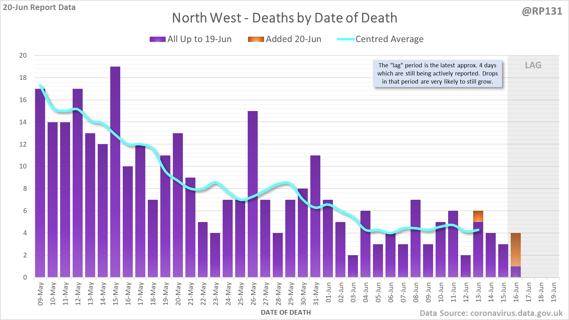 [1/8] 64 new #covid19uk deaths reported today (20-Jun). This brings the rolling average by date of death (allowing 4 days for lag) to 38, equivalent to around 09-Jul (i.e. 338 days ago), a reduction of 7 (15%) in the last week.
