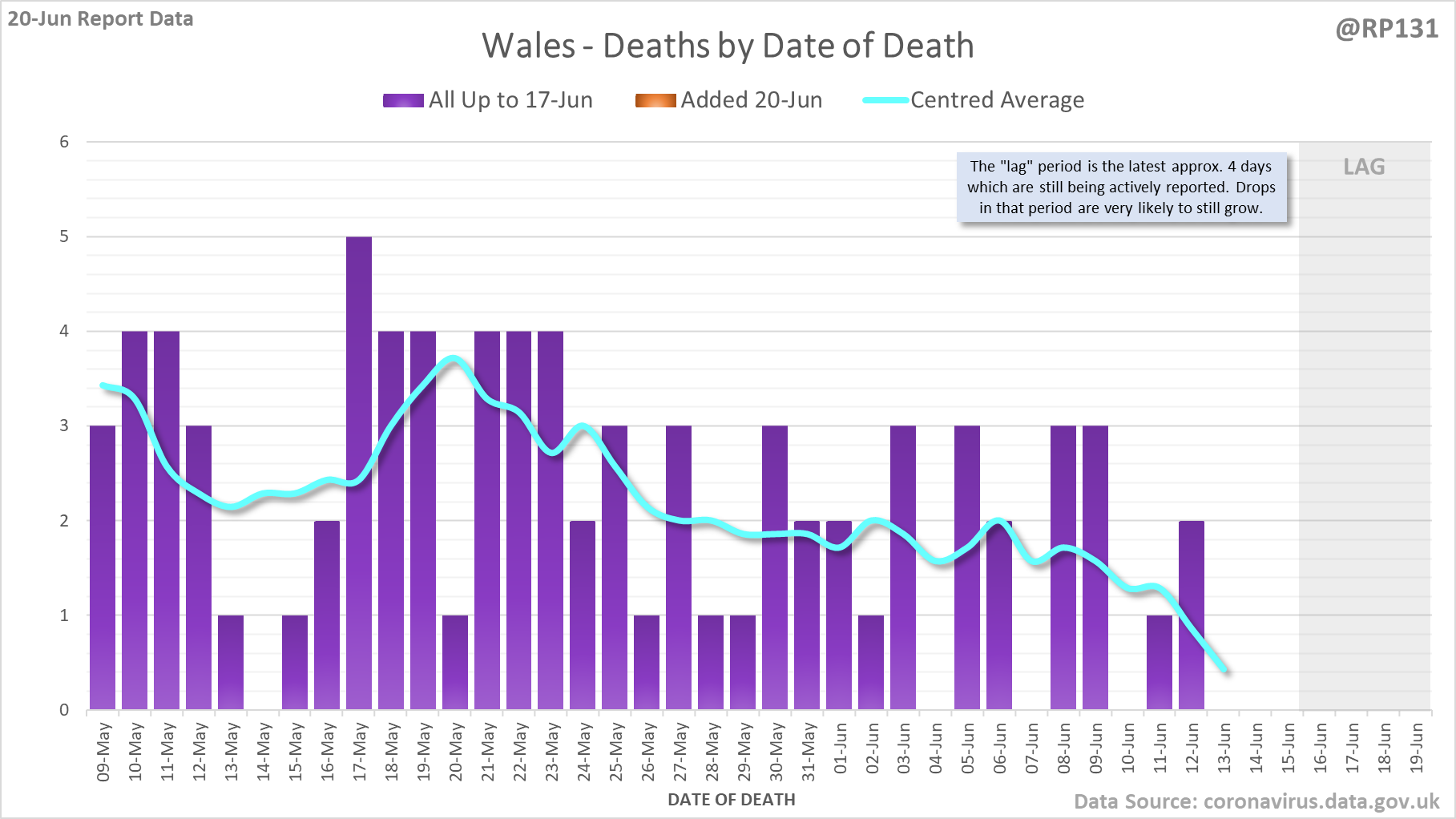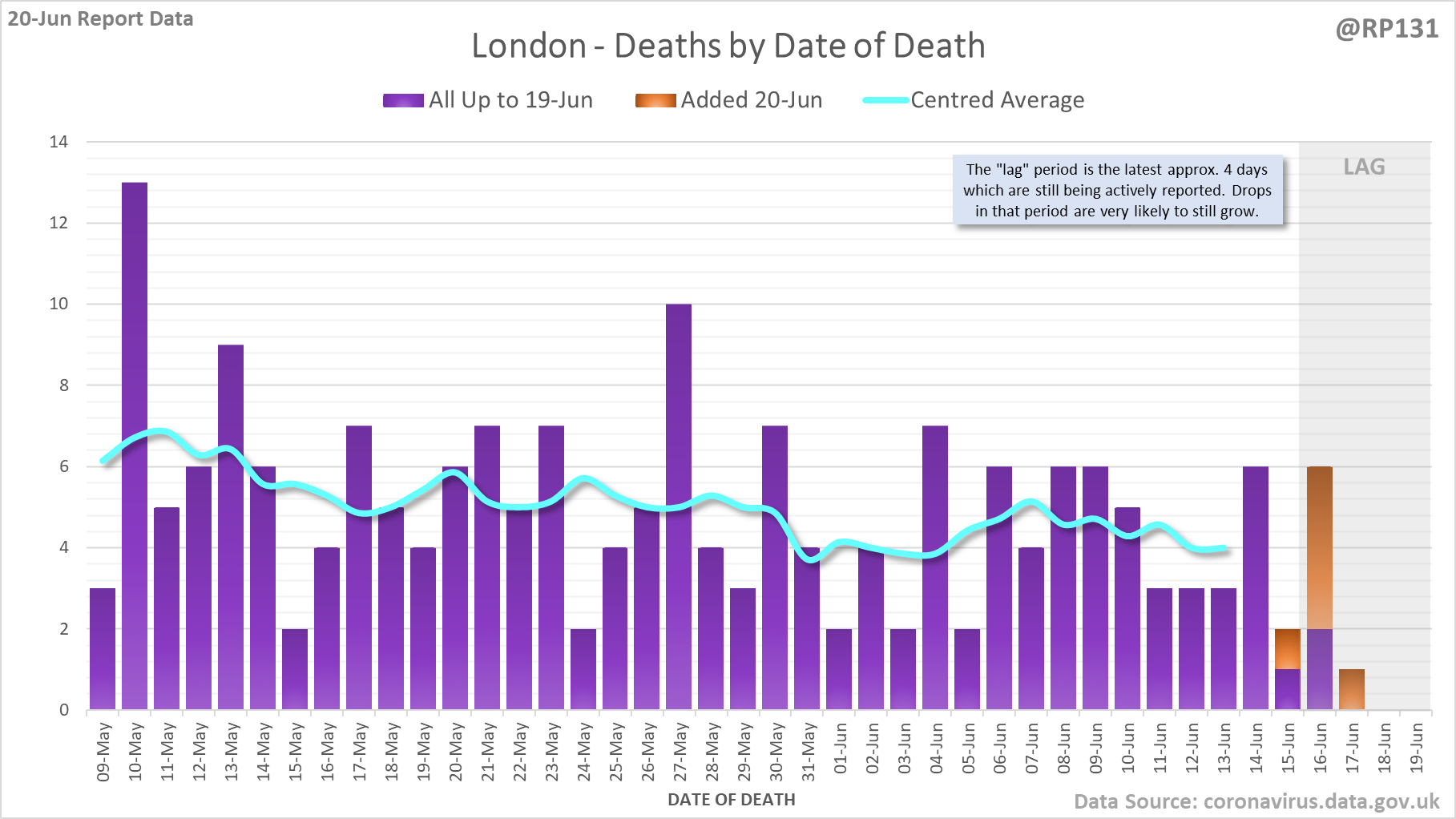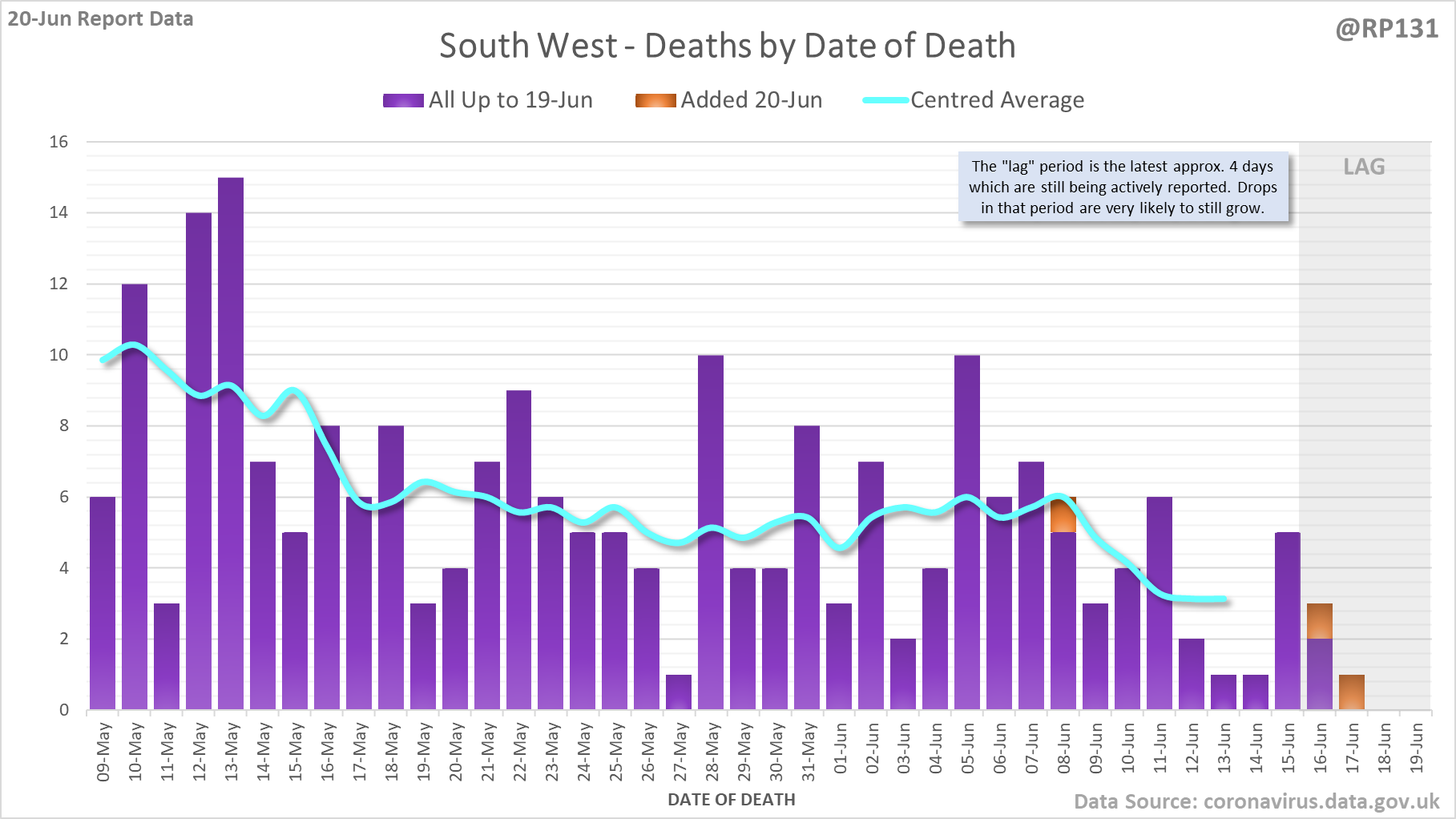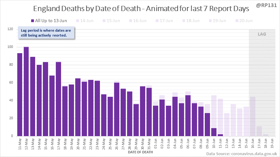 [5/8] Animated chart to show how the #covid19uk deaths by date of death have been contributed to by reports over the last 7 days. Note this just includes England numbers as other nations don't always publish their date-of-death data every day.