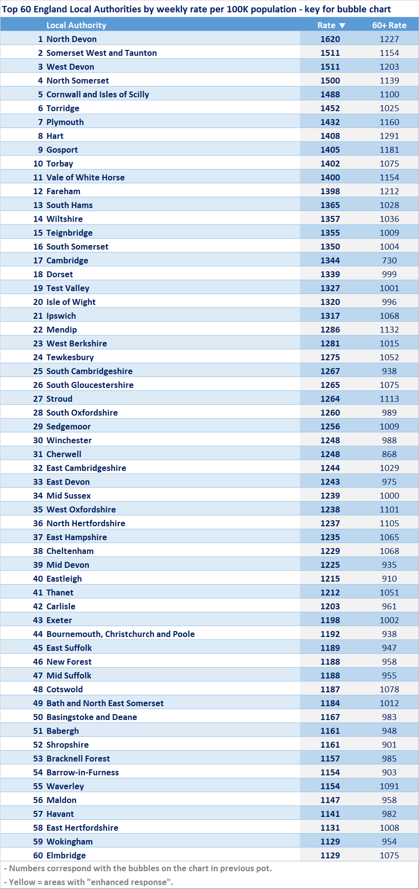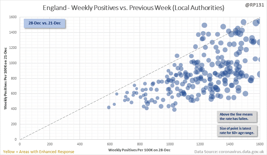 [1/4] Bubble chart thread for England local authorities. This type of chart allows us to quickly visualise week on week changes by seeing if the points are above or below the dotted line. The size of the dot is the relative level of positives in the 60+ age range.