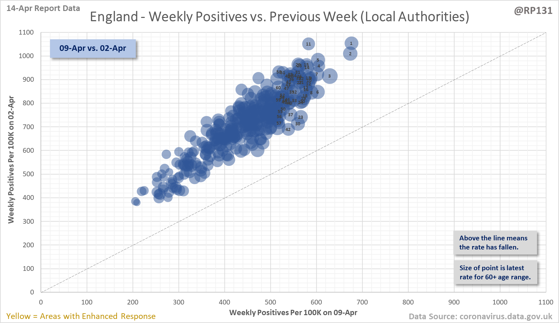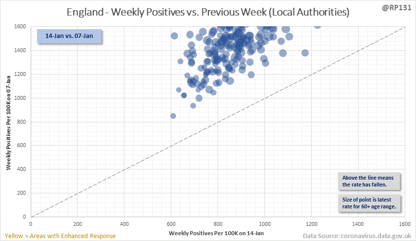 [1/4] Bubble chart thread for England local authorities. This type of chart allows us to quickly visualise week on week changes by seeing if the points are above or below the dotted line. The size of the dot is the relative level of positives in the 60+ age range.