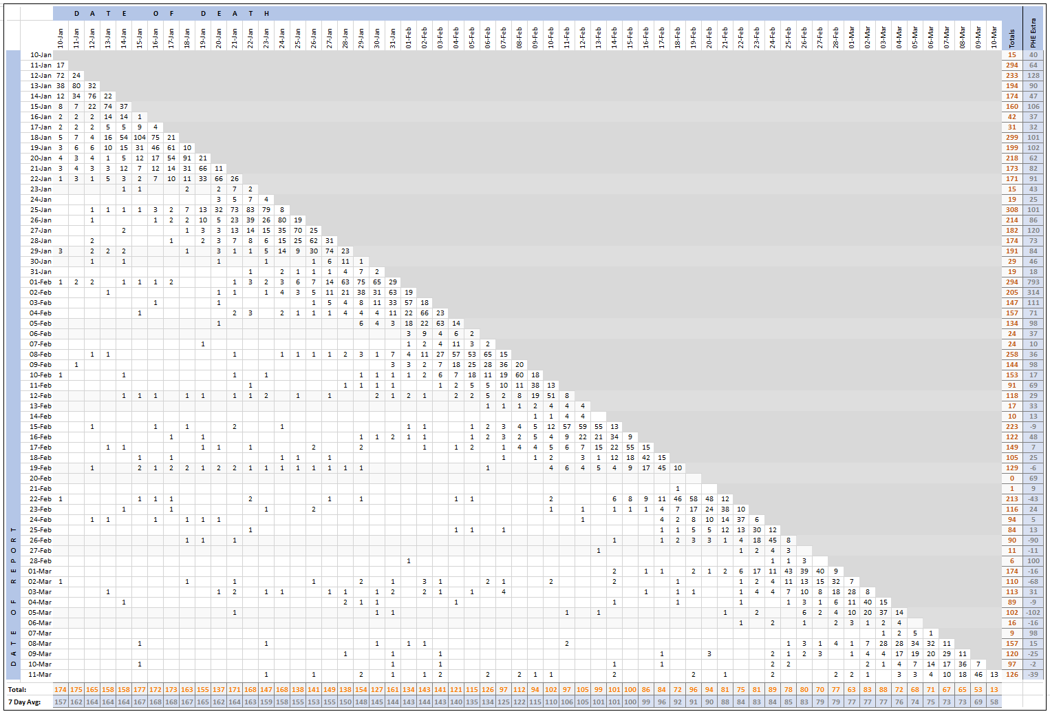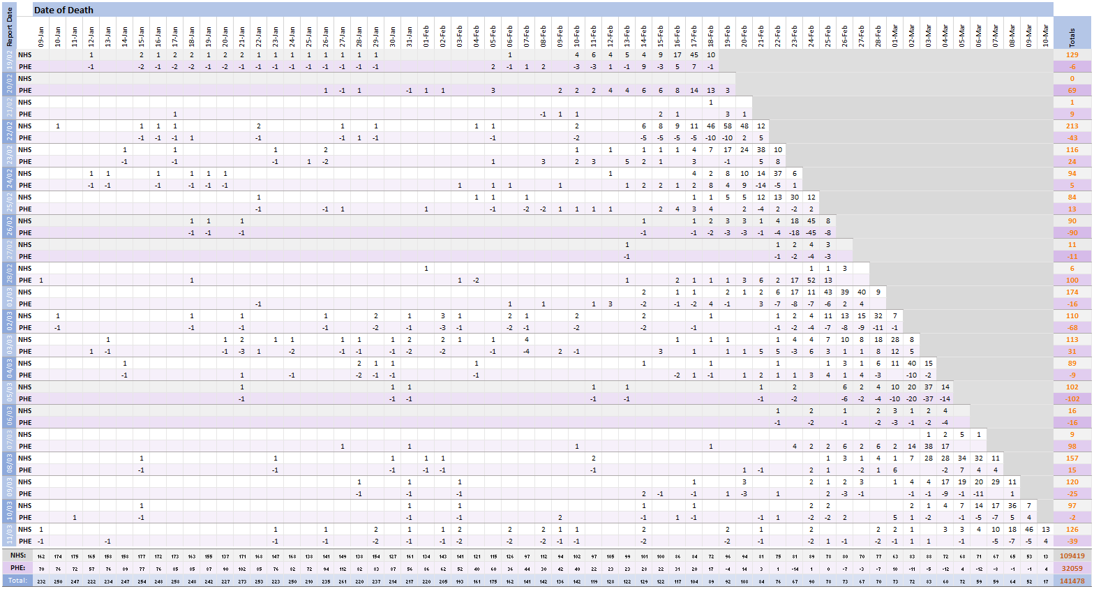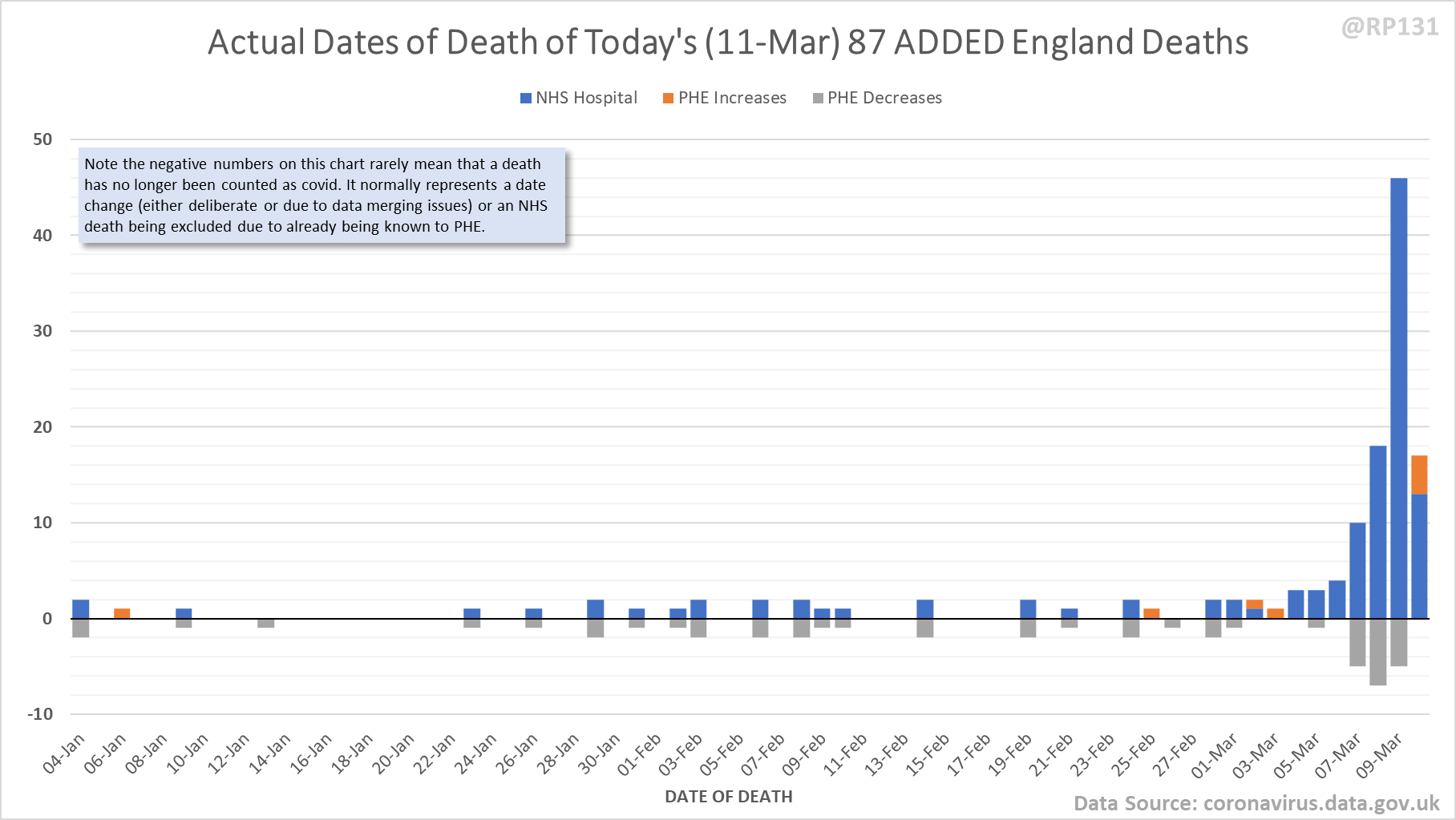 [13/24] Pivot for 11-Mar to show breakdown of both 126 NHS and -39 (net) PHE deaths by date of death. The negatives are a combination of date of death corrections and accounting for NHS deaths that were already known to PHE. Small version for twitter first: