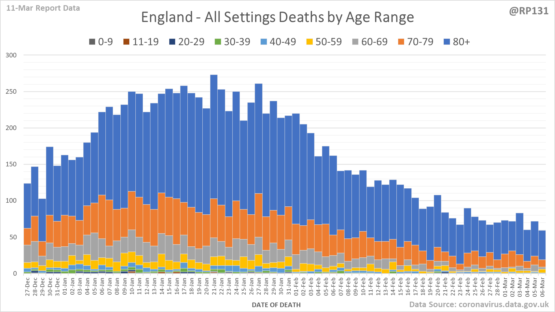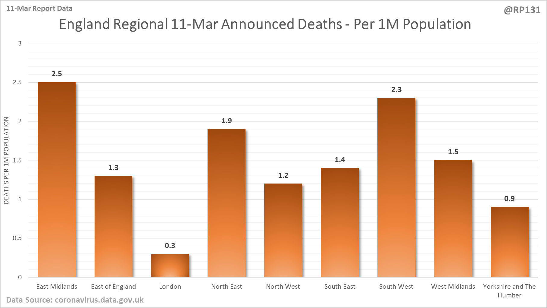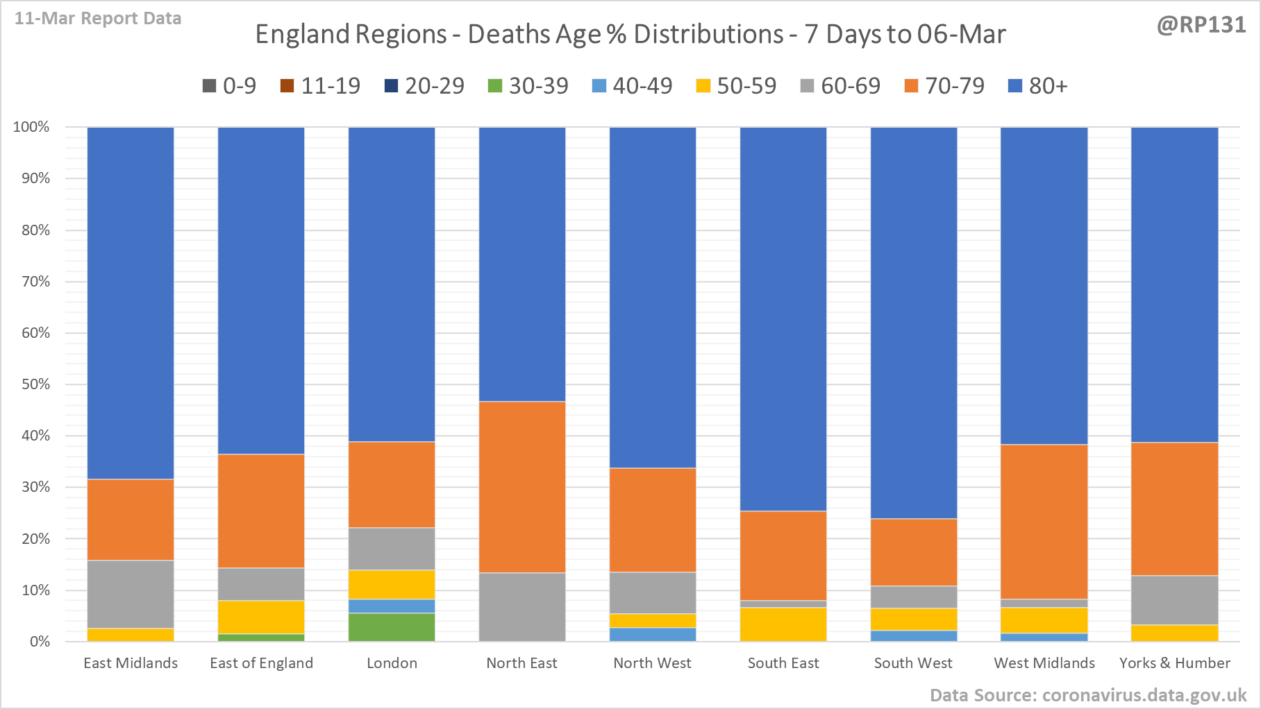 [21/24] Breakdown of today's newly reported England deaths by region. Note that this data (77) doesn't always quite add up to the total England number they announce (87) possibly due to data merging issues. However I still think it's useful to see the general distribution.