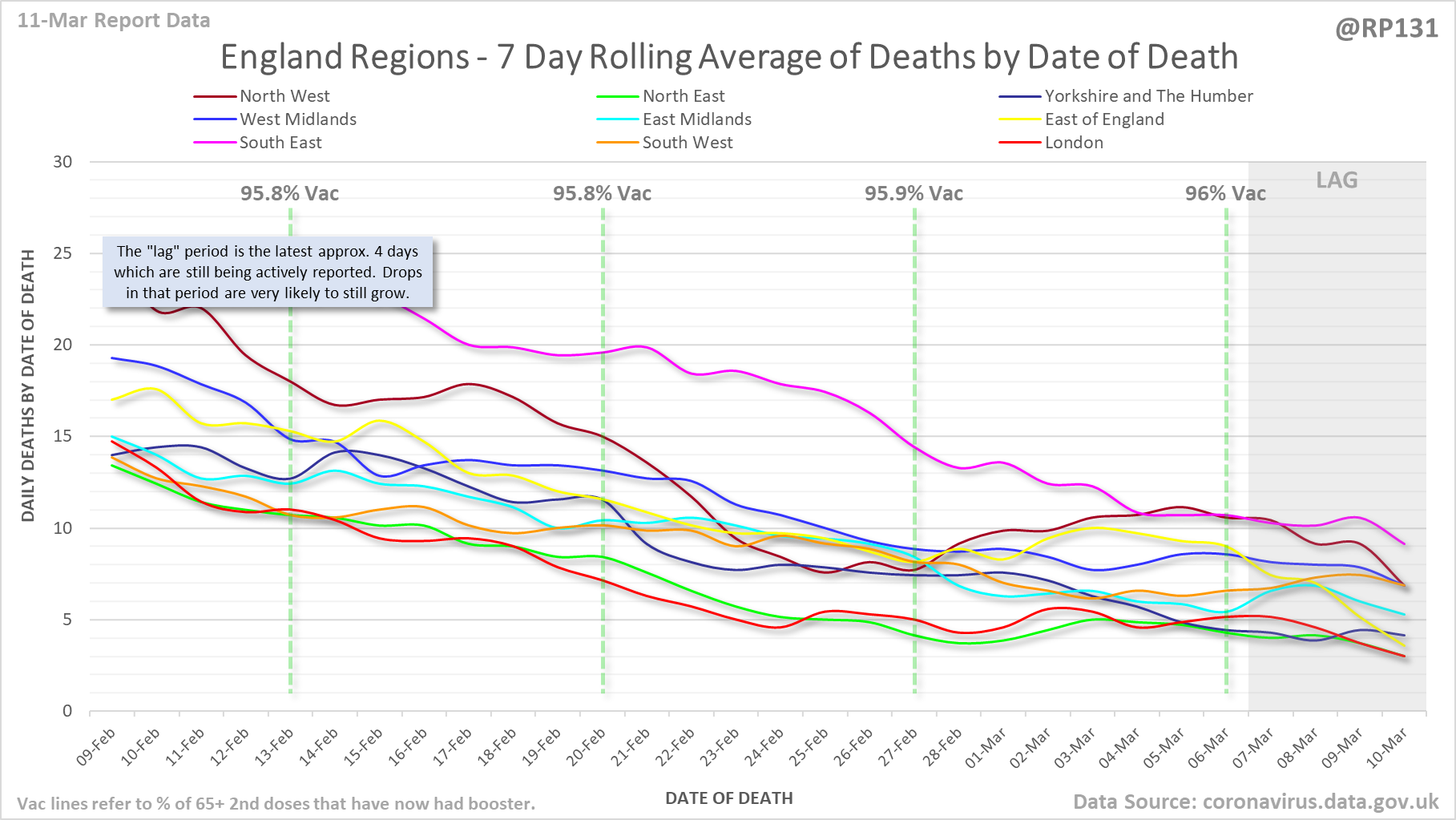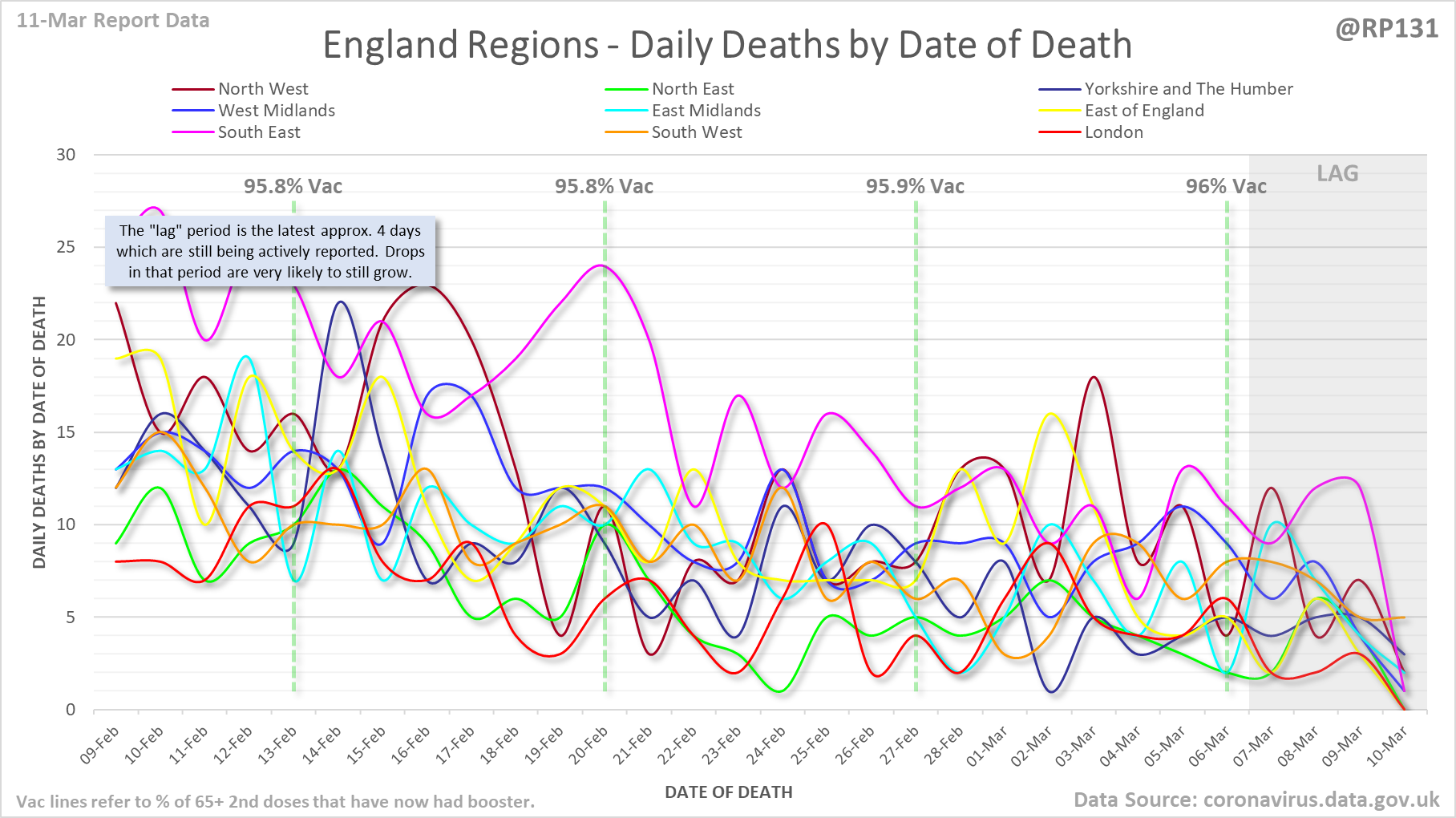 [5/24] Date of Death chart for England regions drawn with 7 day rolling averages.