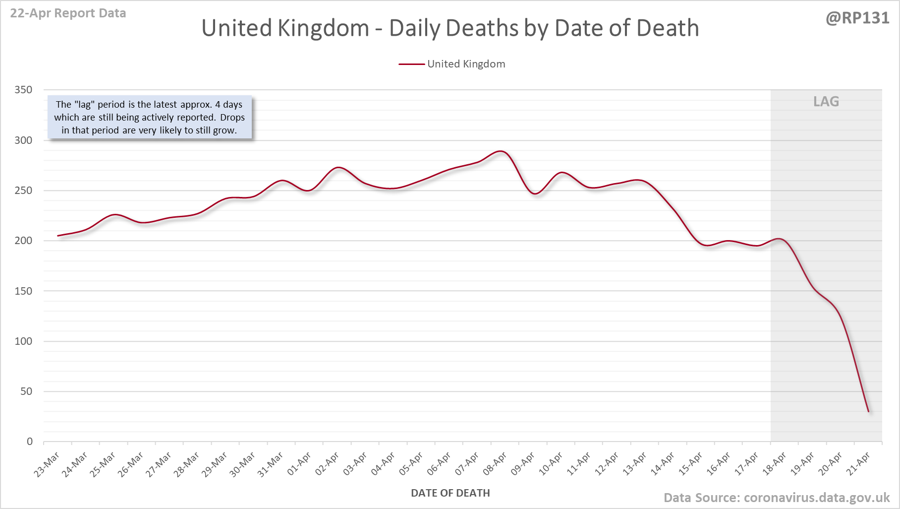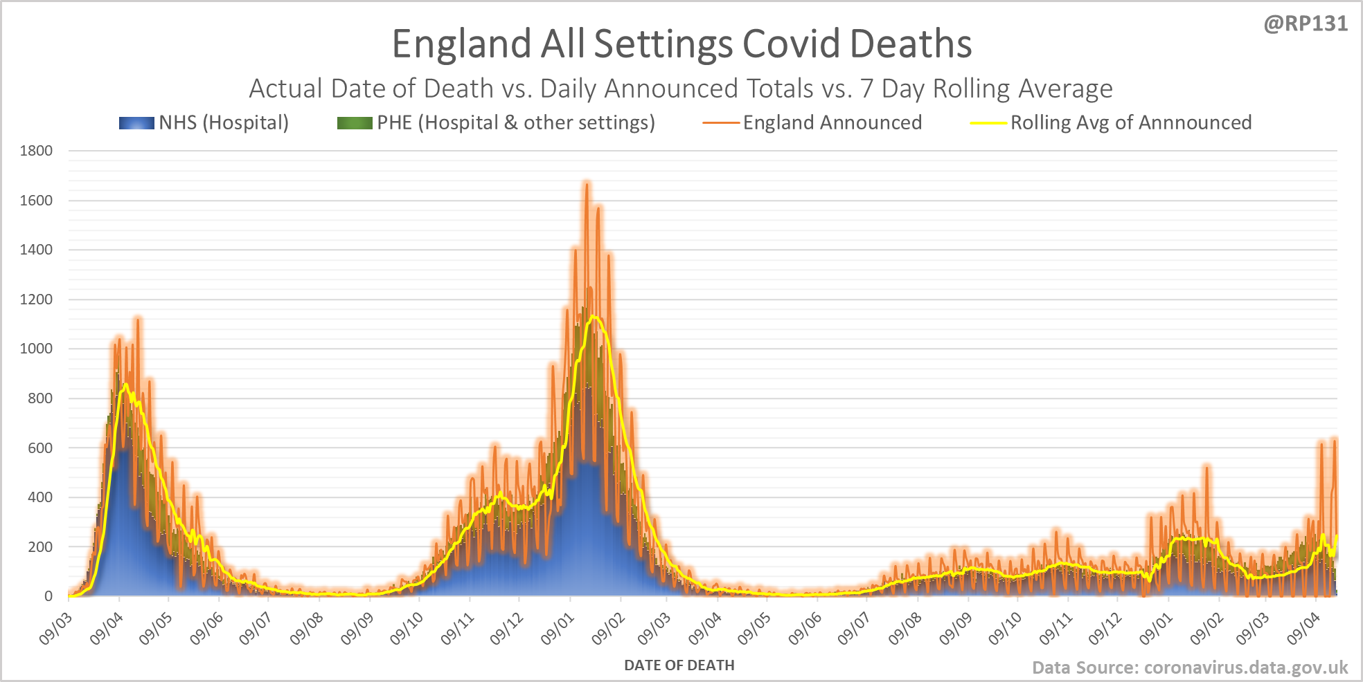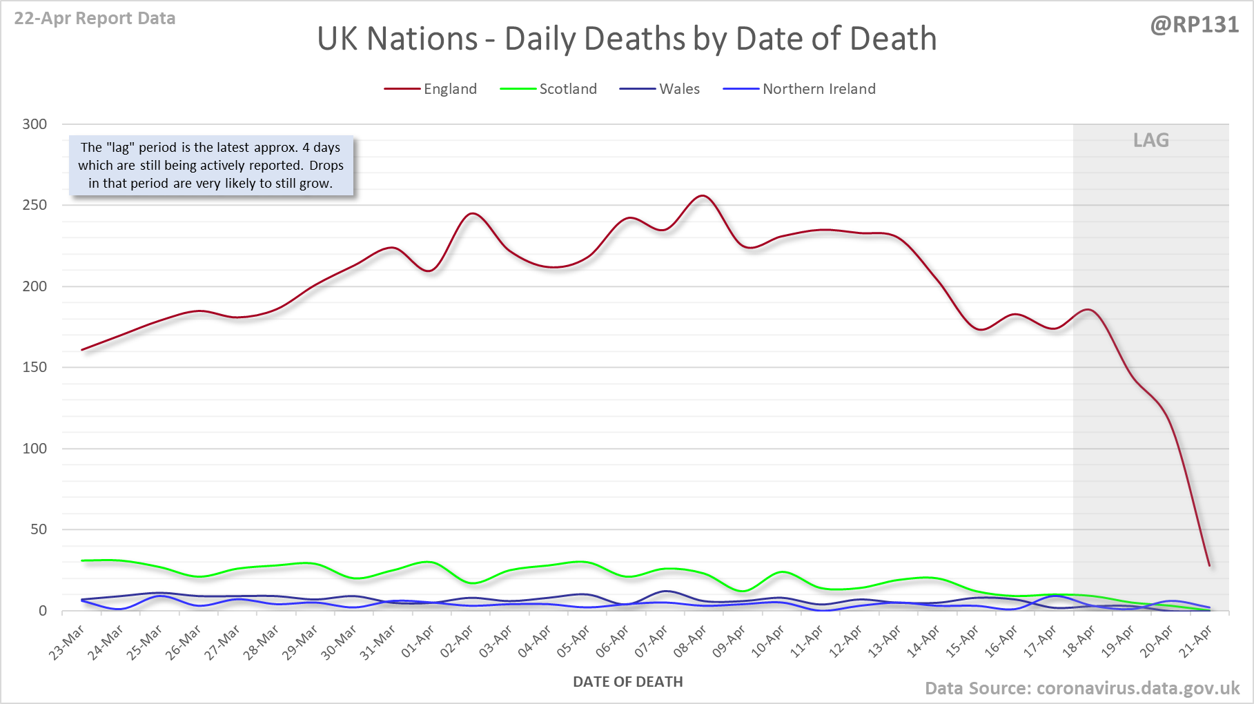 [11/24] England date-of-death vs. announcement chart. Note that the numbers drop at the end as data is still being actively reported for those dates.