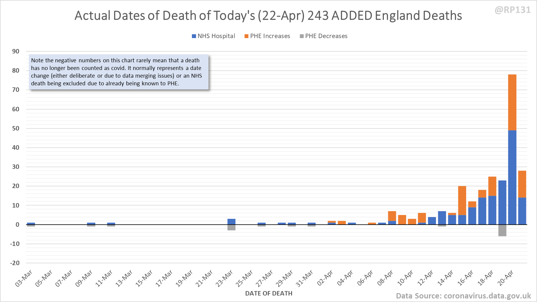 [13/24] Pivot for 22-Apr to show breakdown of both 161 NHS and 82 (net) PHE deaths by date of death. The negatives are a combination of date of death corrections and accounting for NHS deaths that were already known to PHE. Small version for twitter first:
