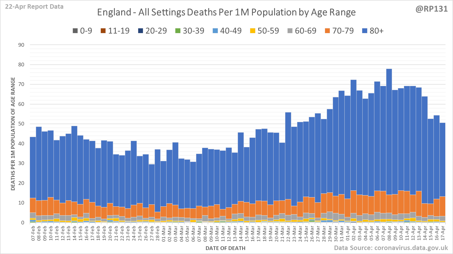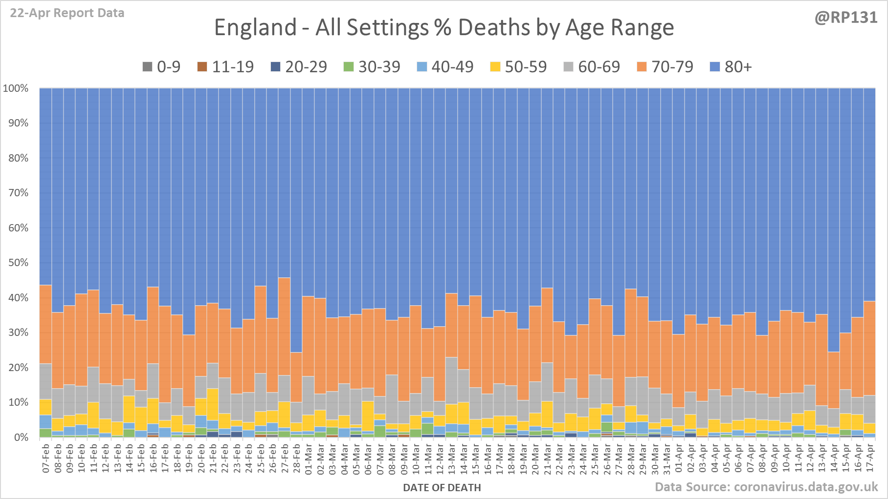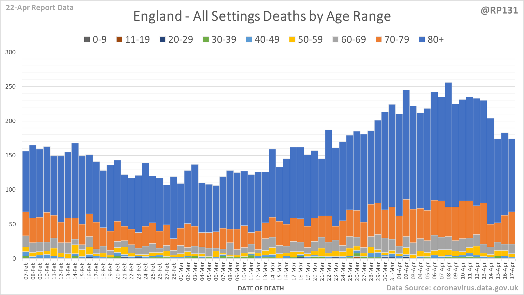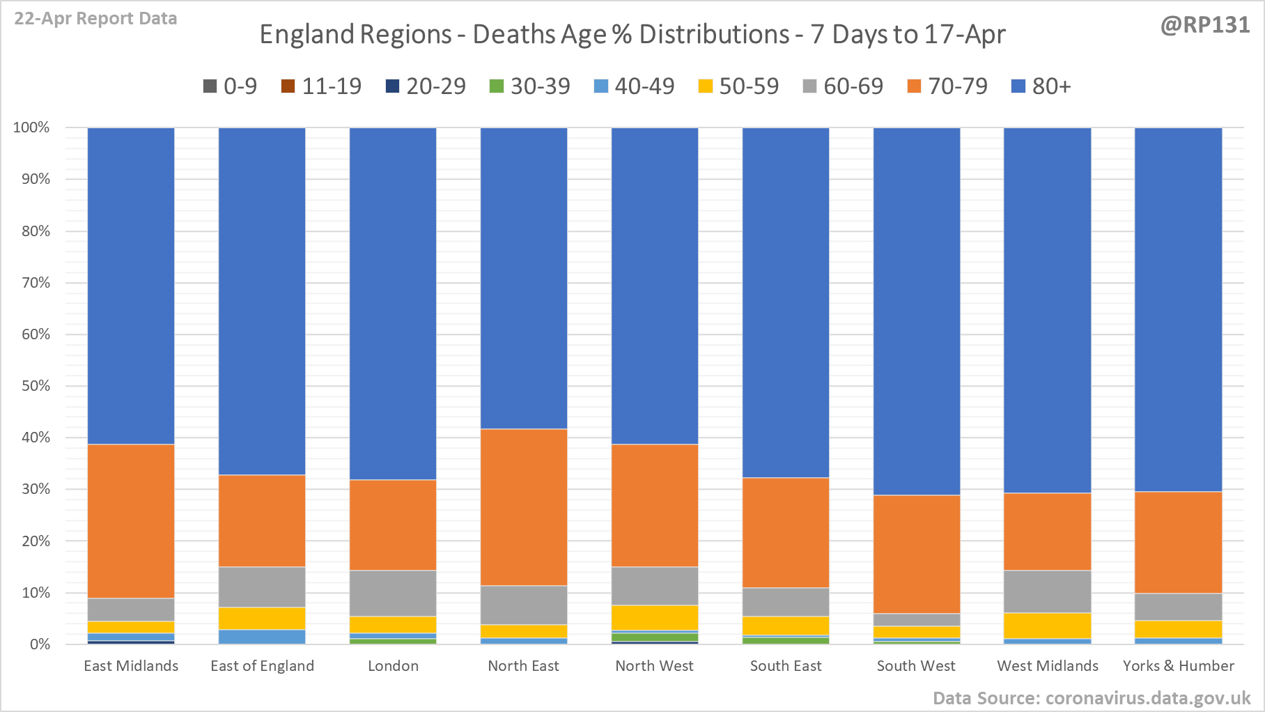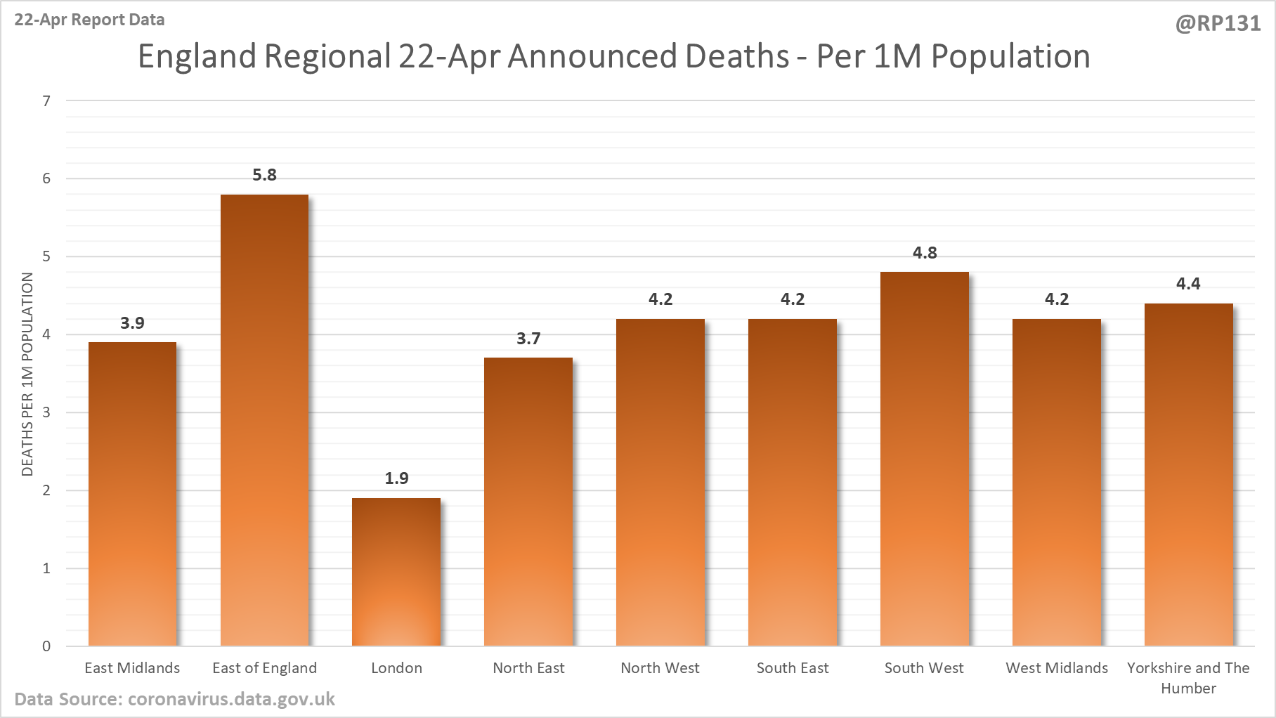 [21/24] Breakdown of today's newly reported England deaths by region. Note that this data (228) doesn't always quite add up to the total England number they announce (243) possibly due to data merging issues. However I still think it's useful to see the general distribution.
